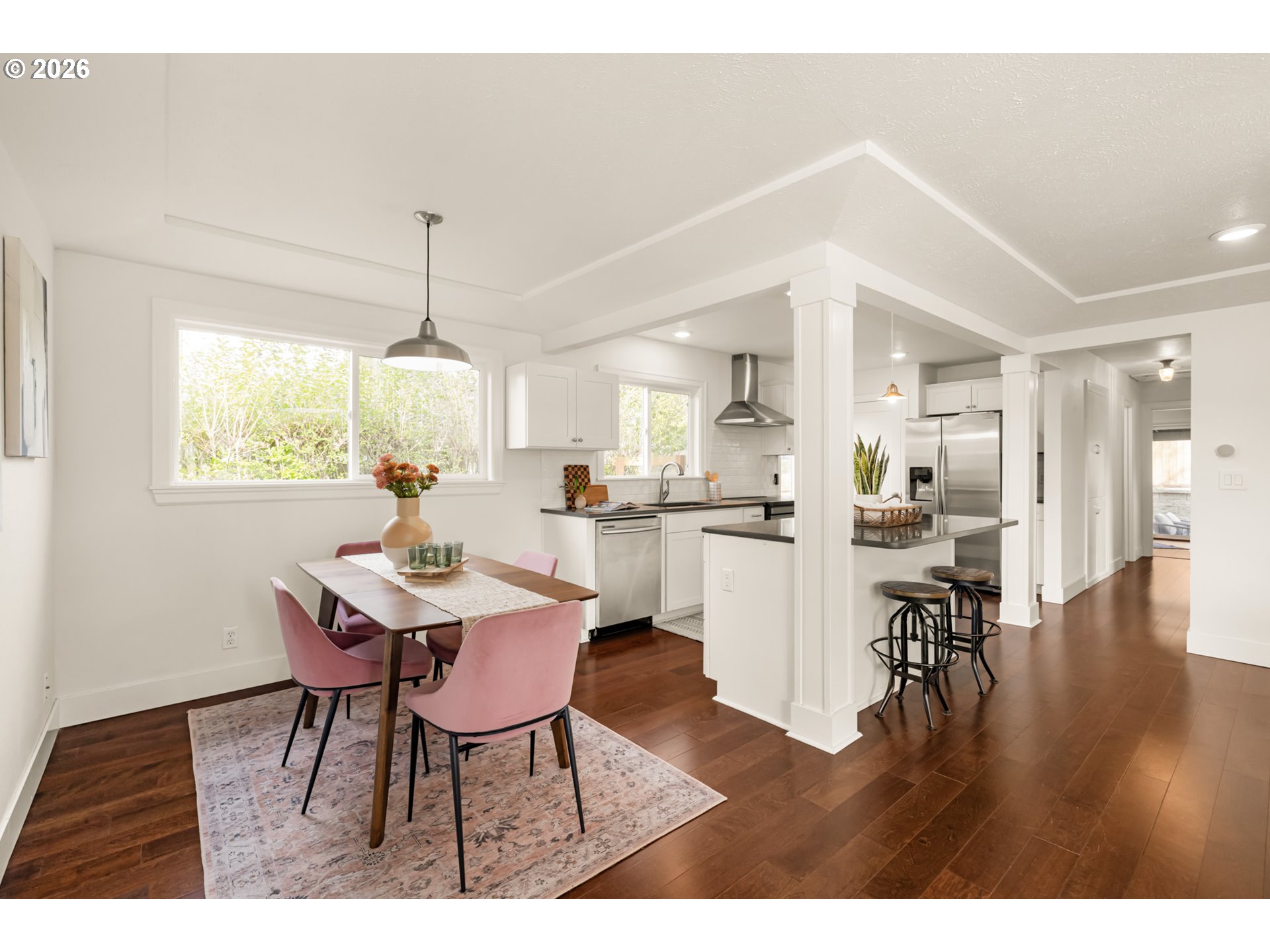 Come fall in love with this classic Creston ranch! Perched above the street on a sunny corner lot, this charming home is packed with updates and totally move-in ready. Soak up the sunlight all day long! Large southwest facing corner windows are the star of the bright and cheerful living room. Built-in storage benches turn up the charm - there’s even a wood burning fireplace to take the edge off cold winter nights. Whip up meals in the remodeled open kitchen! There’s a large island with pendant lights, solid quartz countertops and bar seating, stainless steel appliances including a newer induction range - not to mention a great layout. Three bedrooms on the main, one with a sliding door to a private covered patio and freshly landscaped back yard with irrigation and a new retaining wall. There’s a spacious family room downstairs - the perfect spot to get cozy on movie or game night - plus another bedroom and full bath. Have ADU dreams? The basement could be a great income-producing rental. Tons of recent updates including AC, landscaping and retaining wall (all 2023). Location, location, location! Walk to Keeper Coffee, the brand new Pipsqueak Bagels brick & mortar, COFFEE BEER, PDX Ramen, Cafe Rowan, Creston Park, Trader Joe’s, Walgreens and more! Just a hop, skip and a jump to all the food and fun in Woodstock, Richmond and the rest of inner Southeast. Welcome to the neighborhood! [Home Energy Score = 8. HES Report at https://rpt.greenbuildingregistry.com/hes/OR10083247]