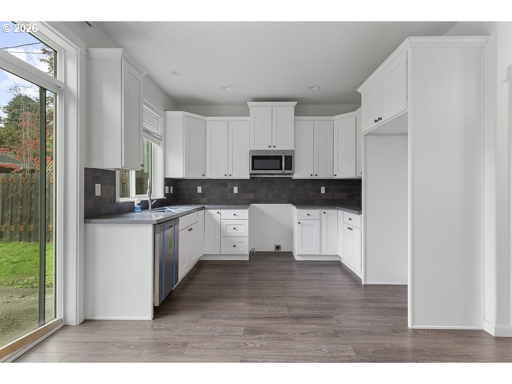 This like-new 3-bedroom, 2.5-bath end-unit townhome features bright open living spaces with neutral paint, stylish dark laminate flooring, and abundant natural light from large windows and sliding glass doors. The gourmet kitchen includes beautiful quartz countertops, stainless steel appliances, tile backsplash, and ample cabinetry. The dining area opens to the huge fully fenced backyard. Upstairs are three spacious bedrooms including a primary suite. Both full baths feature contemporary finishes. Additional features include mini-split, attached garage, and low-maintenance design. Move-in ready.