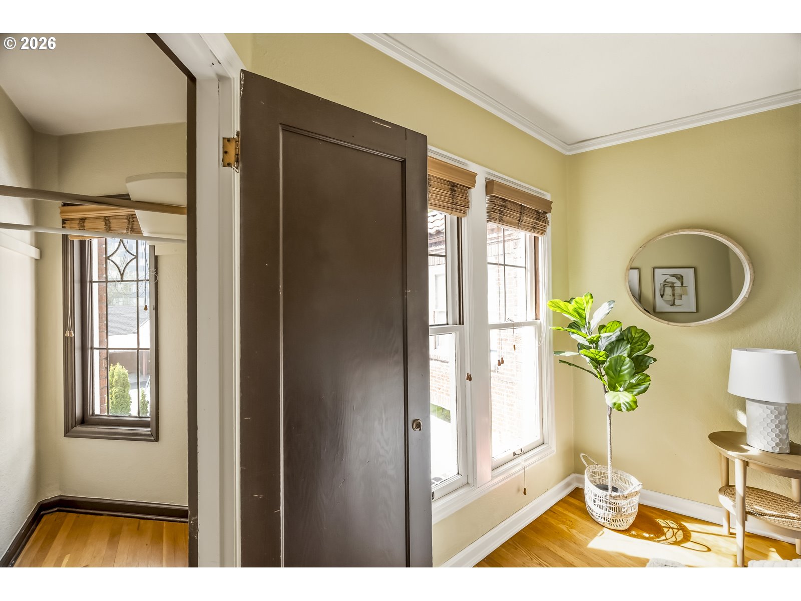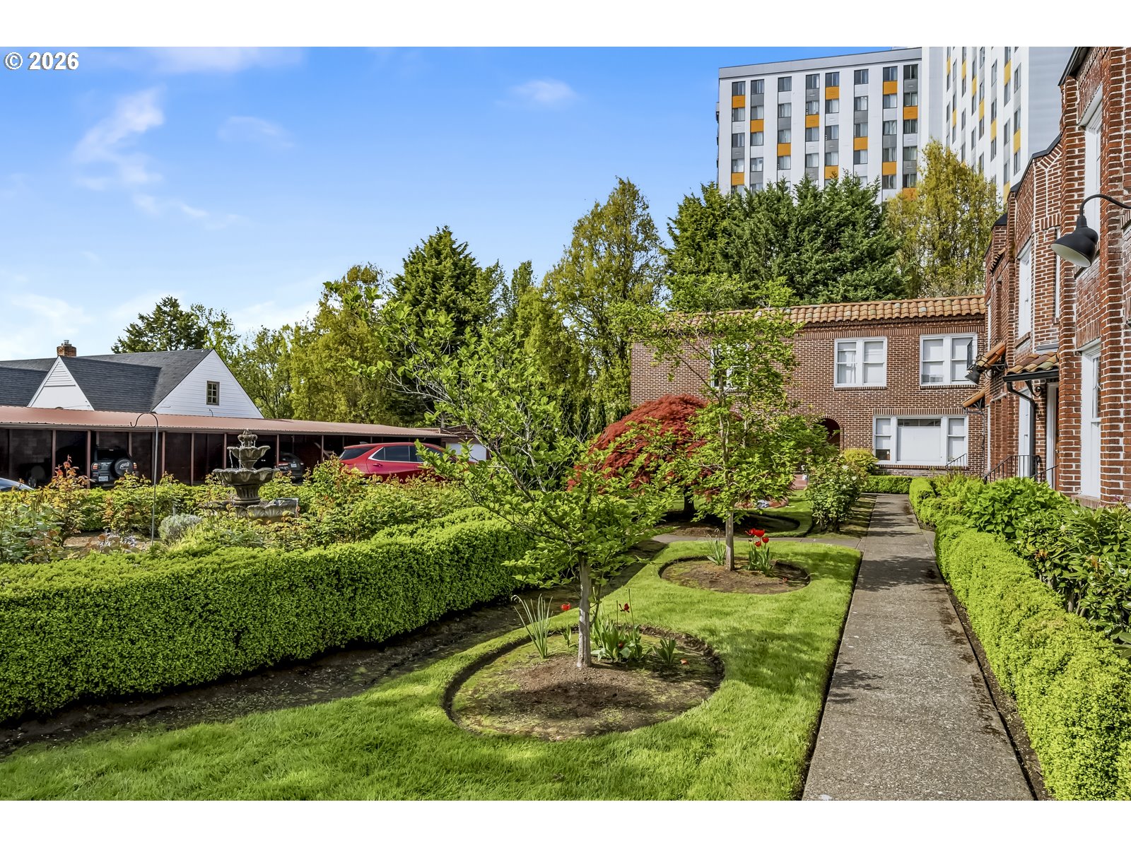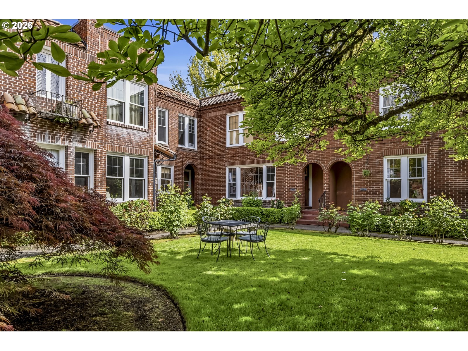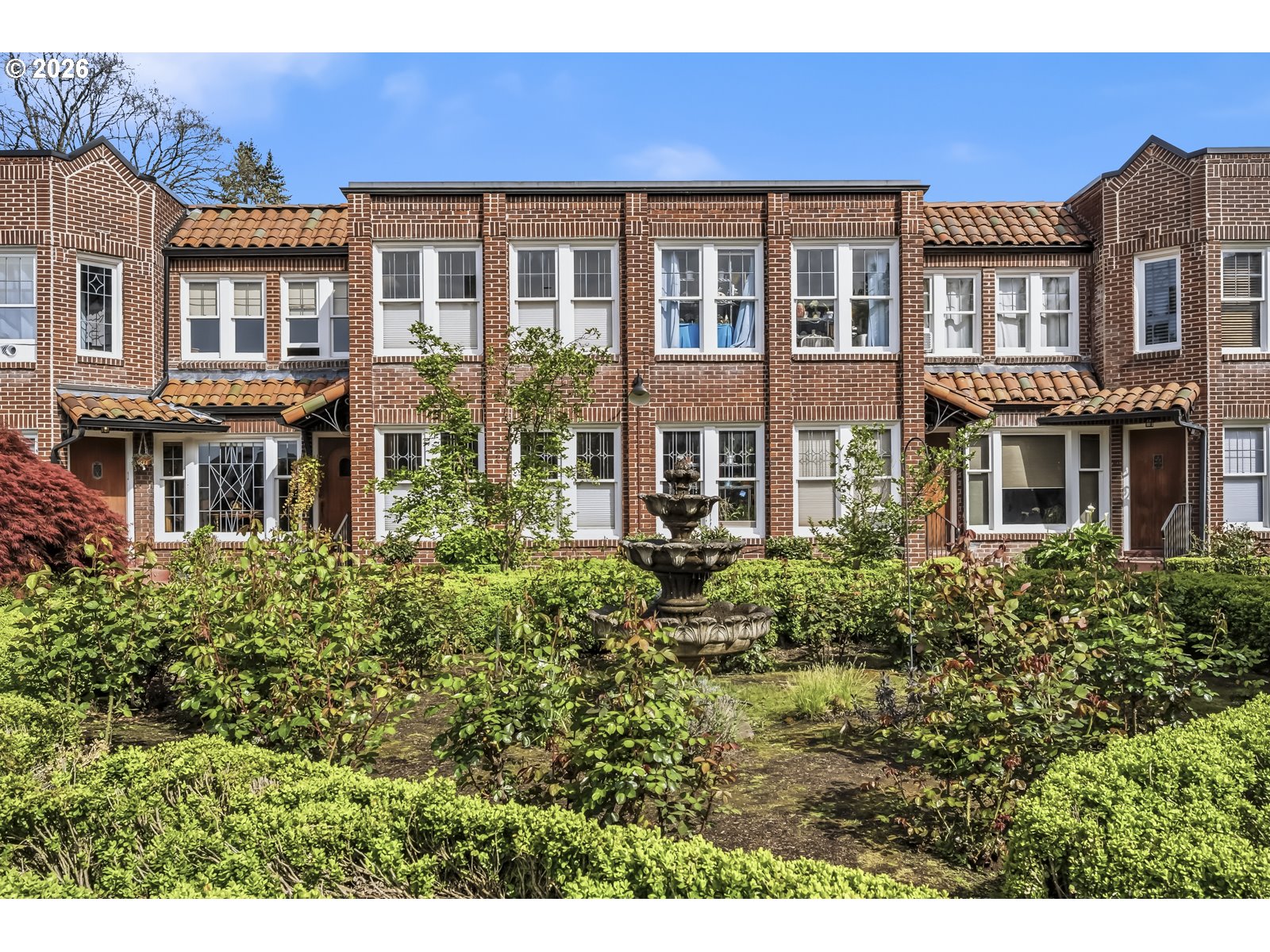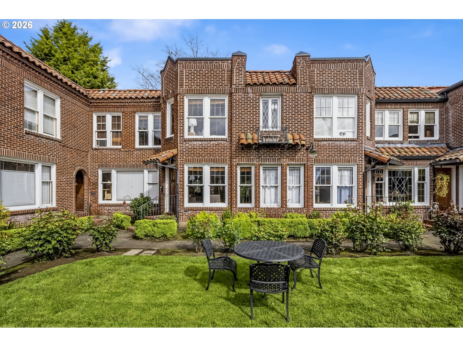Located a few short blocks from Whole Foods, Trader Joe's, and the well-loved Hollywood Theatre, you'll find this gated, quiet complex that feels like it's in a world of its own. Step into the courtyard and immediately notice the lush landscaping, stunning Magnolia tree, and multiple spots to sit and enjoy the outdoors. Ideally situated at the back of the complex, this unit is full of charm and period character, with top-nailed wood floors, built-ins, and vintage light fixtures. The spacious living room opens to a comfortable dining room and an updated kitchen, featuring a back door that leads outdoors to a gated pet relief area. Upstairs, you'll find two spacious bedrooms, each with a walk-in closet, and a beautifully updated bathroom featuring a jetted tub, era-appropriate finishes, and a convenient washer and dryer. The covered, deeded parking space, private basement storage unit, and well-run HOA that includes almost all utility costs (including heat!) are the icing on the cake. Enjoy peaceful living in this excellent location- walk score of 93!