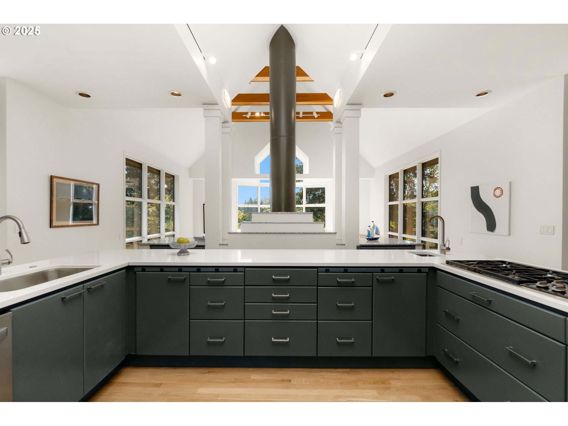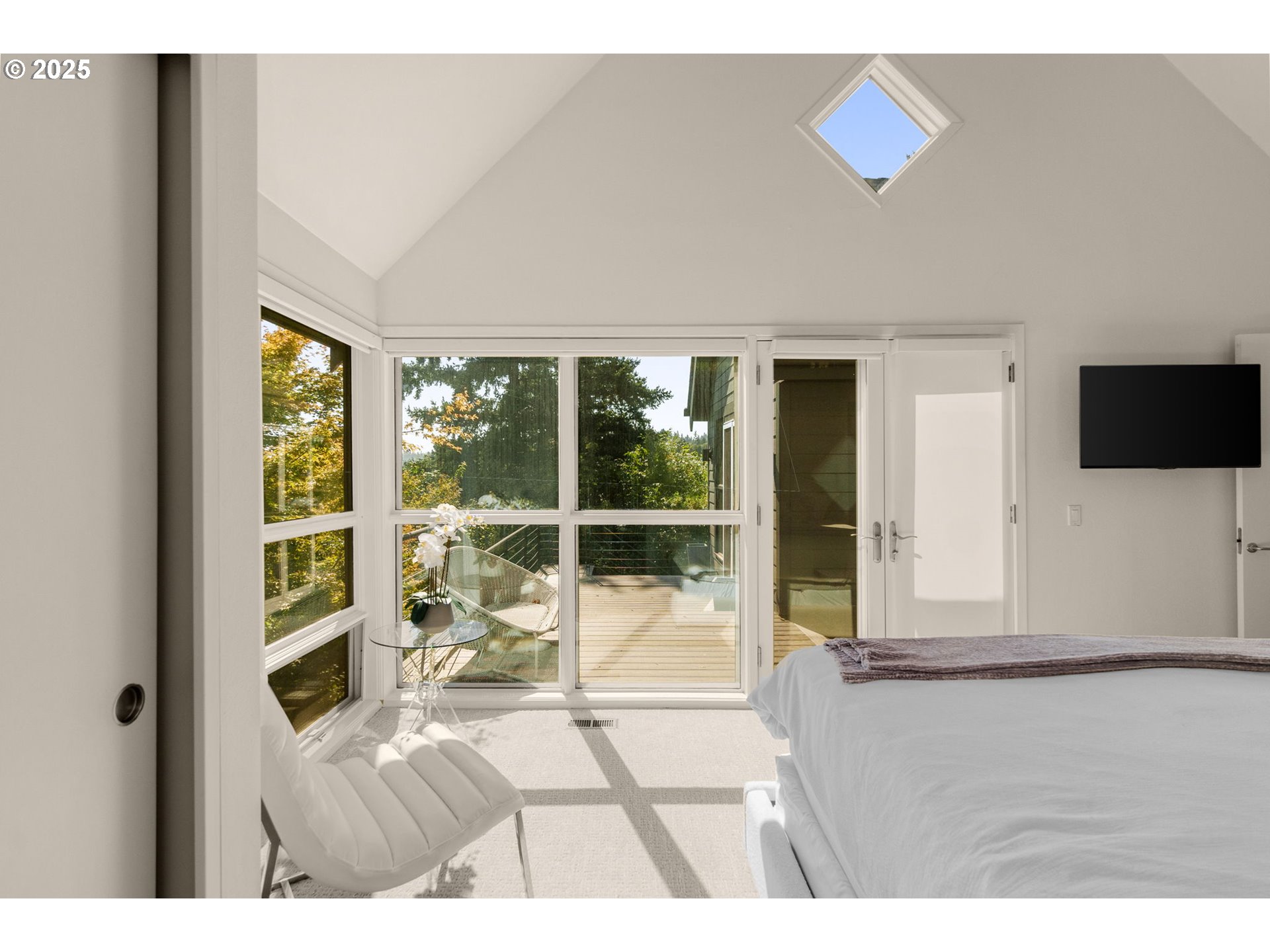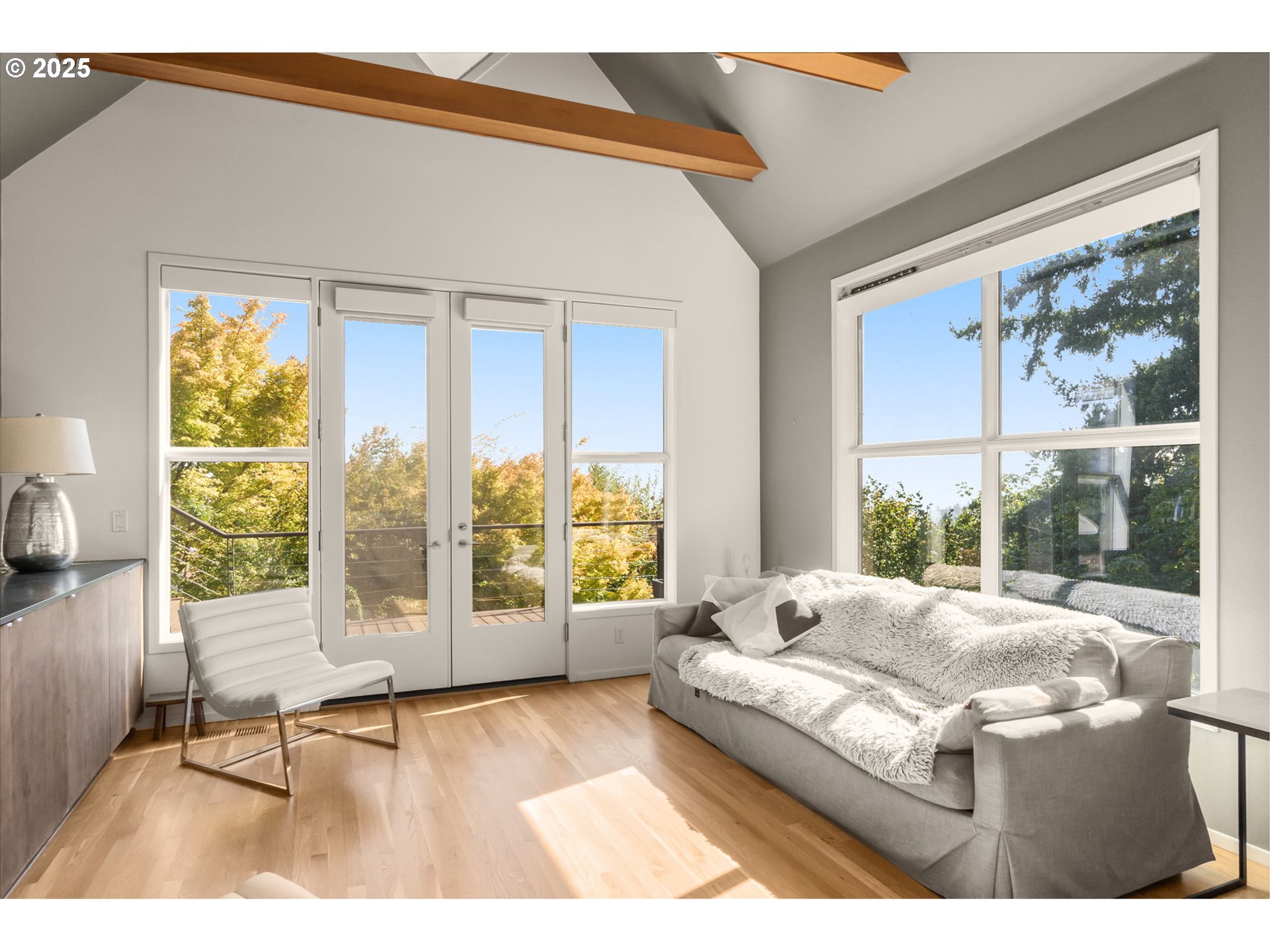 A home offering a beautiful combination of design and nature. Set in complete privacy with spectacular views of the city and Portland landscape. Relax and see Mt Hood perfectly framed in the window. Light abounds with walls of windows and vaulted beamed ceilings. The primary ensuite on the main, hardwood floors, new carpeting, custom cabinetry, a spacious kitchen with an incredible amount of counter space. So many features including closet organizers, wiring for generator, remote control blinds. Set peacefully above the restaurants, shopping and services of Uptown/23rd.