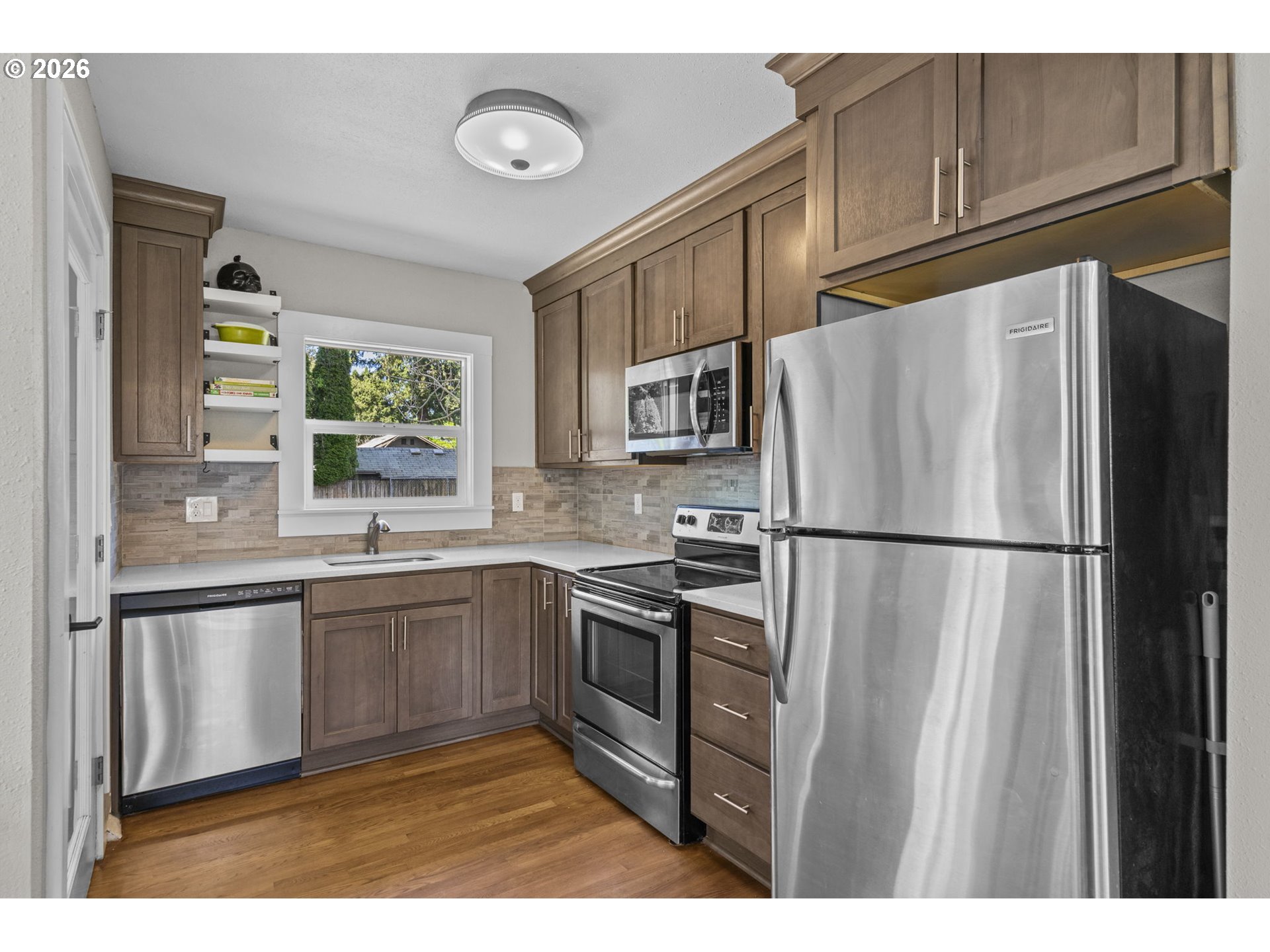 This 2 bedroom, 1 bath classic bungalow offers a well laid out, comfortable layout with top nail oak hardwood floors and fresh interior paint throughout. The main living spaces feel open and bright. The kitchen features quartz countertops, stainless steel appliances, and updated cabinetry in a clean, functional design that connects naturally to the living area for an easy daily flow. Newer vinyl windows and thoughtful improvements throughout add to the home’s overall livability, while a full unfinished basement provides ample storage and future flexibility. Outside, the yard has been refreshed with new sod, and a large concrete pad offers flexible space for parking, projects, or outdoor use. Located in Parkrose with quick access to I-205,I-84, and a 5 minute walk to the MAX light rail. Close to Parkrose Hardware, Sandy O’s, Parkrose Coffee, O’ Dear, My-O-My, and more. [Home Energy Score = 4. HES Report at https://rpt.greenbuildingregistry.com/hes/OR10246640]