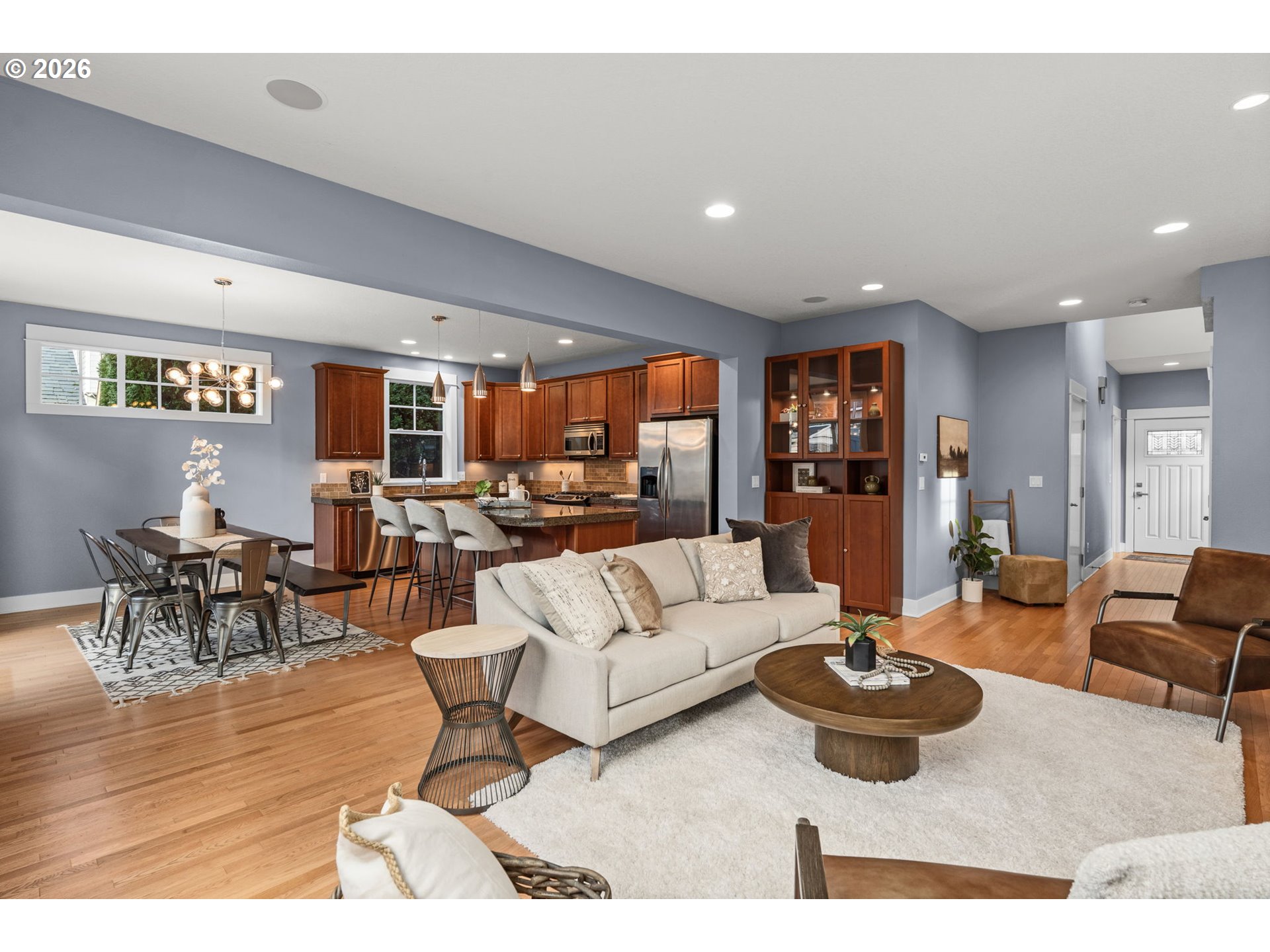 (503) 893-8874Newer 2009 Craftsman in the heart of Woodstock with modern systems and an easy, livable layout! Covered front porch opens to a great-room main level with hardwood floors, recessed lighting, and a gas fireplace. Open kitchen features granite counters, stainless appliances, built-in hutch, and an island with breakfast bar seating. Dining area slider to the deck for effortless indoor/outdoor entertaining, plus a convenient half bath. Upstairs: spacious primary suite with walk-in closet (built-ins), double vanity, and tiled walk-in shower, plus 3 additional bedrooms, including one with glass French doors, perfect for an office/den or private bedroom. Full hall bath + upstairs laundry. Fully fenced yard with Pistils-designed landscaping, deck + patio, newer covered hot tub, tool shed, and 1-car garage with workshop space. Minutes to Woodstock shops and restaurants! [Home Energy Score = 5. HES Report at https://rpt.greenbuildingregistry.com/hes/OR10243732]