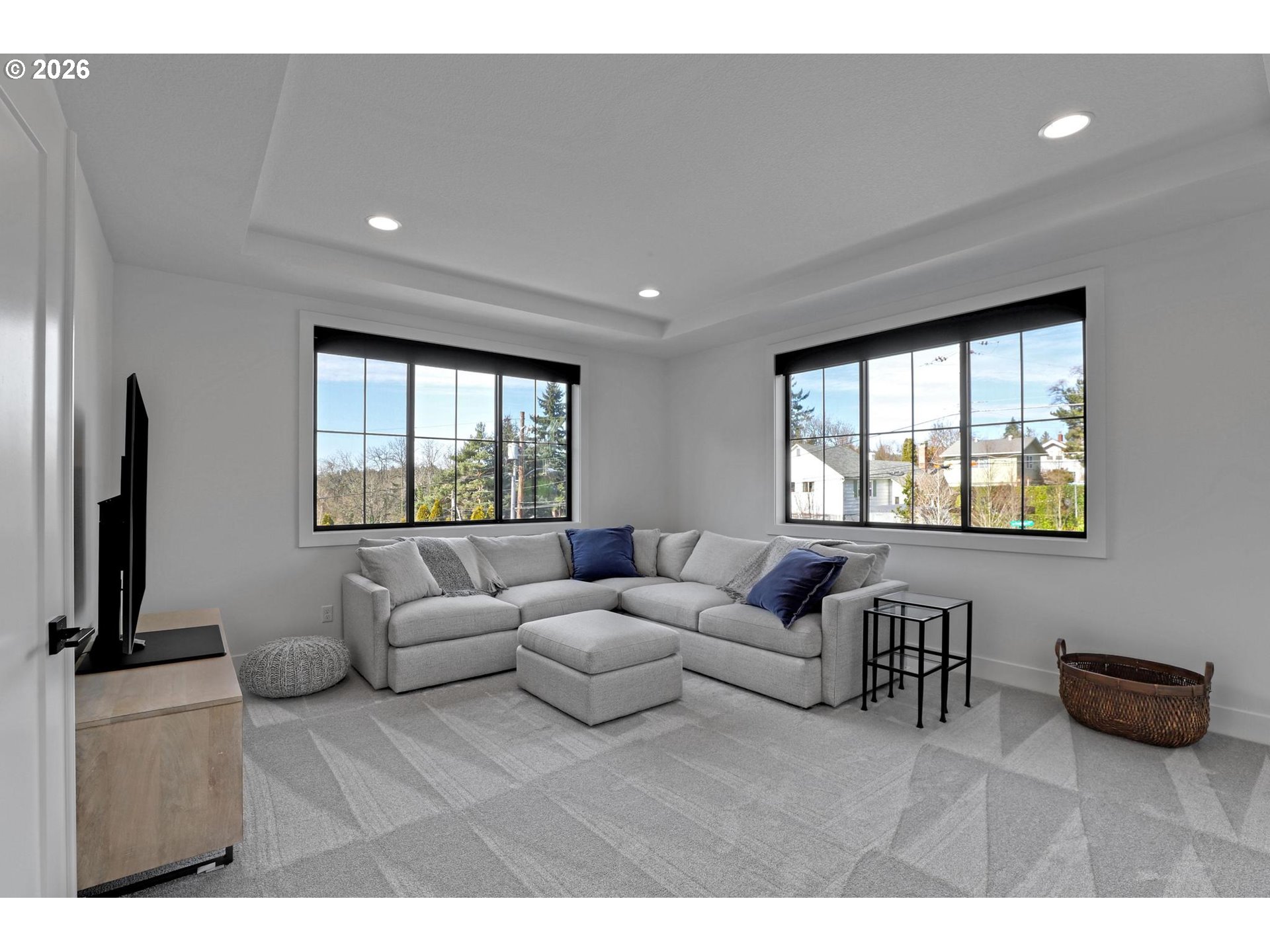 Spectacular Hayhurst location pairs with top-notch construction in this pristine farmhouse-style home. Situated on a private corner lot, this versatile floorplan is filled with light thanks to 10’ ceilings and expansive windows. Luxury details shine throughout, including custom built-ins and cabinetry, shiplap accents, engineered hardwoods, and a gas fireplace with tile surround. The gourmet kitchen is a true centerpiece, featuring a KitchenAid appliance suite with gas range and built-in microwave/wall oven, Bosch dishwasher, large island, quartz countertops, and thoughtful extras like trash pullouts. The spa-inspired primary bath offers a free-standing tub, while modern comforts include central A/C, tankless water heater, EV charging-ready, and abundant energy-efficient features. Ideal layout offers 4 bedrooms plus a den/office and bonus room, with an upper-level laundry and exceptional storage throughout. Outdoors, enjoy a level backyard with covered patio, sunny southern exposure, and rare privacy backing to a tree preservation area. Fantastic central SW Portland location—minutes to Gabriel Park, Maplewood Café, Multnomah Village, and Hillsdale shopping and dining. Just a short stroll to highly rated Hayhurst Elementary.