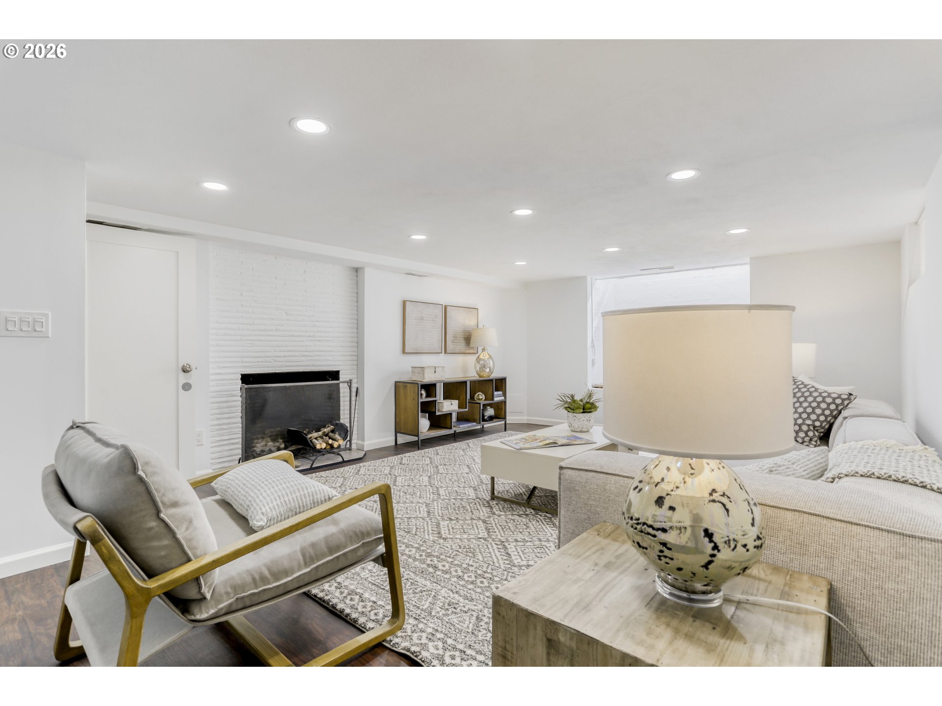 Tucked off Taylors Ferry on a shared drive, this classic 1940s mid-century home offers a private setting on an oversized .22-acre lot, surrounded by mature trees and refreshed landscaping. An expansive brick patio creates a welcoming outdoor space at the entry. Inside, refinished hardwood floors, fresh interior paint and abundant natural light highlight the home's timeless character including coved ceilings, arched openings and French doors that create a warm, inviting feel. The living room centers around a wood-burning fireplace and flows into the dining area with easy access to the backyard while a striking staircase with wrought iron balusters leads to the lower level. The updated kitchen features generous cabinetry, a farmhouse sink, gas range with stainless steel chimney-style hood and new Karndean luxury vinyl tile flooring with a marble-inspired finish. Three bedrooms and two updated bathrooms are located on the main level including a primary suite with an en-suite bath, walk-in shower and double vanity. The daylight lower level expands the living space with a large family room, second wood-burning fireplace and flexible space for a media room, home office or guest area, along with laundry and additional storage. The fully fenced backyard offers a peaceful retreat with multiple areas to relax or entertain, mature trees and a treehouse plus an attached two-car garage. A SW Portland location that puts Multnomah Village, parks and trails within easy reach, while still offering a sense of privacy and space. [Home Energy Score = 1. HES Report at https://rpt.greenbuildingregistry.com/hes/OR10148985]