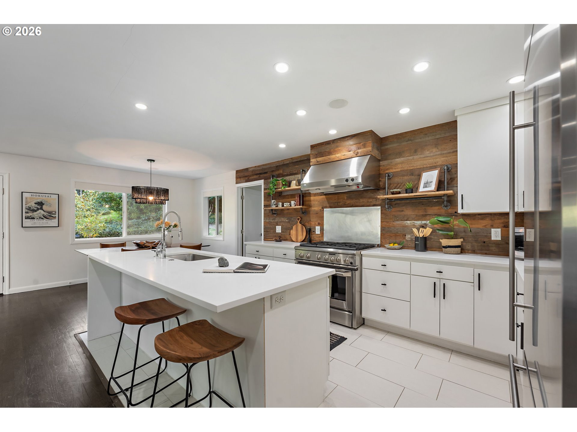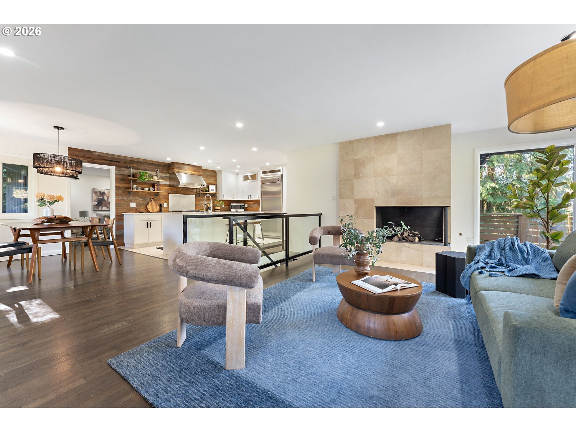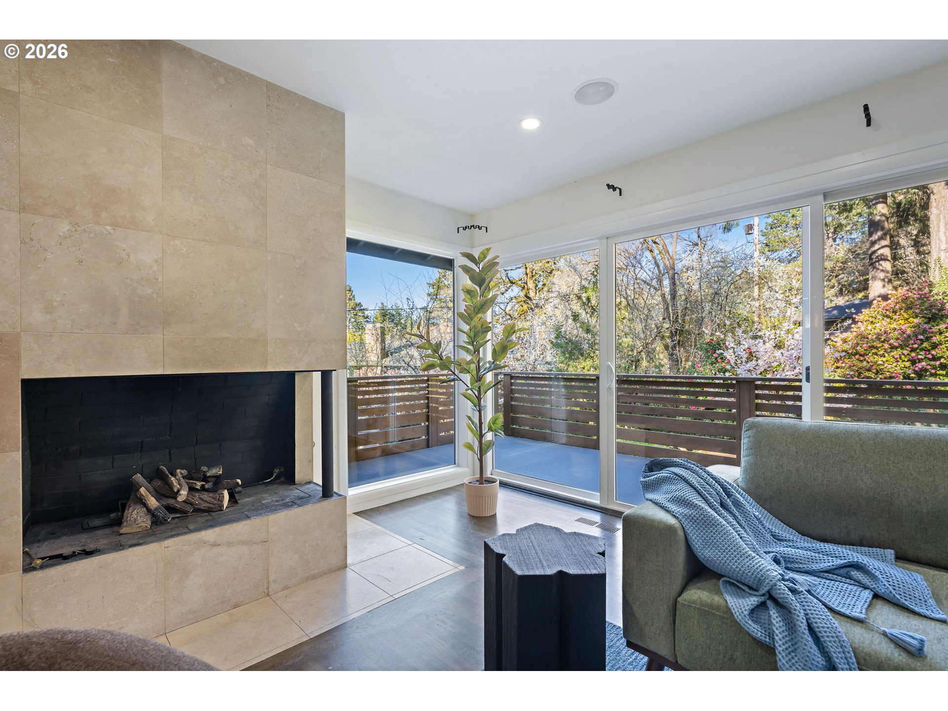 Midcentury retreat in Hillsdale offering a serene, private setting just minutes from OHSU, downtown Portland, and nearby wooded trails. Thoughtfully updated throughout, the home features a new roof (2023), cedar wraparound deck (2026), fresh interior paint (2026), and newer HVAC. The chef’s kitchen is equipped with a high-end water filtration system (2023). Upstairs includes new family room flooring (2023), solid core doors, and updated hardware. Major upgrades include a new electrical panel (2023), upgraded outlets, generator-ready wiring, and a French drain system installed by Ability Plus. Enjoy three distinct living areas and two fireplaces, providing both comfort and flexibility. The primary suite includes a walk-in closet and en-suite bath, while all three bathrooms are outfitted with bidets.The garden-level basement offers a separate entrance, dedicated art space, and strong ADU potential. An enclosed backyard creates a private, peaceful outdoor retreat. The landscaped grounds feature Hachiya persimmon, green apple, magnolia, Japanese cherry blossom, and pink and white dogwoods, along with a beautifully enhanced stream accented by two tons of stone. [Home Energy Score = 6. HES Report at https://rpt.greenbuildingregistry.com/hes/OR10202874]