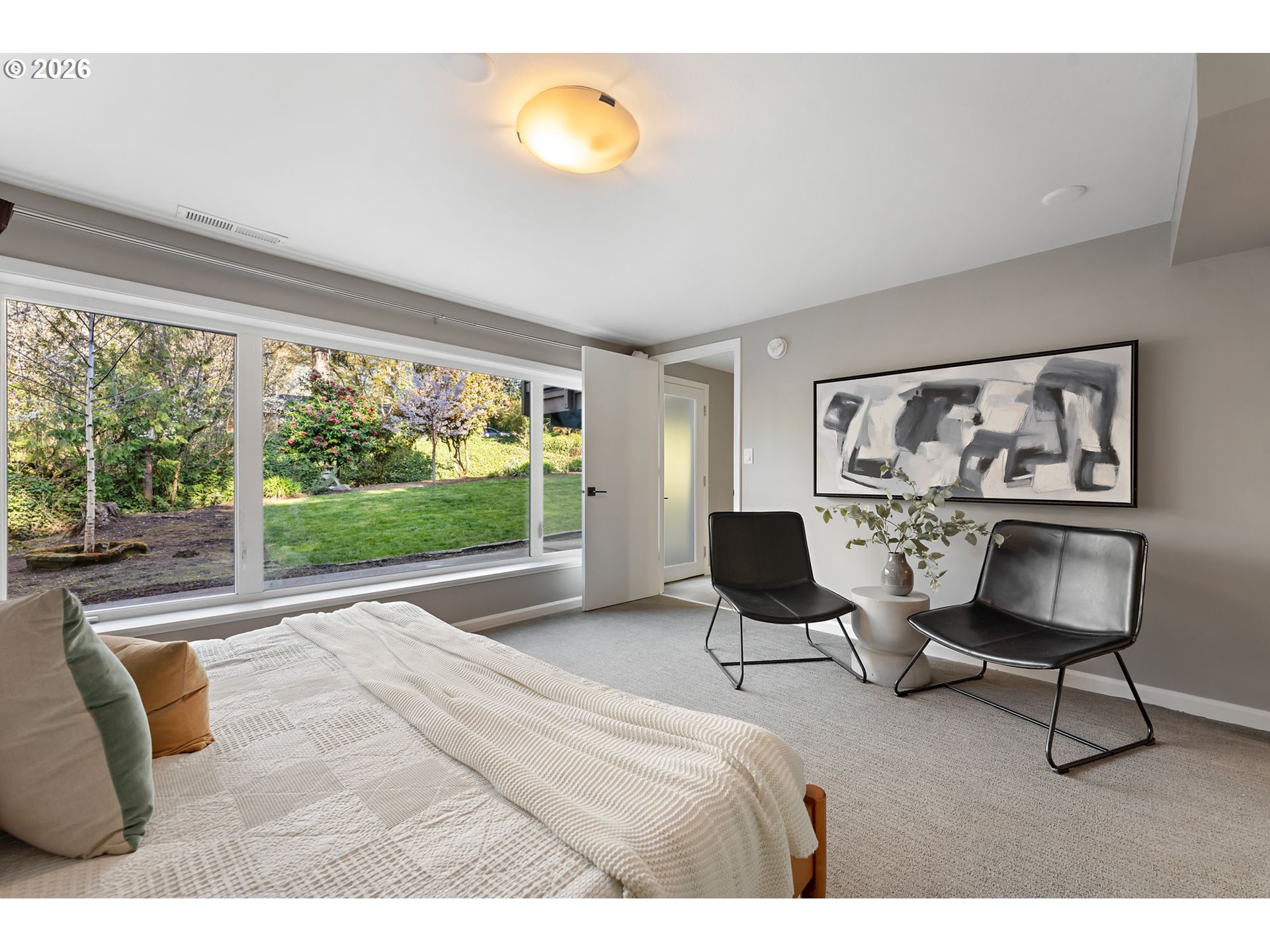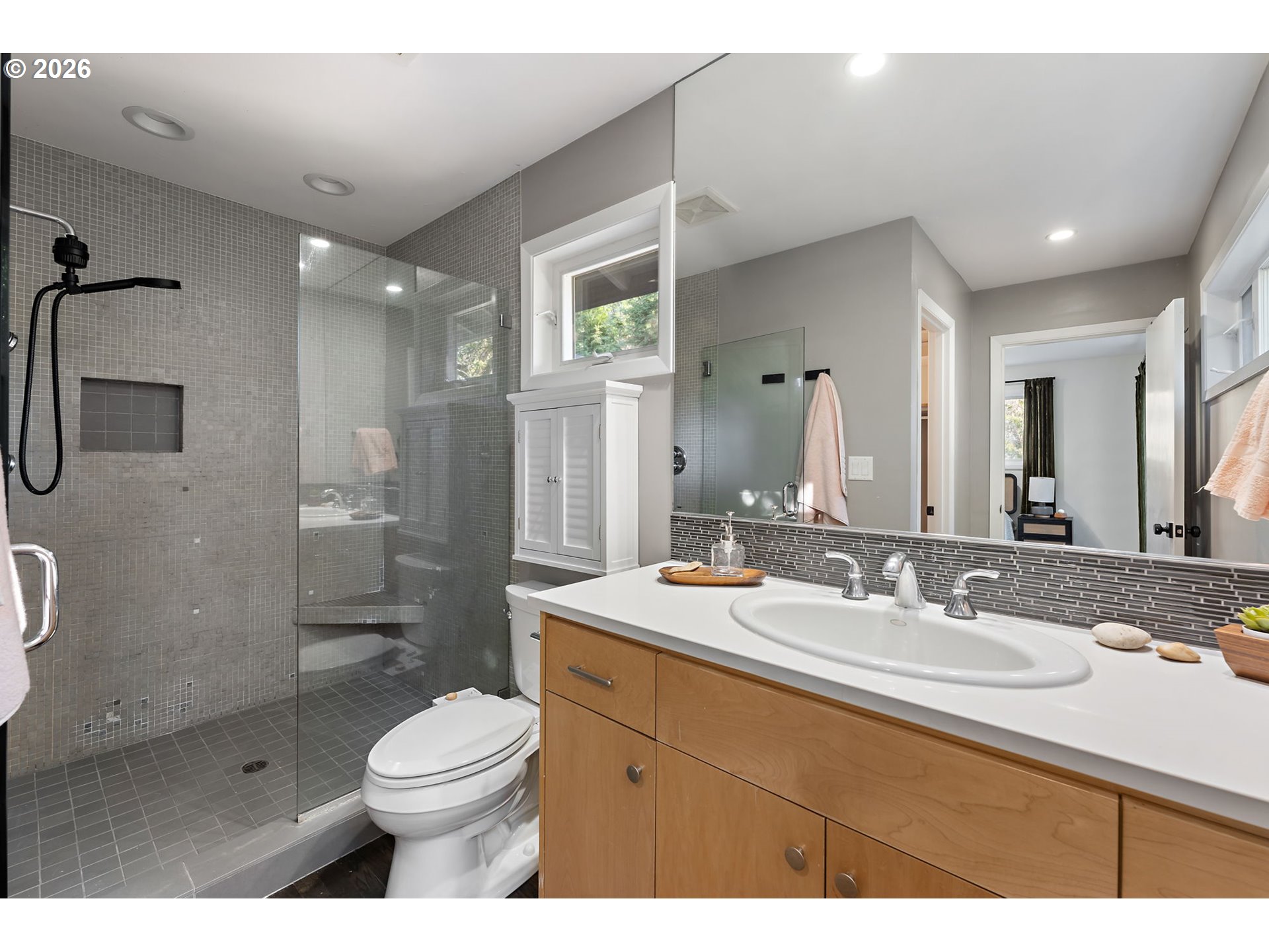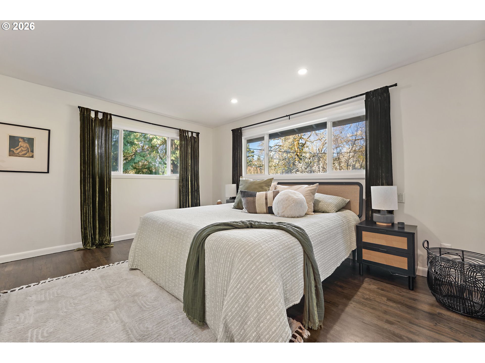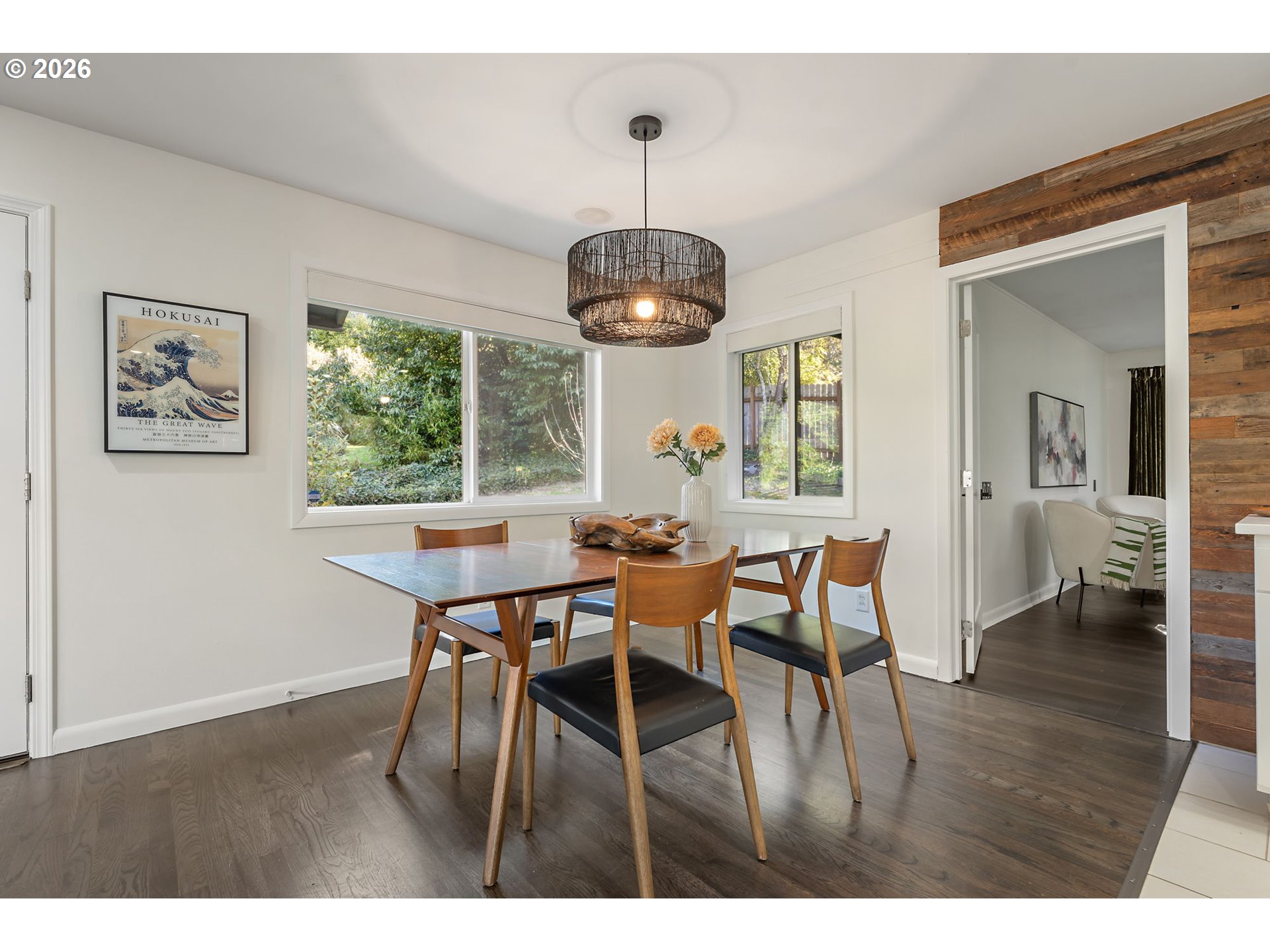 Midcentury retreat in Hillsdale offering a serene, private setting just minutes from OHSU, downtown Portland, and nearby wooded trails. Thoughtfully updated throughout, the home features a new roof (2023), cedar wraparound deck (2026), fresh interior paint (2026), and newer HVAC. The chef’s kitchen is equipped with a high-end water filtration system (2023). Upstairs includes new family room flooring (2023), solid core doors, and updated hardware. Major upgrades include a new electrical panel (2023), upgraded outlets, generator-ready wiring, and a French drain system installed by Ability Plus. Enjoy three distinct living areas and two fireplaces, providing both comfort and flexibility. The primary suite includes a walk-in closet and en-suite bath, while all three bathrooms are outfitted with bidets.The garden-level basement offers a separate entrance, dedicated art space, and strong ADU potential. An enclosed backyard creates a private, peaceful outdoor retreat. The landscaped grounds feature Hachiya persimmon, green apple, magnolia, Japanese cherry blossom, and pink and white dogwoods, along with a beautifully enhanced stream accented by two tons of stone. [Home Energy Score = 6. HES Report at https://rpt.greenbuildingregistry.com/hes/OR10202874]