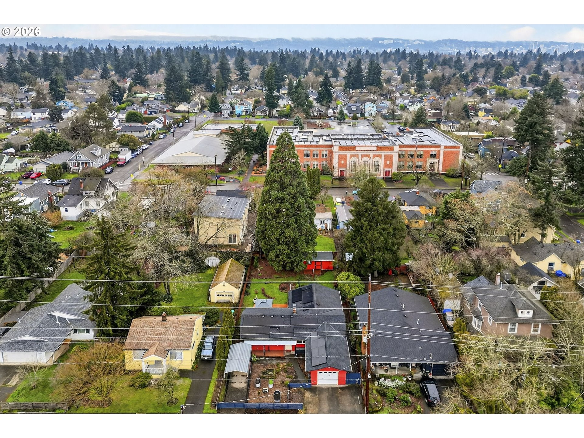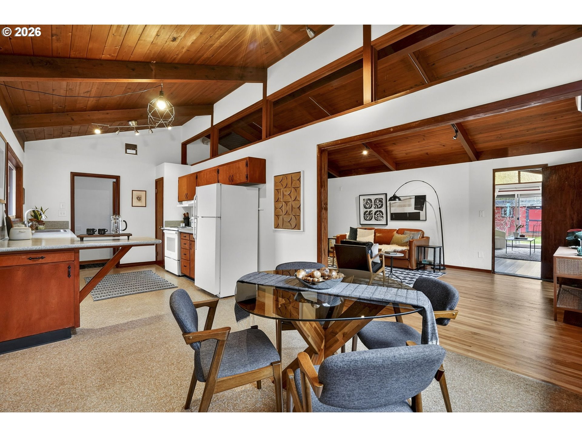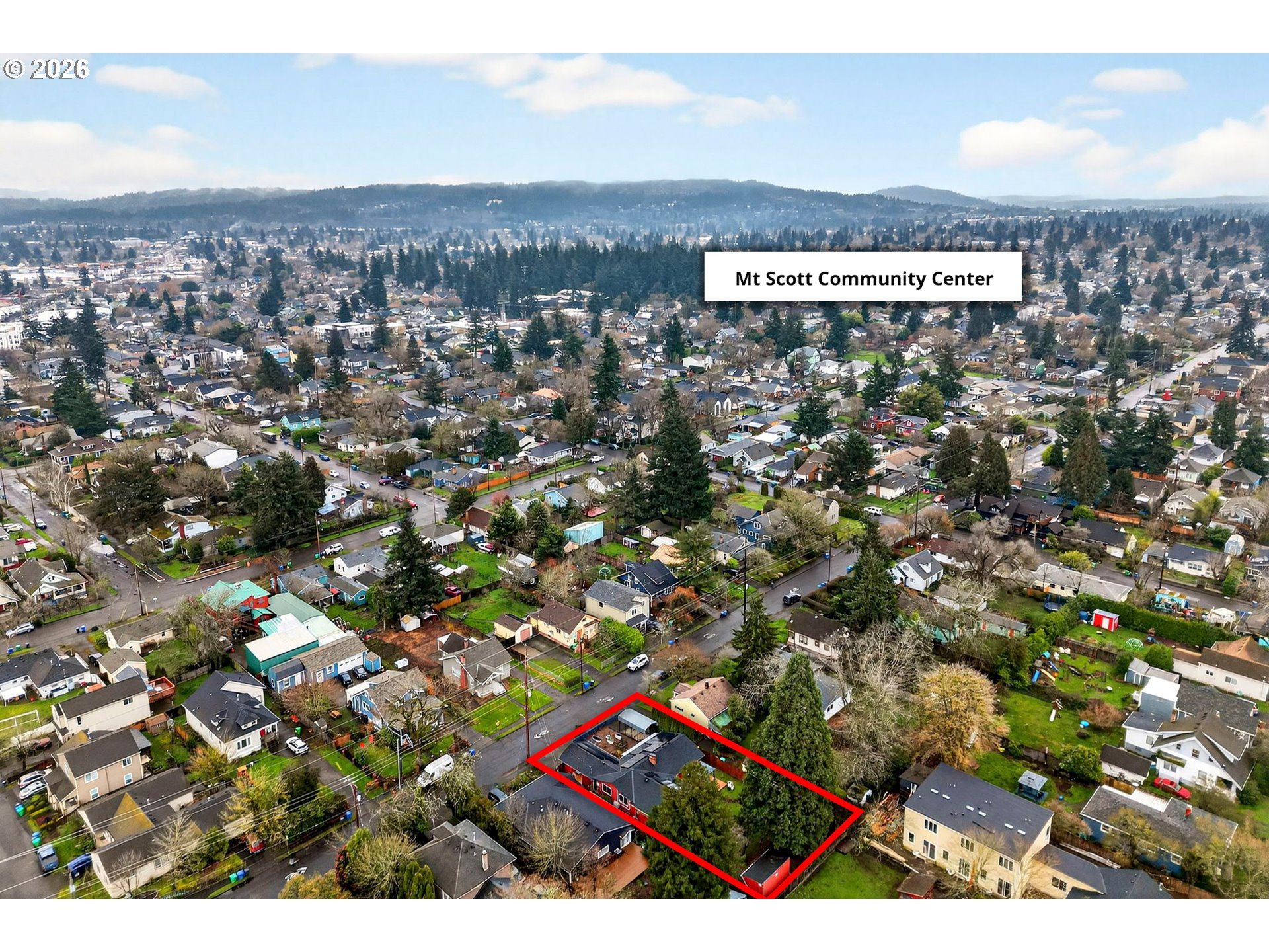 This home might look modest from the front but come inside and appreciate a time when architecture started to blend the classic ranch with the trendy midcentury modern appeal of lofted ceilings. Single level living at it's best with a rare attached 1-bedroom, 1-bath apartment offering incredible flexibility. Live as a 4-bedroom, 2-bath or separate into a 3-bedroom home with a private 1/1—ideal for guests, multigenerational living, or potential rental income. Major updates include new solar panels (2025), roof replacement (2020), updated plumbing and electrical, ductless mini splits installed (2021) in every room making heating and cooling easily controlled throughout the house, all new Milgard windows installed in 2011, and fresh interior paint in main home. A truly energy efficient home that is 100% electric! Enjoy comfort and ease in the roomy living room with a wood burning fireplace. Easy access to the backyard entertainer's or gardeners paradise through multiple sliding glass doors, all three installed in 2015.The nearly double lot features a beautiful mature sequoia tree, three patios added by the sellers, and a large backyard shed. Covered RV or boat parking out front provides added versatility.Located just one block from Arleta Elementary and walkable to the vibrant Foster-Powell corridor with local restaurants, coffee, parks, and community amenities nearby. Just a half mile to the completely renovated and beloved Mt. Scott Community Center. A rare opportunity for space, flexibility, and long-term potential in SE Portland. [Home Energy Score = 10. HES Report at https://rpt.greenbuildingregistry.com/hes/OR10245126]