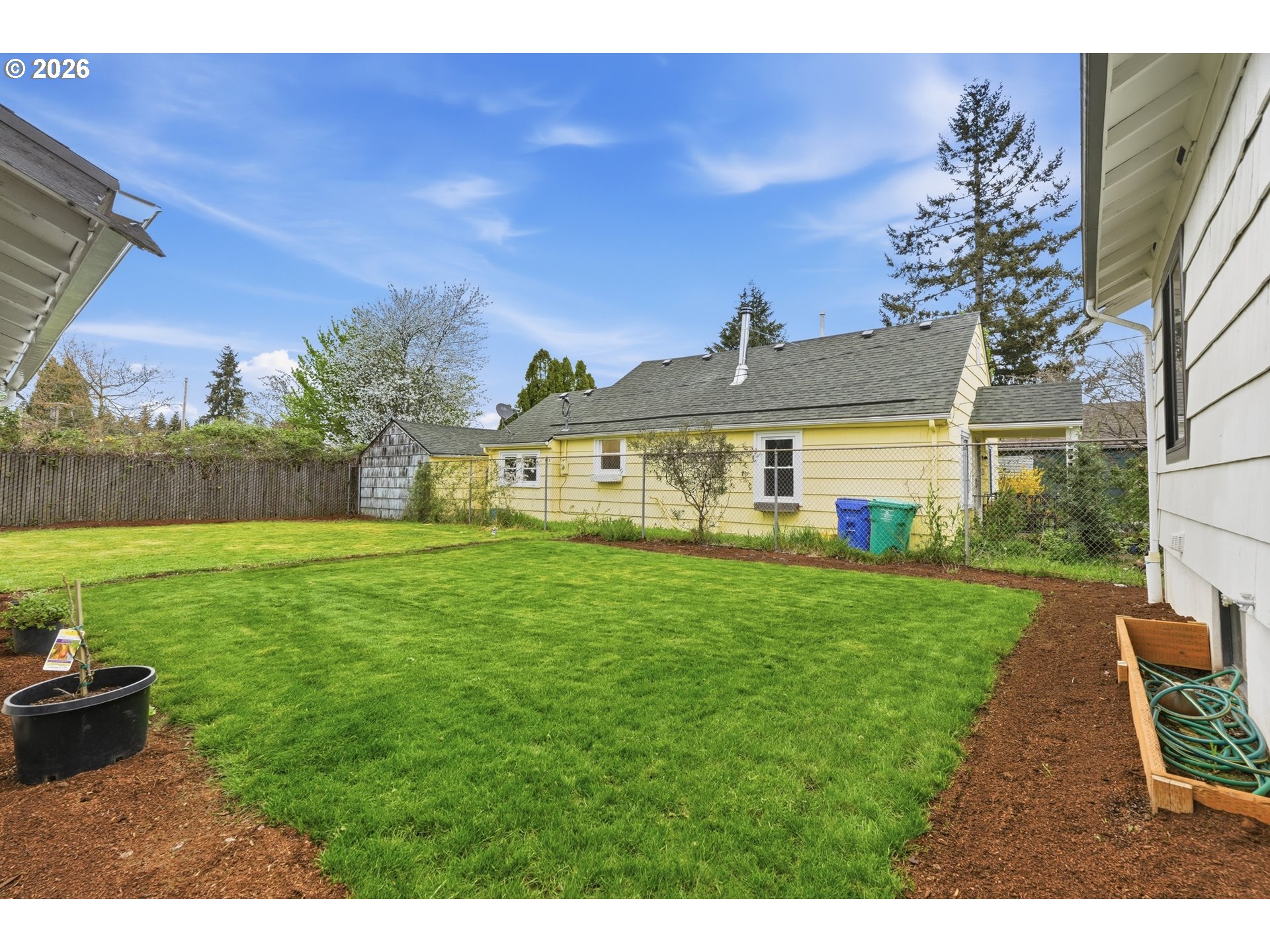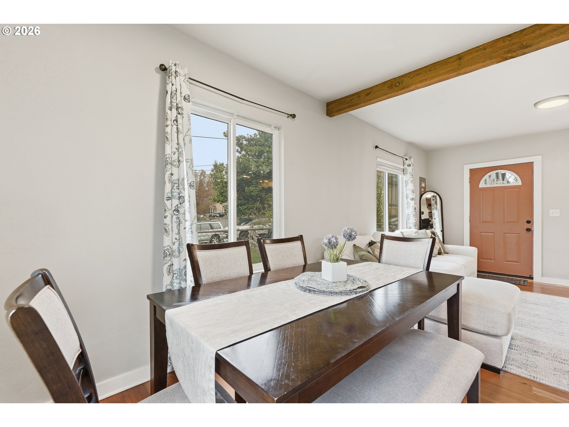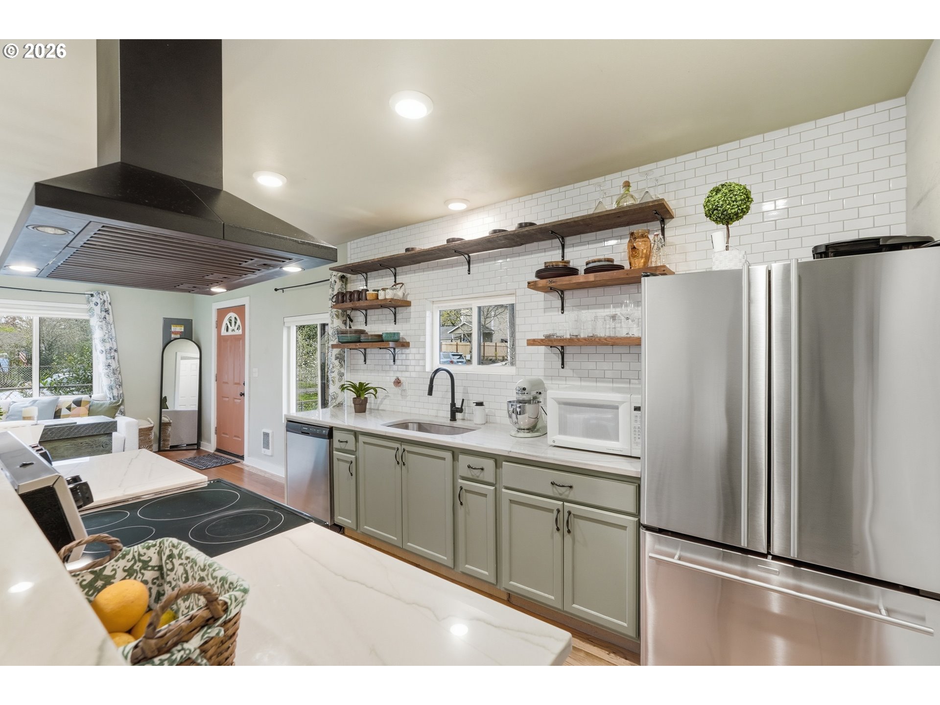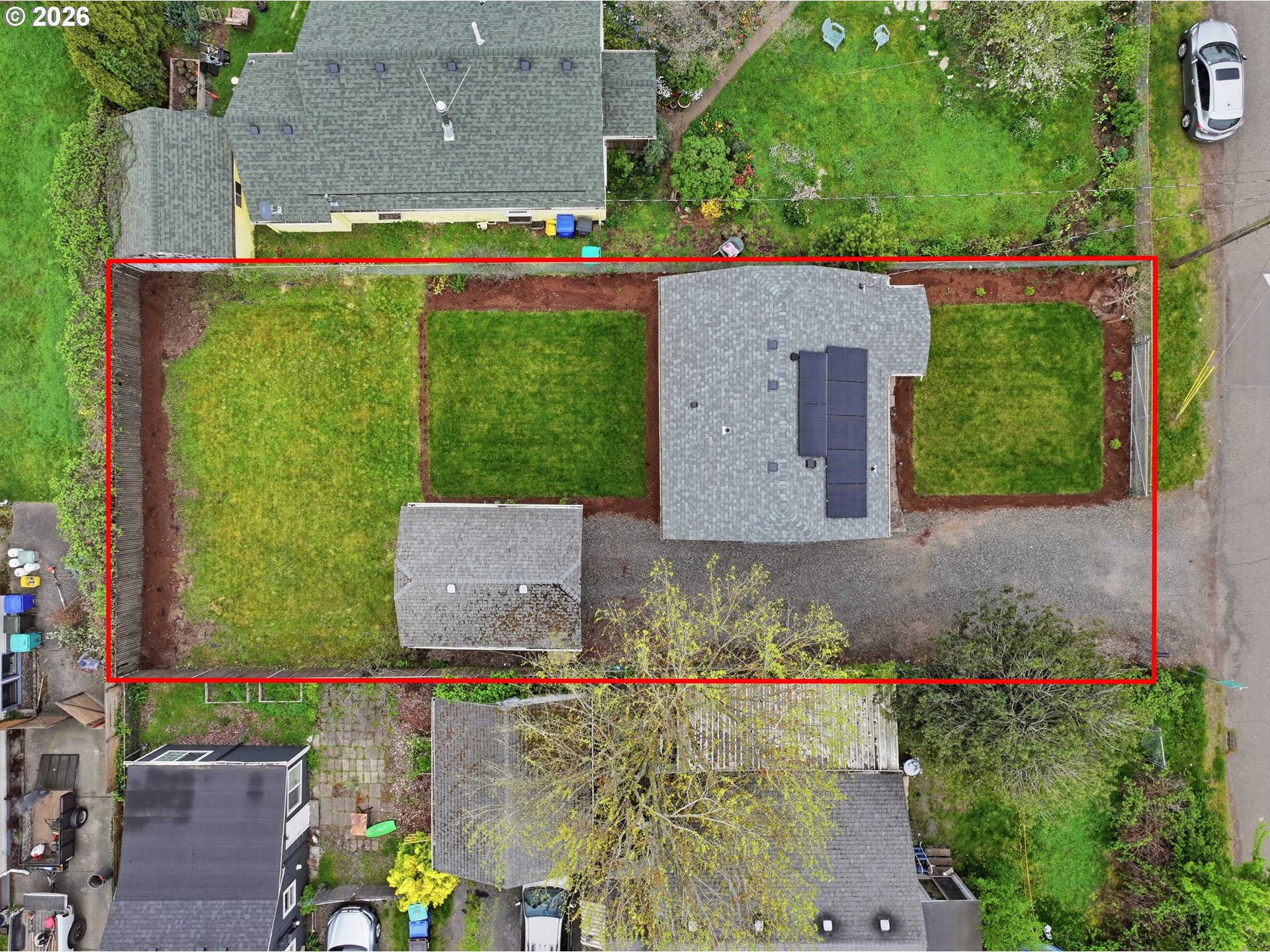 Charming and fully updated, this classic SE bungalow lives large with a smart, well-designed layout and a level yard in both the front and back. Hardwood floors and beautiful natural light run throughout the main level, where an open-concept living, kitchen, and dining area creates an easy, connected flow. The remodeled kitchen is the heart of the home with waterfall countertops, stainless steel appliances, and a bar for casual seating. The living room features a custom built, motorized TV lift cabinet for easy storing and use! The dining area overlooks the backyard, bringing in even more natural light. The layout offers ideal separation of space with a bedroom on the main level, while the private primary suite is tucked away on its own lower level. Downstairs includes an updated ensuite bathroom, a spacious walk-in closet, and an oversized laundry room with plenty of storage and functionality. Outside, the completely level, fully fenced backyard is a true highlight—perfect for entertaining, pets, gardening, or simply enjoying your own private outdoor space. A detached one-car garage adds convenience, along with generous driveway parking. Equipped with solar panels and ideally located in SE Portland minutes from shopping, dining, and everyday amenities, this home offers charm, efficiency, and modern updates throughout. Come see it for yourself! [Home Energy Score = 8. HES Report at https://rpt.greenbuildingregistry.com/hes/OR10246591]
