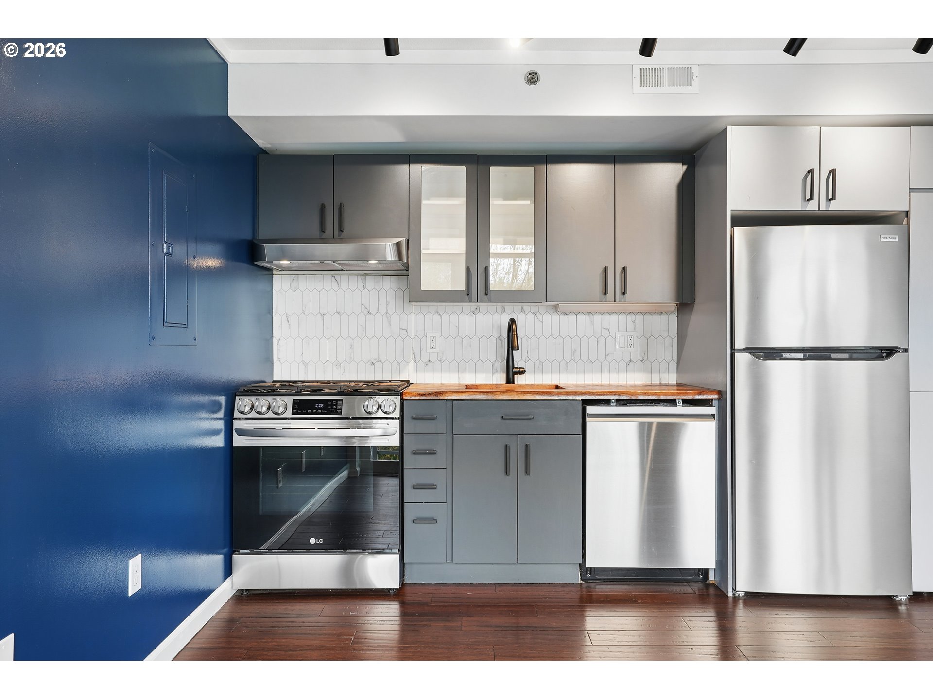 Light and bright 1-bedroom corner unit on 7th floor of Cascadian Court Condos in Portland's Lloyd Center. Unit 701 has floor-to-ceiling windows, new kitchen appliances, butcher block counter, tiled backsplash, newer HVAC, washer/dryer, bedroom closet built-ins. The condos at Cascadian Court are part of a modern mid-rise building with secure entry, and a shared courtyard. Located in the Lloyd District, the property offers excellent walkability and transit access, with restaurants, shopping, and entertainment all close by. Healthy HOA that covers water, sewer, trash, internet, cable tv, maintanance, management.