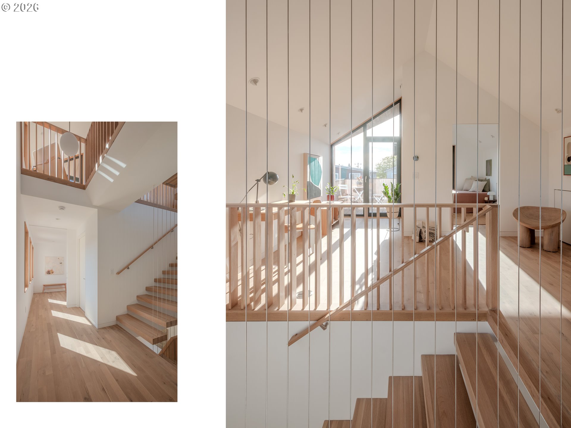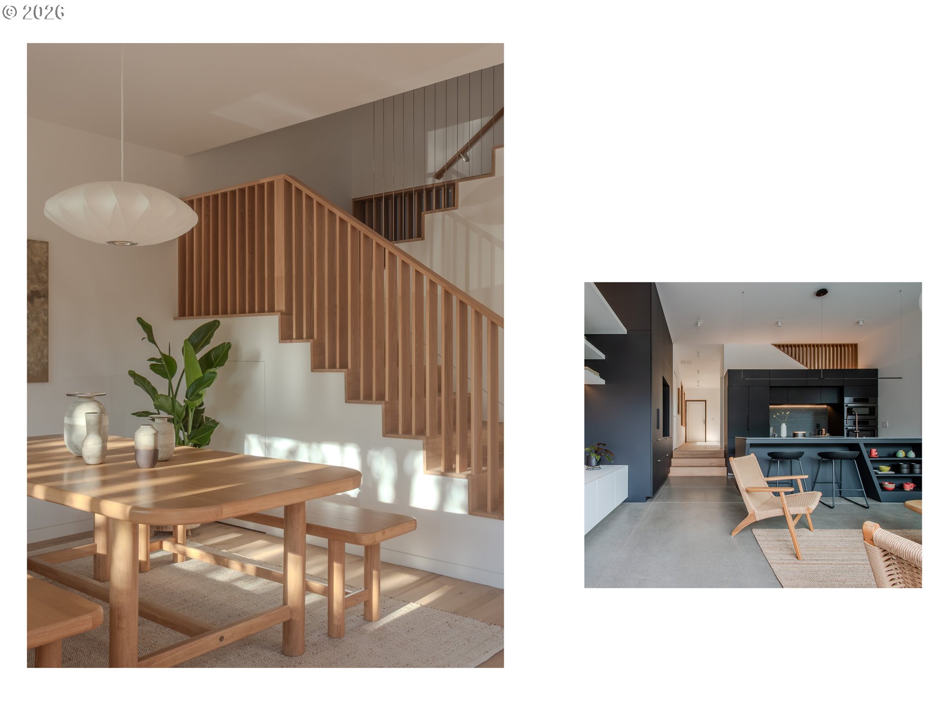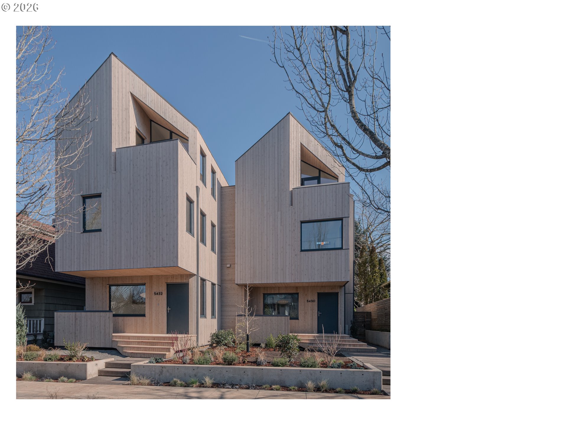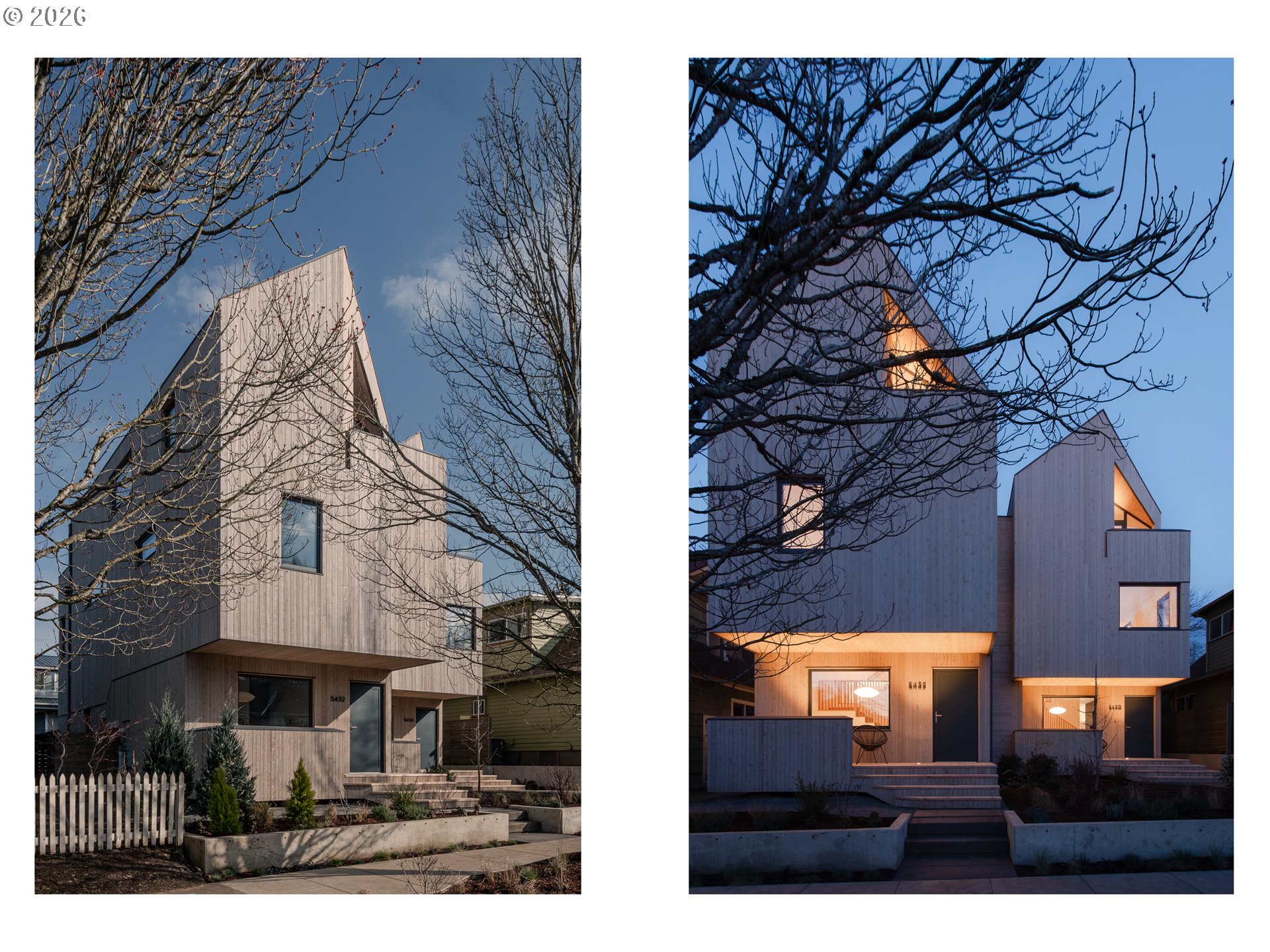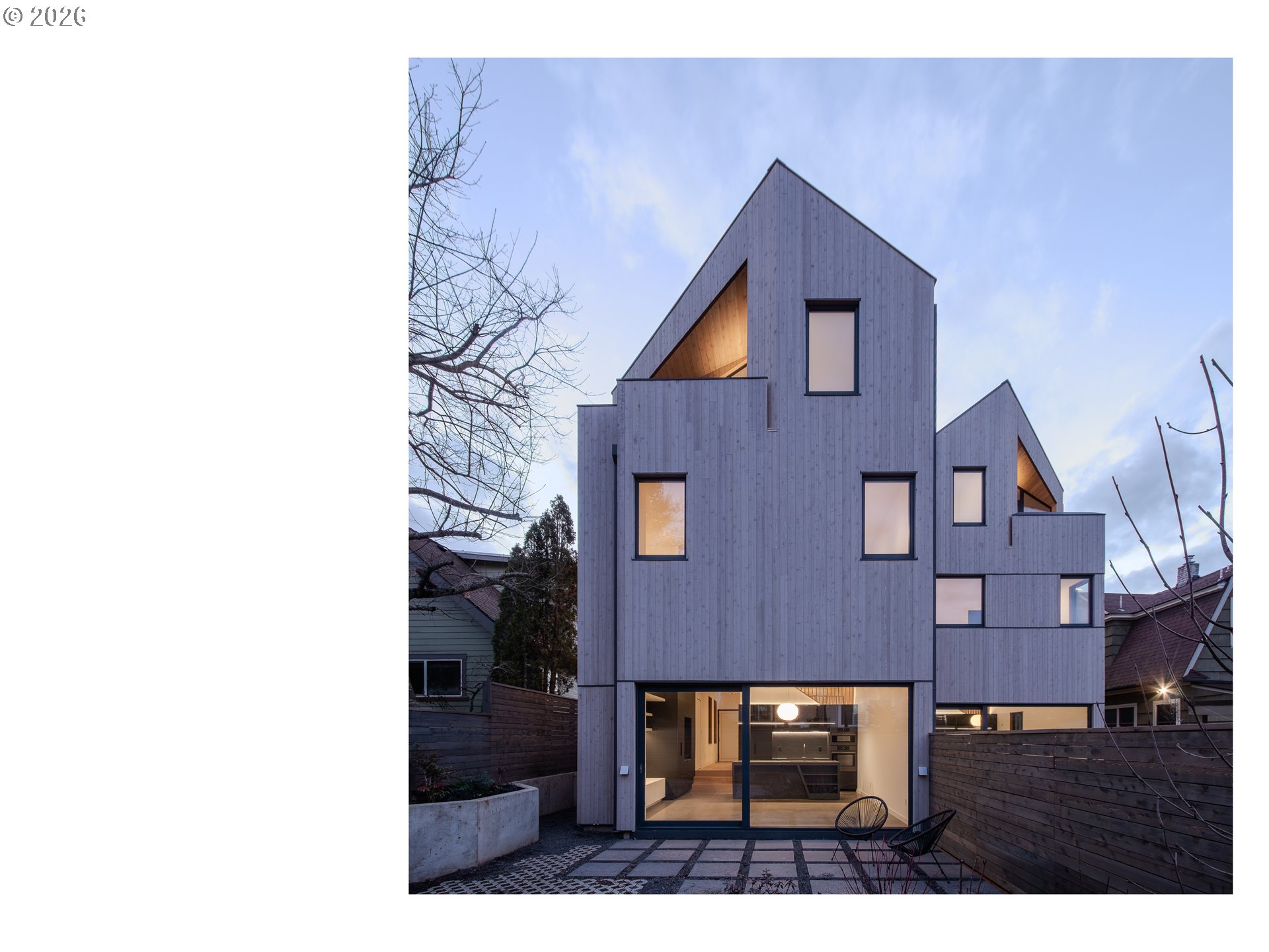 (503) 893-8874A rare opportunity to own a bespoke work of architecture nestled in the Alberta Arts district. Conceived and meticulously resolved by architect Mark Holmquist—raised in Germany and Portland, Harvard-trained, and a former associate partner at Foster + Partners (of Apple Park fame)—this modern-day Gesamtkunstwerk was recently selected for the AIA Portland Homes Tour and AIASF Design Awards. As if carved from a single block of cedar, the faceted pair of townhouses are made distinct through a series of geometric sleights of hand. Slipping one past the other, an unorthodox offset creates two reciprocal, lushly planted outdoor ‘rooms’. A thickened party wall—expressed as a notch where the buildings lightly touch—conceals plentiful built-in storage, a critical acoustic decoupling, and allows for an unusually generous south-facing window wall. Upper decks, like the hollows of a tree, offer territorial views shrouded from the sidewalk below. The cascading steps of the front porch, paired with a dramatically cantilevered soffit above, welcome visitors in—a nod to Portland’s bungalow vernacular. At the foyer, this compression gives way to the first glimpse of a gossamer stair, suspended from the roof above and threading all three levels in a continuous volume washed in light. Living, dining, and kitchen occupy the main split-level, with two bedrooms and baths on the 2nd. A vaulted, open 3rd floor offers the flexibility of ample additional living space, including a third bedroom. The palette is warm and natural, the finish details refined, and tactile. Solid white oak floors and millwork throughout balance a sleek, velvety European chef’s kitchen with polished concrete underfoot. Only the two full baths—charcoal-hued retreats—depart from the airy theme. Guided by passive house principles, the homes are exceptionally energy efficient—and thanks to integrated rooftop solar, nearly net-zero. Built for comfort, longevity, and inspiration—designed as if for the architect themselves. [Home Energy Score = 10. HES Report at https://rpt.greenbuildingregistry.com/hes/OR10246489]