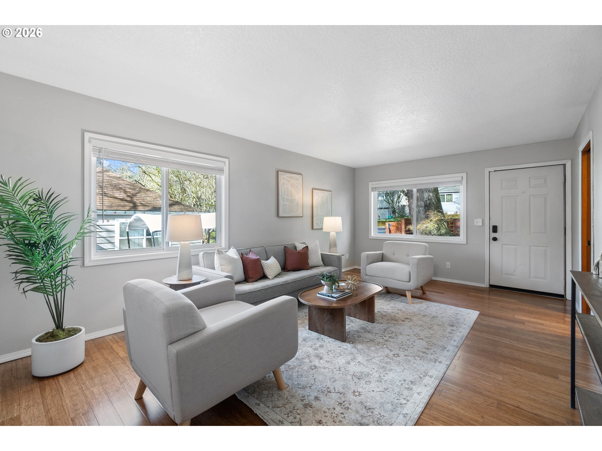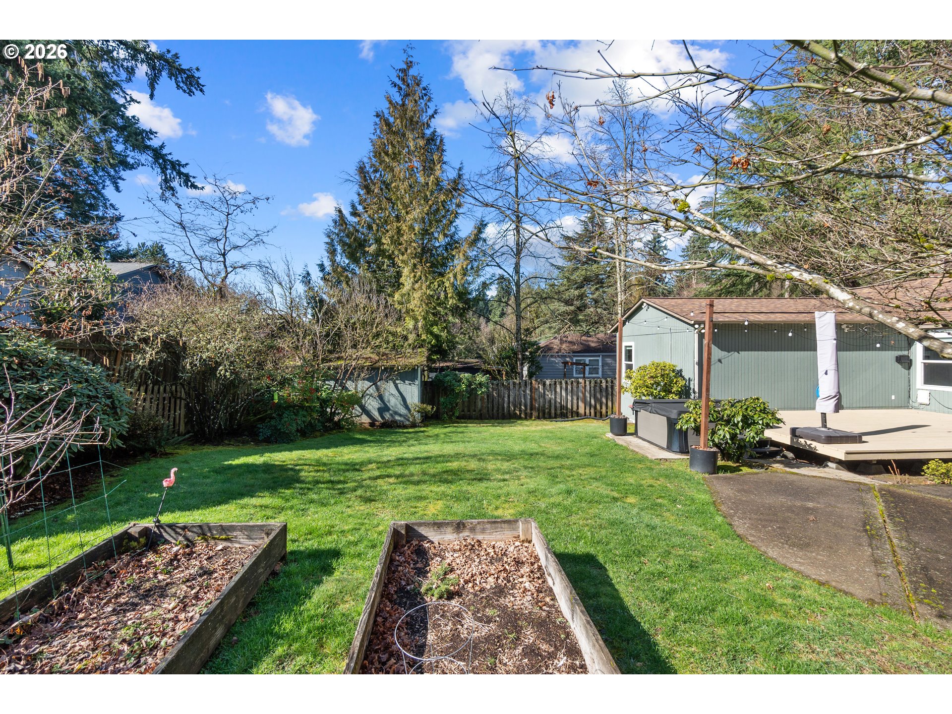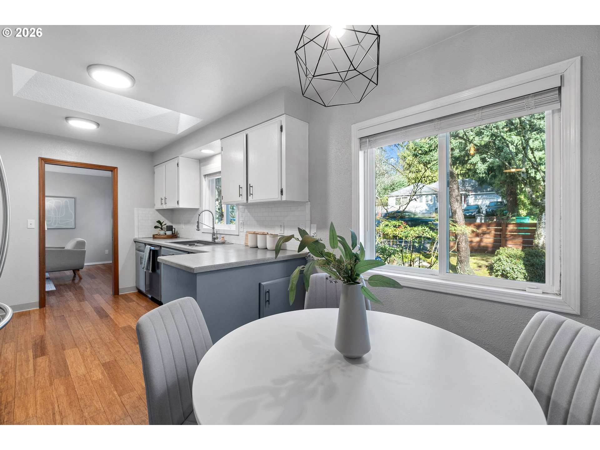 Adorable Home in Hayhurst. Come through the zen like front garden into a beautiful large living room with western facing light pouring in that afternoon sun. Soothing paint colors calm the spaces and easy maintenance with bamboo floors throughout. A fresh update to the kitchen with painted cabinets, SS appliances and sink, tile backsplash on both sides and added sun coming through the skylight. Cozy informal eating area perfectly placed for entertaining and close to the extra pantry cabinet. Primary bedroom is generously sized with two deep closets for all your necessary clothing storage. New carpet in the both bedrooms, also in the extra bonus room which can be used as another bedroom, family or party room. Access from this room as well from the laundry room leads you to the huge patio and wood deck area, perfect for entertaining on those warm days ahead! You’ll delight in the big grass yard, garden beds and berries as the seasons change the matured landscape. A tool shed is conveniently placed in the back and provides plenty of storage. A new roof has been recently installed and the newer windows help keep your utility bills down. With quick access to neighborhood amenities and close by parks, this home is ready for you to start living! See our virtual tour links for more information.