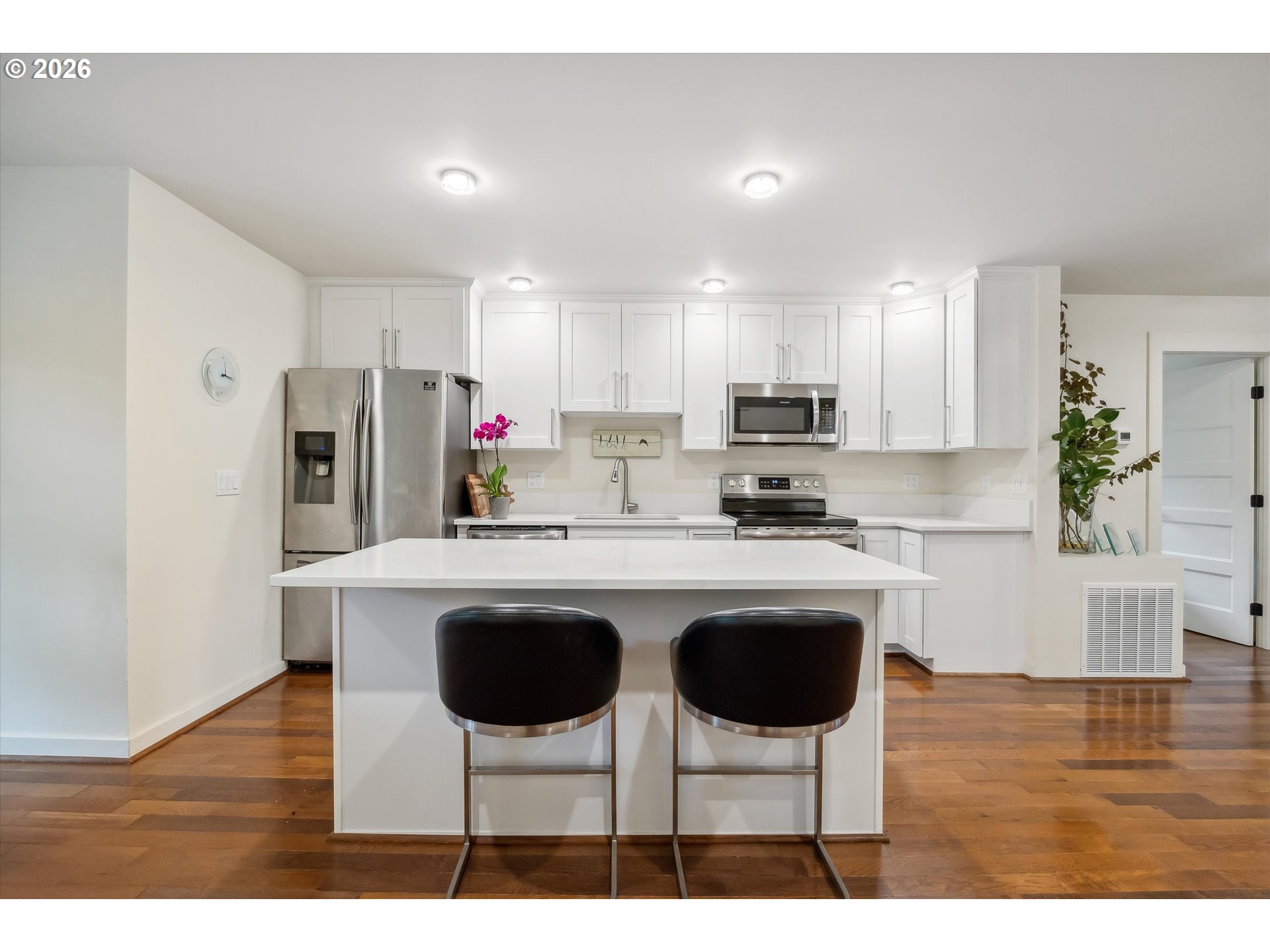 Modern University Park Home remodeled in 2018. This light-filled home offers easy one-level living with an open floor plan, engineered wood floors, and a seamless flow between the living, dining, and kitchen spaces. The kitchen features quartz countertops, stainless steel appliances, and a large island —perfect for everyday living and entertaining — with direct access to the spacious backyard.The primary bedroom is a true suite with a walk-through closet and private bathroom, complemented by three additional bedrooms and two full baths.The lower level provides generous storage space. Situated on a quiet street with alley access. The large backyard offers room to relax, entertain, or explore future ADU potential. Conveniently located with access to the University of Portland and a variety of amenities, including New Seasons, restaurants, and more. [Home Energy Score = 8. HES Report at https://rpt.greenbuildingregistry.com/hes/OR10123489]