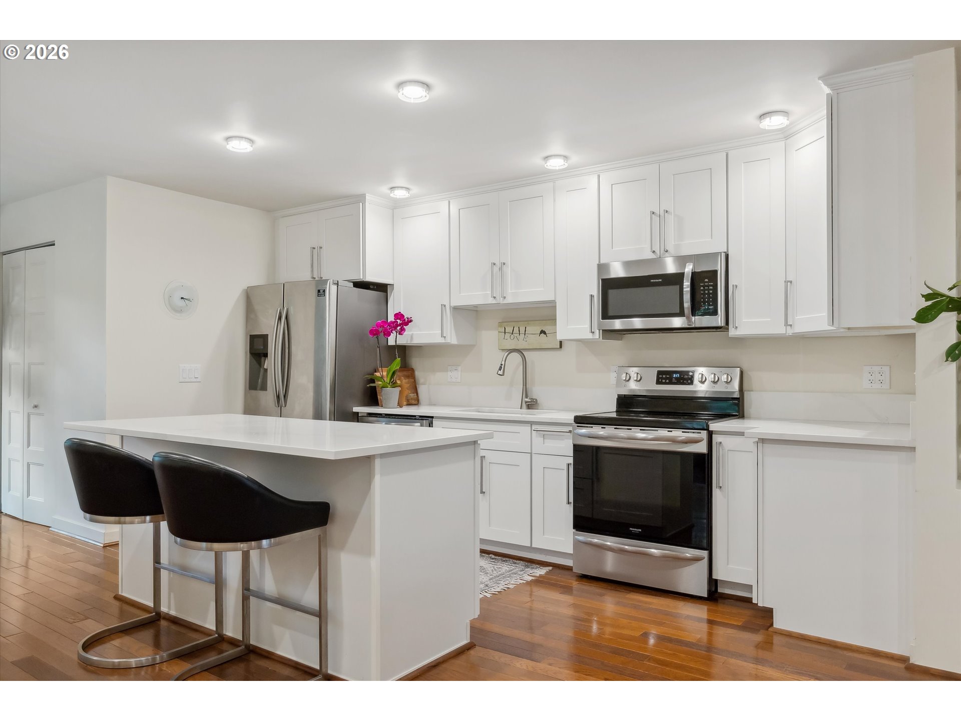 Dishwasher, Disposal, FreeStandingRange, FreeStandingRefrigerator, Island, Quartz, StainlessSteelAppliance