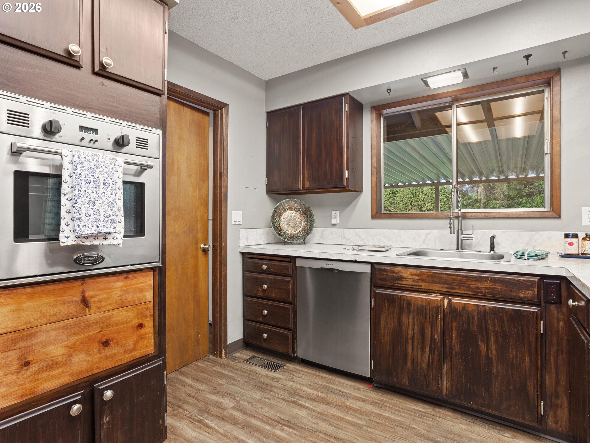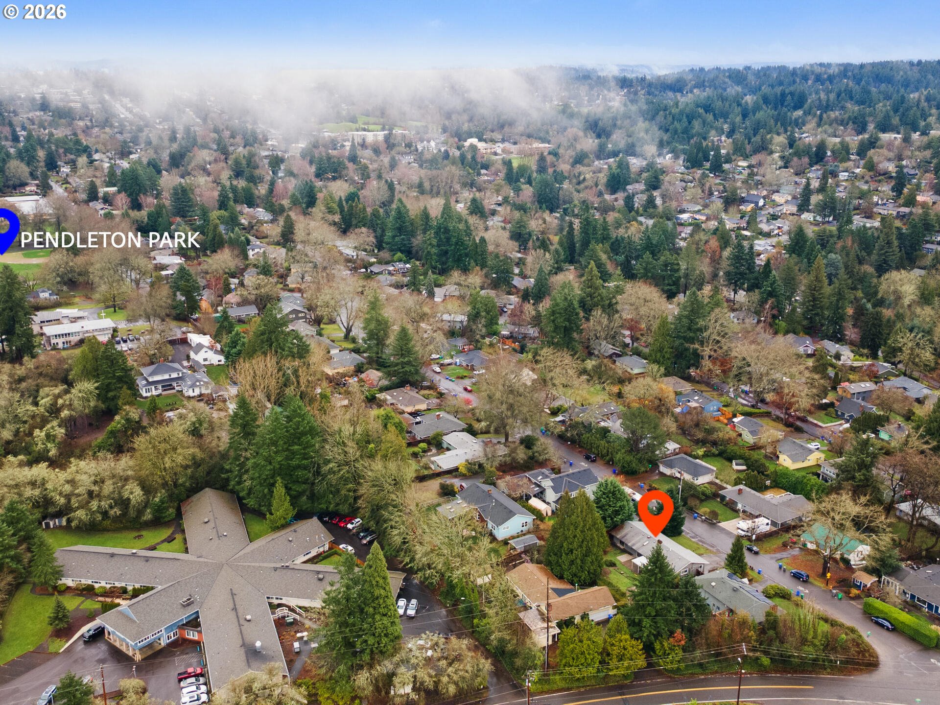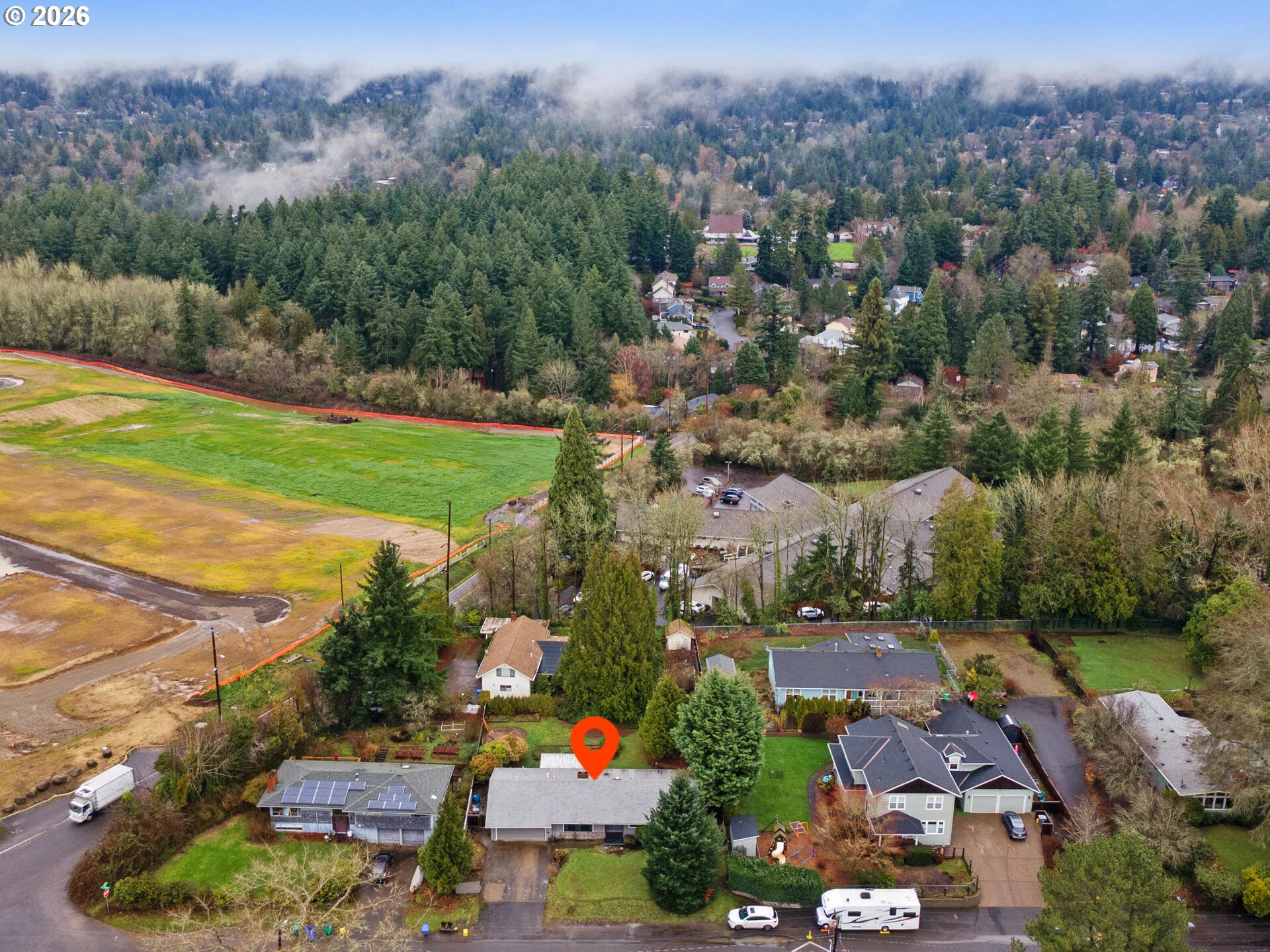 Mid-Century Modern Ranch Dream in Excellent Vermont Hills Location! Enter the hand scraped wood entry through oversized double doors, into this tastefully updated home, with thoughtful consideration to character and charm of mid-century living. Hand crafted wood paneled entry cove bench with area for shoe and coat storage, vinyl plank wood like floors throughout. Open living room with stately double sided brick fireplace, complete with large picture windows, overlooks the tree lined view of SW Portland. Spacious kitchen with plenty of storage and stainless steel appliances. Dining area with double doors leading to terraced backyard, garden beds, flat seating or possible firepit area, and hot tub pad with hookup. 3 full bedrooms, complete with primary suite and full updated bath with poured concrete countertops, custom overmount sink, and designer mirror and lighting. Patio door in primary leading to spacious and private backyard setting, with concrete pad, perfect for patio seating or a hot tub. Built-in shelving and desk in second bedroom. Oversized two car garage with additional workspace for hobbies and toys. Garage stairs lead down to finished storage area, perfect for hobbies, play, storage, or bring your imagination. Pool table included. New 25-year composition roof to be installed and included prior to closing. Open house Sunday, 01/11, from 11am - 1pm. [Home Energy Score = 5. HES Report at https://rpt.greenbuildingregistry.com/hes/OR10243343]