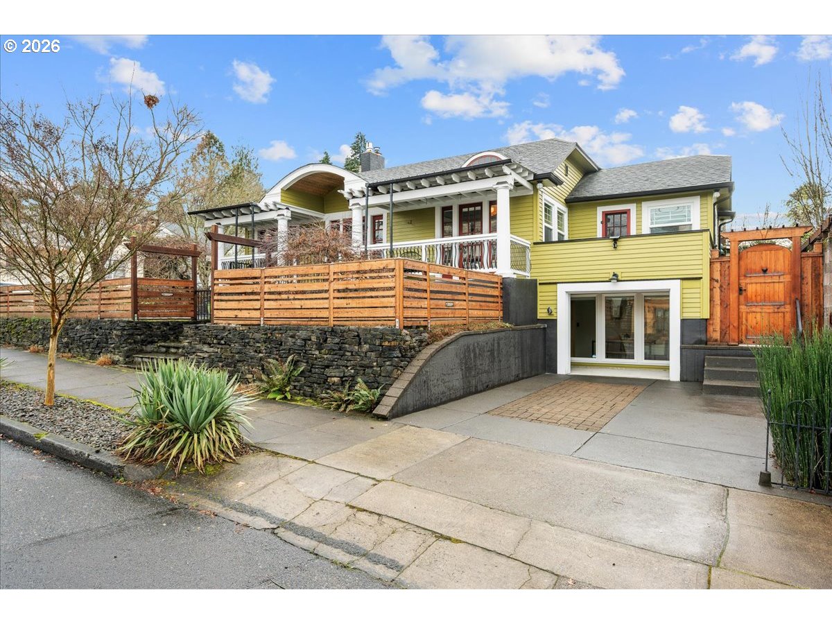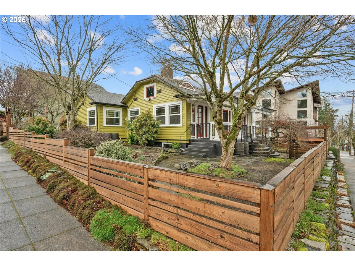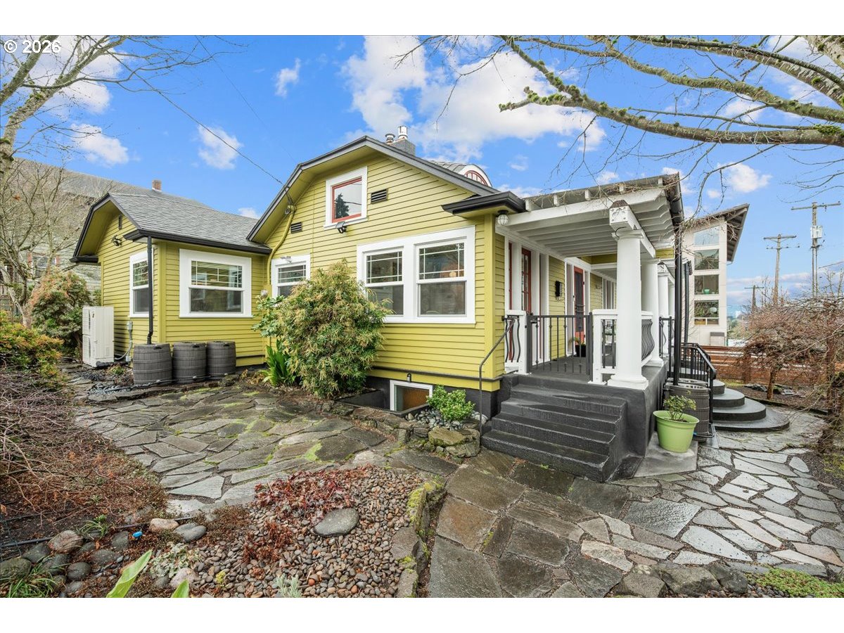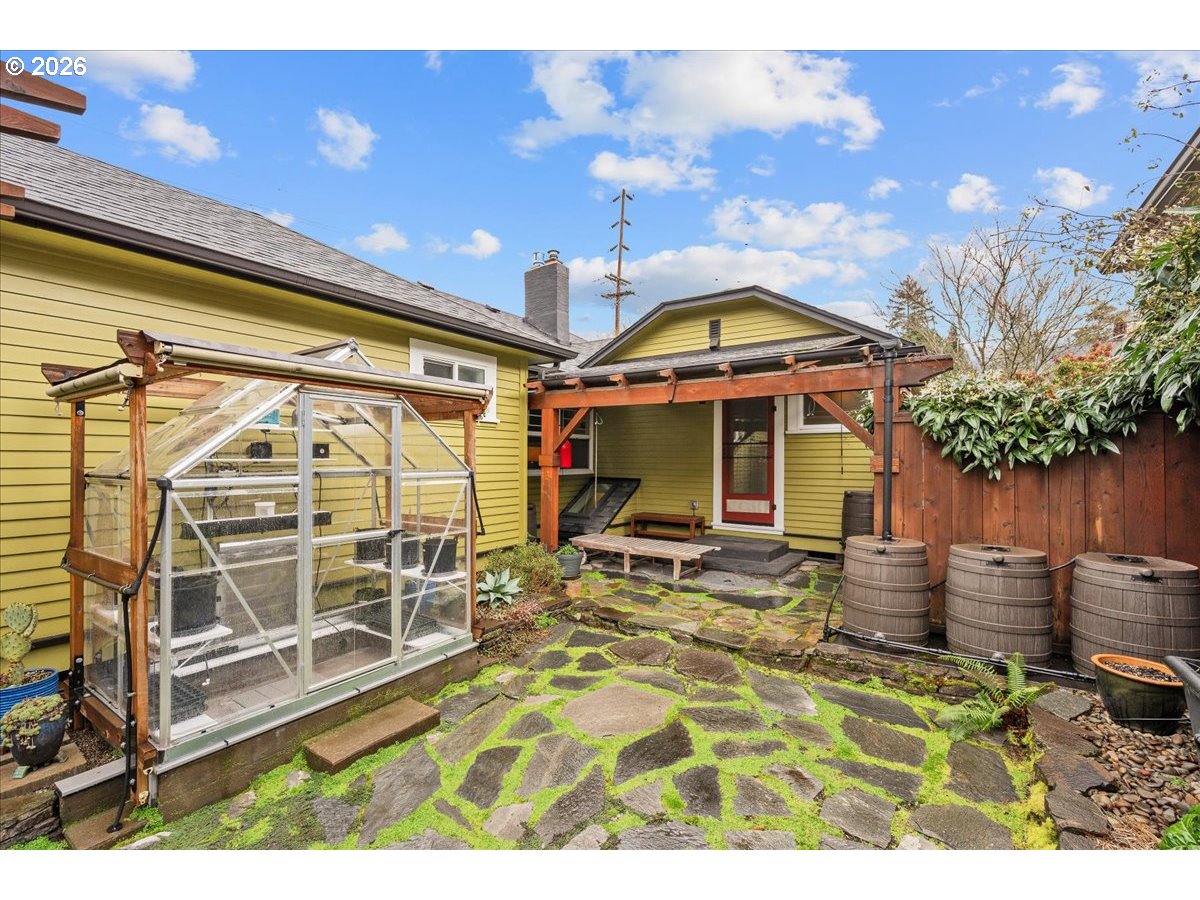 This Lovingly Mt. Tabor home has been transformed over the past two decades, the home blends timeless character with modern comfort and thoughtful sustainability. Bathed in natural light from abundant windows — including an entire front wall of glass — the interior feels bright, open, and welcoming, with an easy connection to the outdoors. The updated kitchen features quartz countertops, upgraded appliances, charming mid-century cabinetry, and a delightful east-facing breakfast nook — perfect for morning coffee. A cute, convenient main-level half bath sits between the kitchen and private backyard, enhancing seamless indoor-outdoor living. Designer flooring, refreshed fireplace tile, fresh paint, and updated lighting elevate the main level. The second bedroom features glass French doors making it a lovely bedroom or a bright home office. The primary suite offers a peaceful retreat with an updated bath, walk-in closet, and tropical hardwood deck. The flexible lower level includes 1 bedroom, family/living room, kitchenette, dining area, laundry, and an awesome bathroom — ideal for guests, extended living, or income potential. Outside, thoughtfully designed landscaping creates a private sanctuary with raised beds, rock walls, flagstone pathways, pergola, and automated greenhouse — supported by comprehensive drainage and rainwater systems. Extensive system upgrades — including roof, siding, plumbing, electrical, windows, high-efficiency heating and cooling, sump pump with backup, earthquake shutoff valve, and smart features — provide lasting confidence. All of this character and peace of mind just minutes from Mt. Tabor Park, neighborhood restaurants, and local shops! [Home Energy Score = 5. HES Report at https://rpt.greenbuildingregistry.com/hes/OR10244702]