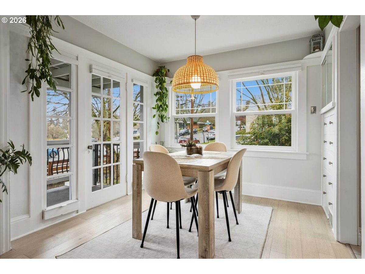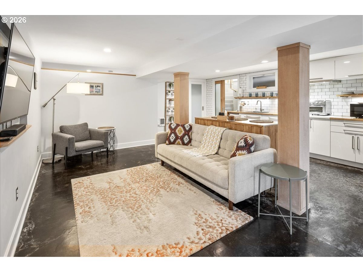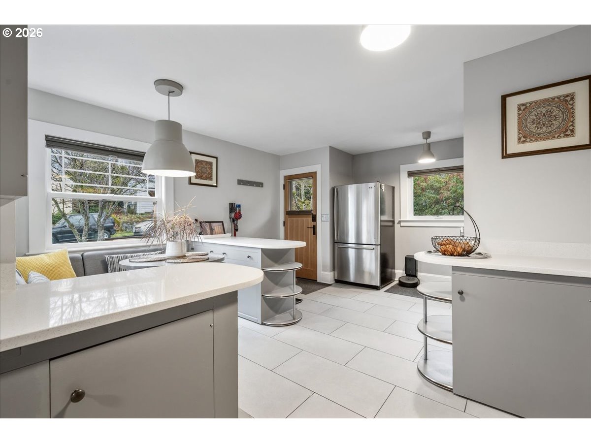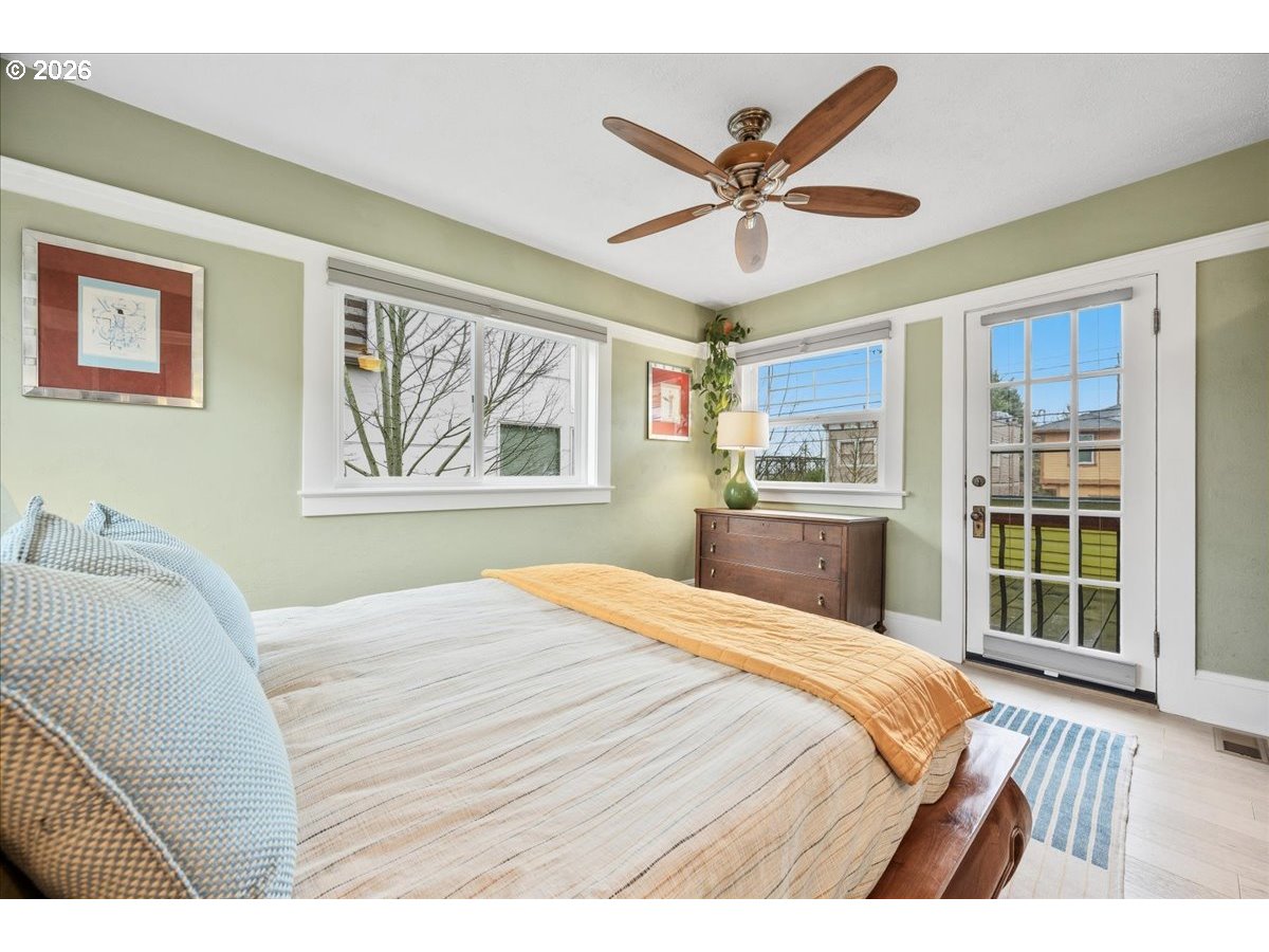 This Lovingly Mt. Tabor home has been transformed over the past two decades, the home blends timeless character with modern comfort and thoughtful sustainability. Bathed in natural light from abundant windows — including an entire front wall of glass — the interior feels bright, open, and welcoming, with an easy connection to the outdoors. The updated kitchen features quartz countertops, upgraded appliances, charming mid-century cabinetry, and a delightful east-facing breakfast nook — perfect for morning coffee. A cute, convenient main-level half bath sits between the kitchen and private backyard, enhancing seamless indoor-outdoor living. Designer flooring, refreshed fireplace tile, fresh paint, and updated lighting elevate the main level. The second bedroom features glass French doors making it a lovely bedroom or a bright home office. The primary suite offers a peaceful retreat with an updated bath, walk-in closet, and tropical hardwood deck. The flexible lower level includes 1 bedroom, family/living room, kitchenette, dining area, laundry, and an awesome bathroom — ideal for guests, extended living, or income potential. Outside, thoughtfully designed landscaping creates a private sanctuary with raised beds, rock walls, flagstone pathways, pergola, and automated greenhouse — supported by comprehensive drainage and rainwater systems. Extensive system upgrades — including roof, siding, plumbing, electrical, windows, high-efficiency heating and cooling, sump pump with backup, earthquake shutoff valve, and smart features — provide lasting confidence. All of this character and peace of mind just minutes from Mt. Tabor Park, neighborhood restaurants, and local shops! [Home Energy Score = 5. HES Report at https://rpt.greenbuildingregistry.com/hes/OR10244702]