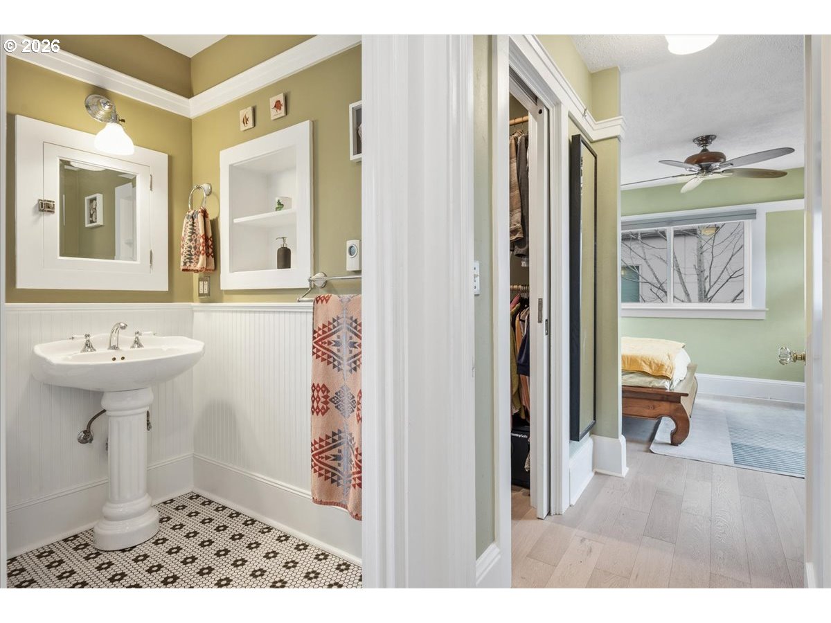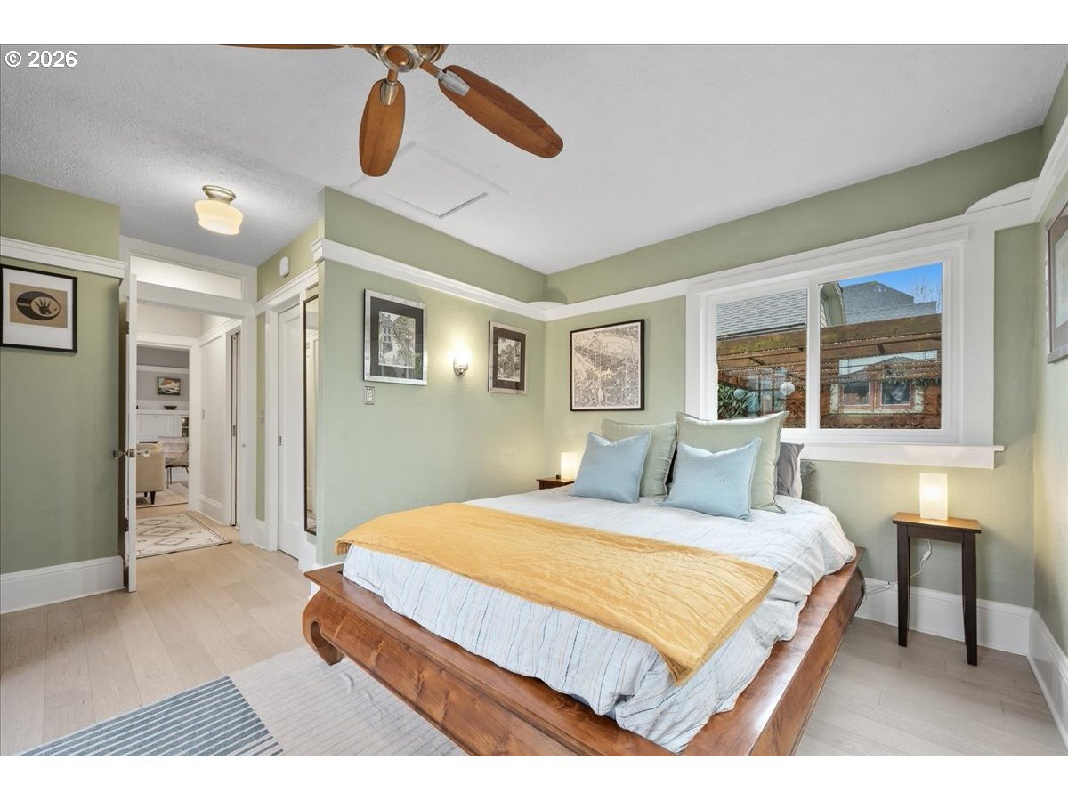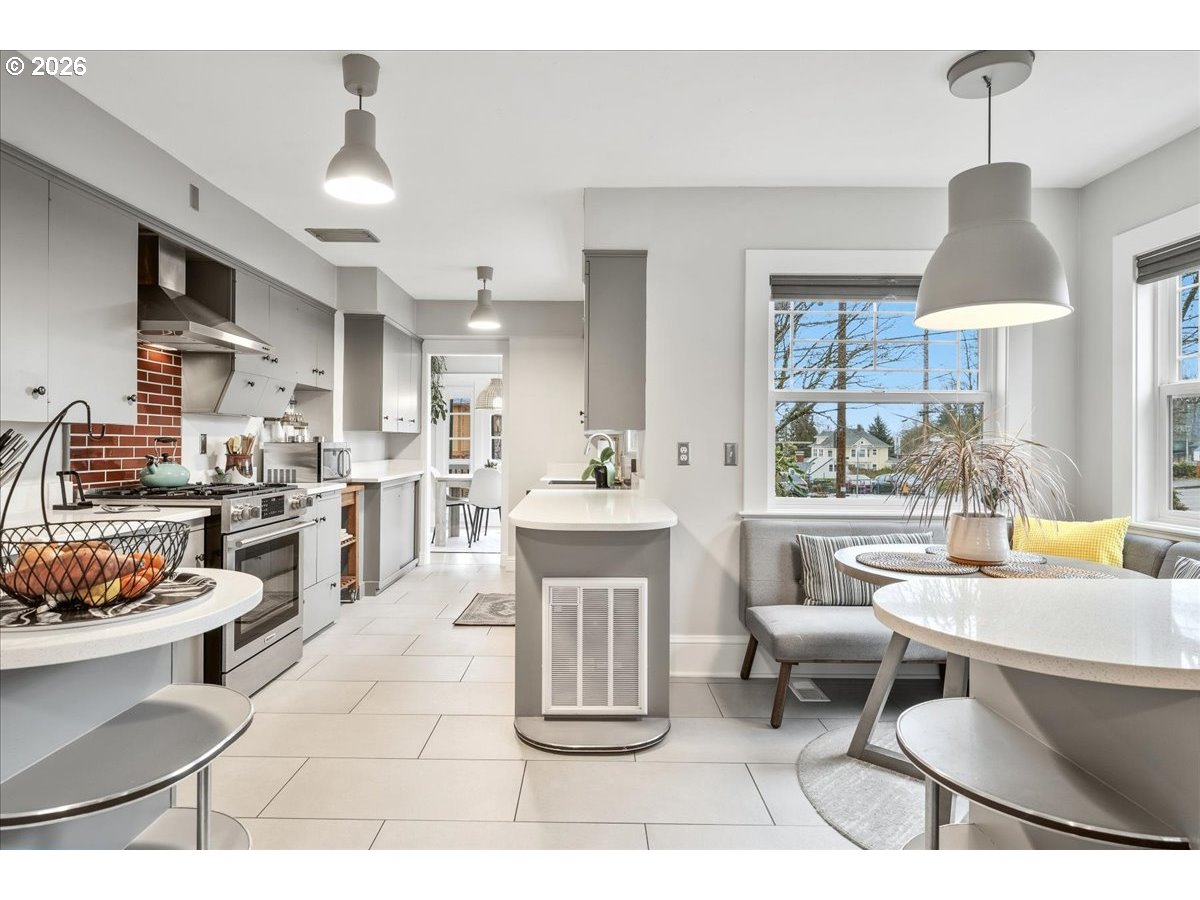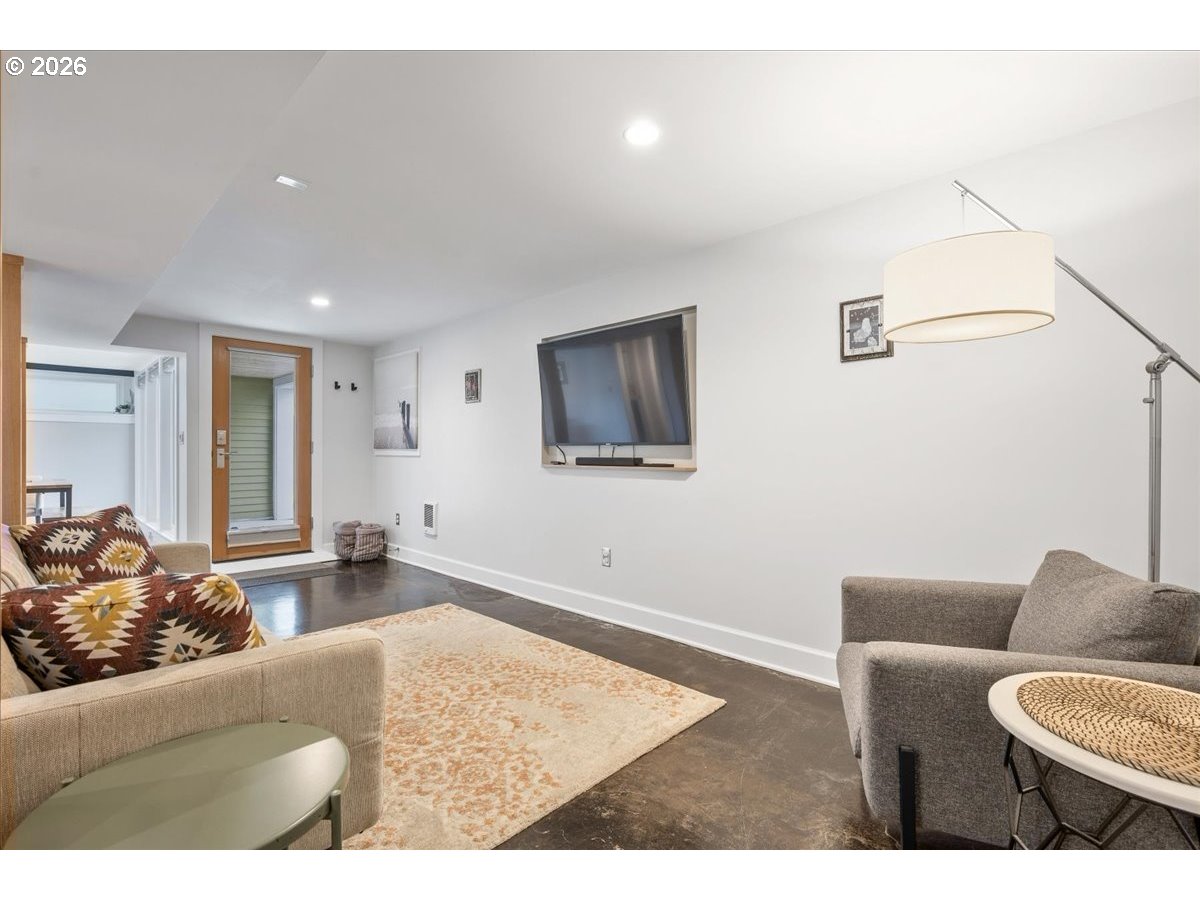 This Lovingly Mt. Tabor home has been transformed over the past two decades, the home blends timeless character with modern comfort and thoughtful sustainability. Bathed in natural light from abundant windows — including an entire front wall of glass — the interior feels bright, open, and welcoming, with an easy connection to the outdoors. The updated kitchen features quartz countertops, upgraded appliances, charming mid-century cabinetry, and a delightful east-facing breakfast nook — perfect for morning coffee. A cute, convenient main-level half bath sits between the kitchen and private backyard, enhancing seamless indoor-outdoor living. Designer flooring, refreshed fireplace tile, fresh paint, and updated lighting elevate the main level. The second bedroom features glass French doors making it a lovely bedroom or a bright home office. The primary suite offers a peaceful retreat with an updated bath, walk-in closet, and tropical hardwood deck. The flexible lower level includes 1 bedroom, family/living room, kitchenette, dining area, laundry, and an awesome bathroom — ideal for guests, extended living, or income potential. Outside, thoughtfully designed landscaping creates a private sanctuary with raised beds, rock walls, flagstone pathways, pergola, and automated greenhouse — supported by comprehensive drainage and rainwater systems. Extensive system upgrades — including roof, siding, plumbing, electrical, windows, high-efficiency heating and cooling, sump pump with backup, earthquake shutoff valve, and smart features — provide lasting confidence. All of this character and peace of mind just minutes from Mt. Tabor Park, neighborhood restaurants, and local shops! [Home Energy Score = 5. HES Report at https://rpt.greenbuildingregistry.com/hes/OR10244702]