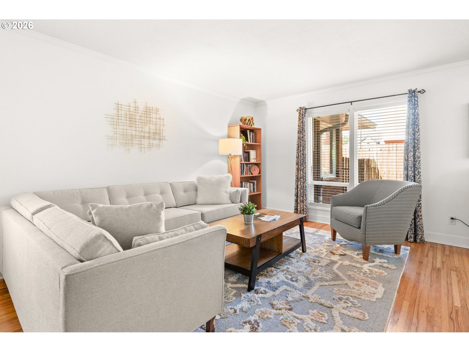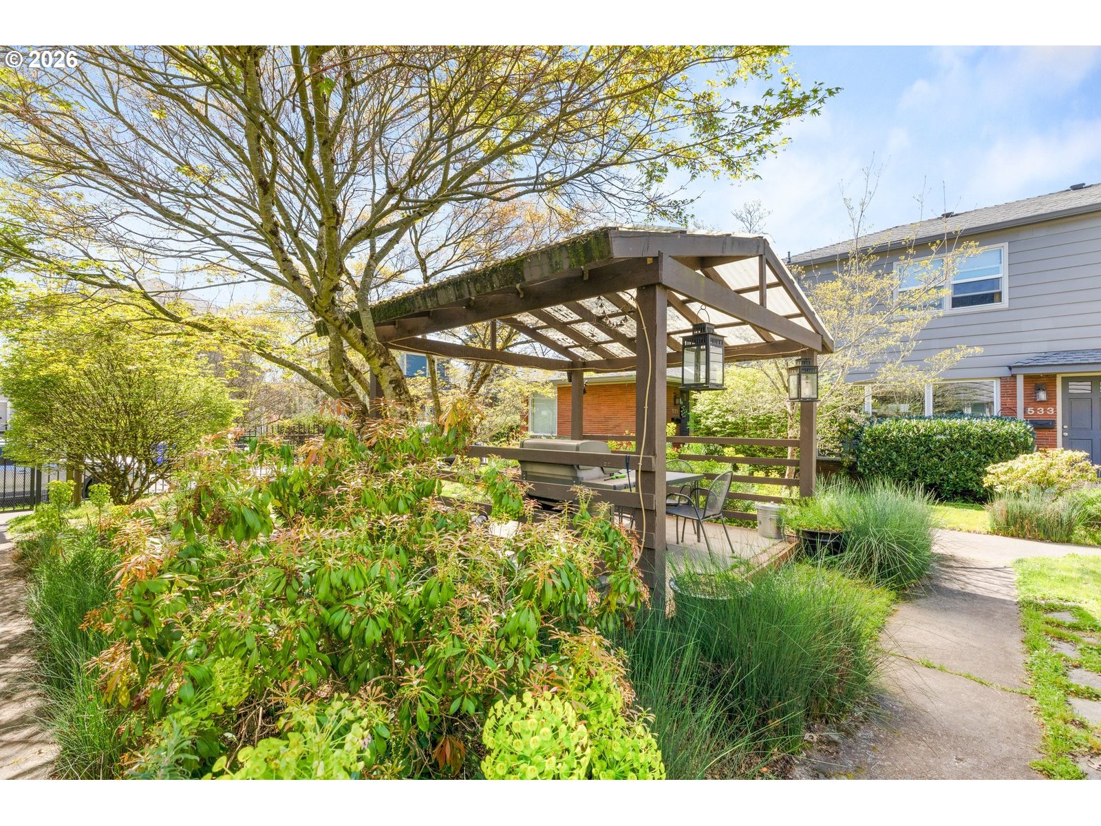 OPEN SATURDAY 12-2. Timeless Mid-Century NE Portland condo with modern updates. Period details include classic clean lines, wrought iron staircase rail, and true hardwood floors throughout. Great natural light with generous main floor living and formal dining. Kitchen features granite counters with full backsplash and tile floor. Upstairs has two large bedrooms, updated bathroom, and washer/dryer. Interior access to a sizeable private 143 sq ft storage unit. Outside enjoy the lovely, landscaped courtyard and dine or relax under the gazebo. Roof (2018), new electric panel (2024), and newer PEX plumbing. Includes a deeded parking space. Great location and just minutes to Alberta Arts District and the Dekum Triangle. Don’t miss this wonderful home!