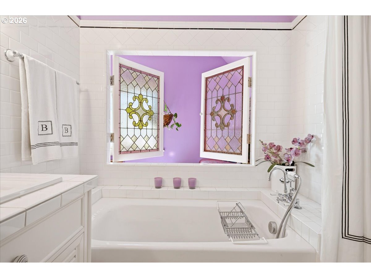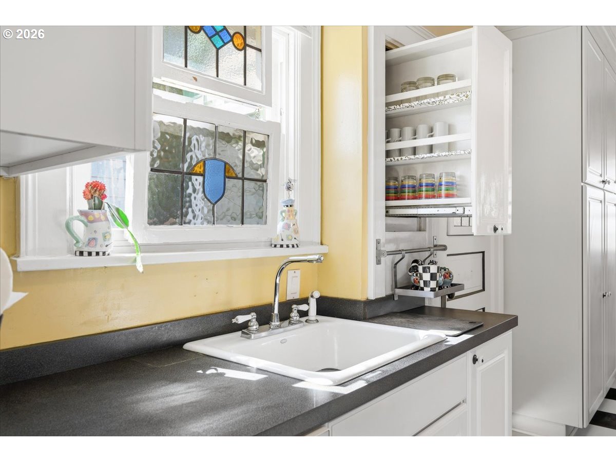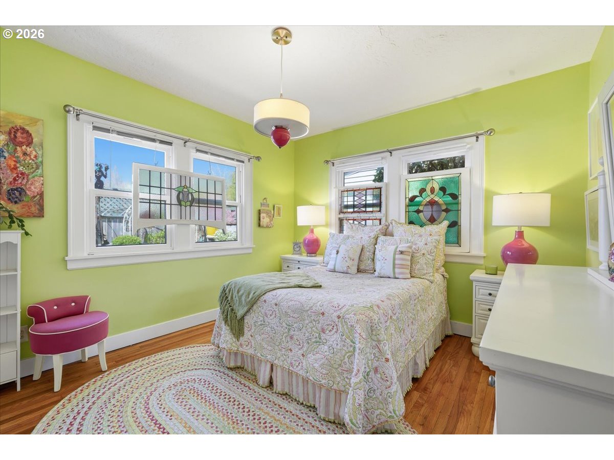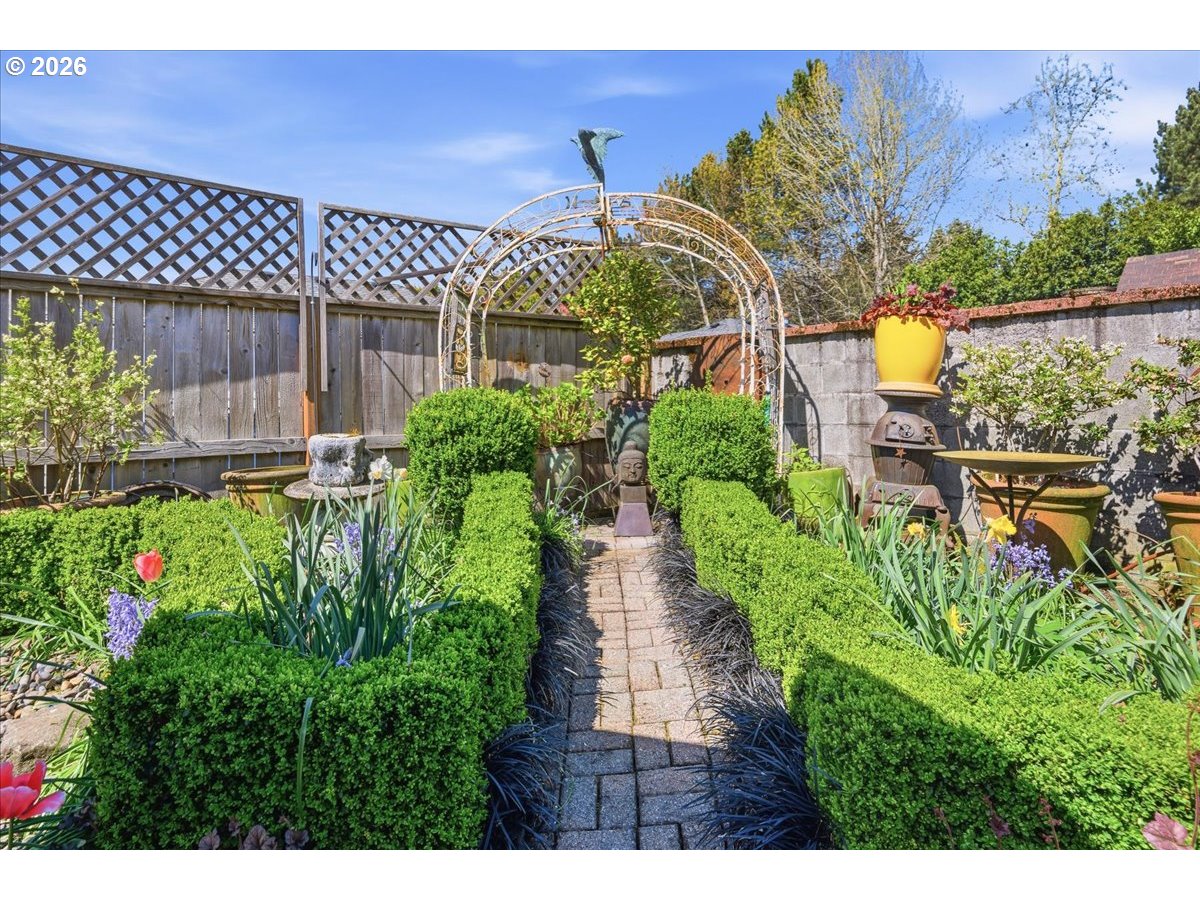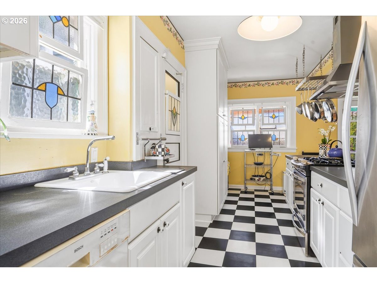 Own a truly special piece of Portland history with this beautifully updated 1924 English Cottage, ideally located on famed Peacock Lane. Set in one of the city’s most magical neighborhoods—renowned for its storybook charm and beloved holiday light displays—this home offers a rare blend of vintage character and thoughtful updates. Inside, timeless architectural details shine, including hardwood floors, leaded glass windows, and charming arched nooks. The inviting living room features a classic Pratt & Larson tile-surround fireplace and flows into a formal dining room with a vintage built-in showcasing leaded glass doors. The updated kitchen pairs modern convenience—stainless steel appliances, gas range, and solid surface counters—with delightful original touches like a cold storage cabinet. An adjacent eating area provides additional cabinetry, pantry storage, main-level laundry, and French doors that open to a beautifully landscaped backyard garden. The main level also includes a spacious bedroom and a full bath with updated period tile. Upstairs, a loft-style sitting area and office lead to the primary bedroom, complete with 3 generous closets and a beautifully updated full bath featuring a soaking tub and stained-glass windows. The private backyard is a lush retreat with a patio, water feature, blueberry and raspberry plantings, 2 Meyer lemon trees, and a greenhouse—perfect for gardeners and outdoor enthusiasts alike. Additional amenities include a 1-car garage and full basement. Located in a sought-after inner SE Portland neighborhood, you’re just moments from Laurelhurst park, vibrant shopping districts, local restaurants, cafés, and convenient bikeways. This is more than a home—it’s a rare opportunity to live in one of Portland’s most cherished historic communities. [Home Energy Score = 2. HES Report at https://rpt.greenbuildingregistry.com/hes/OR10246637]