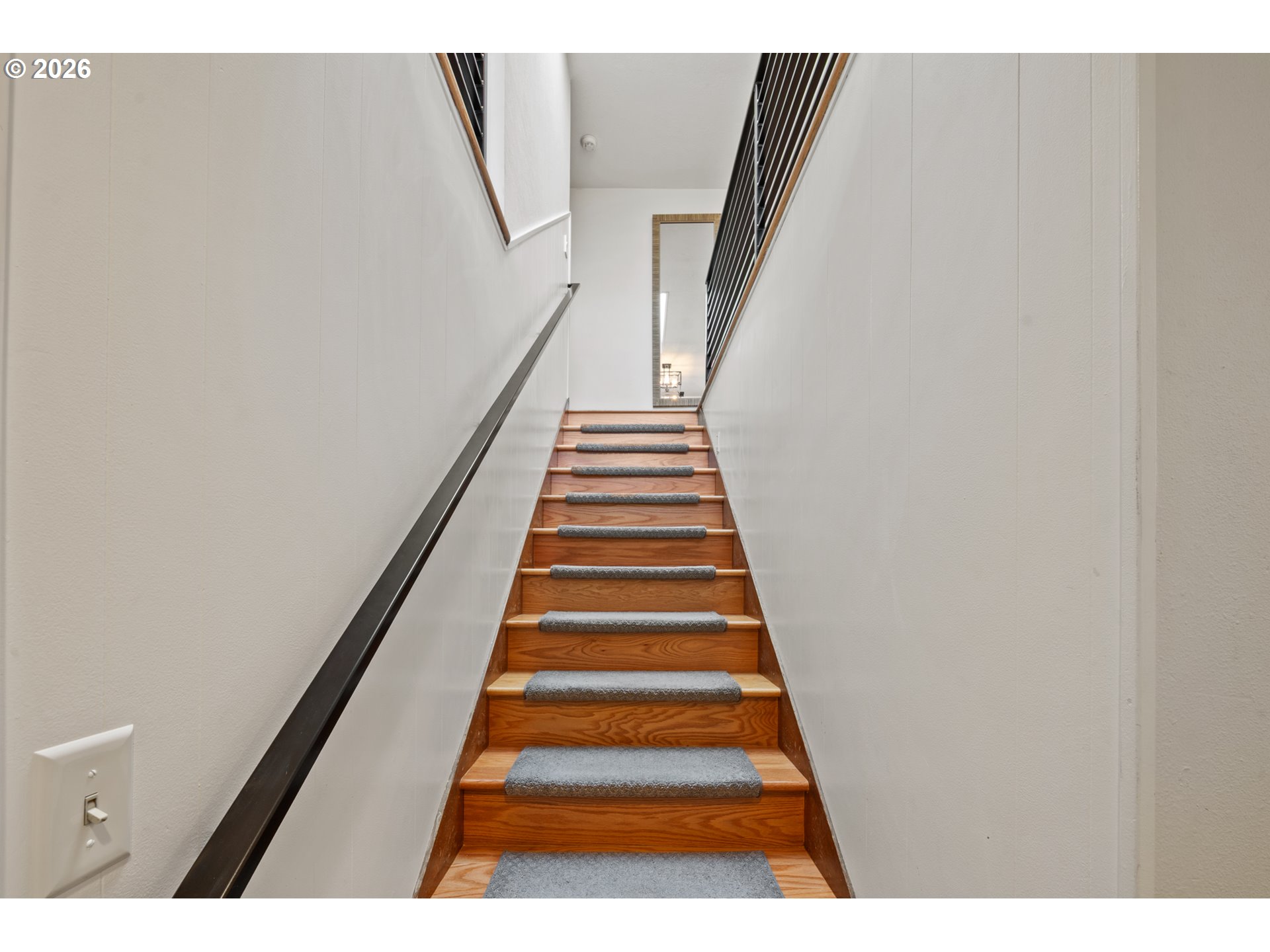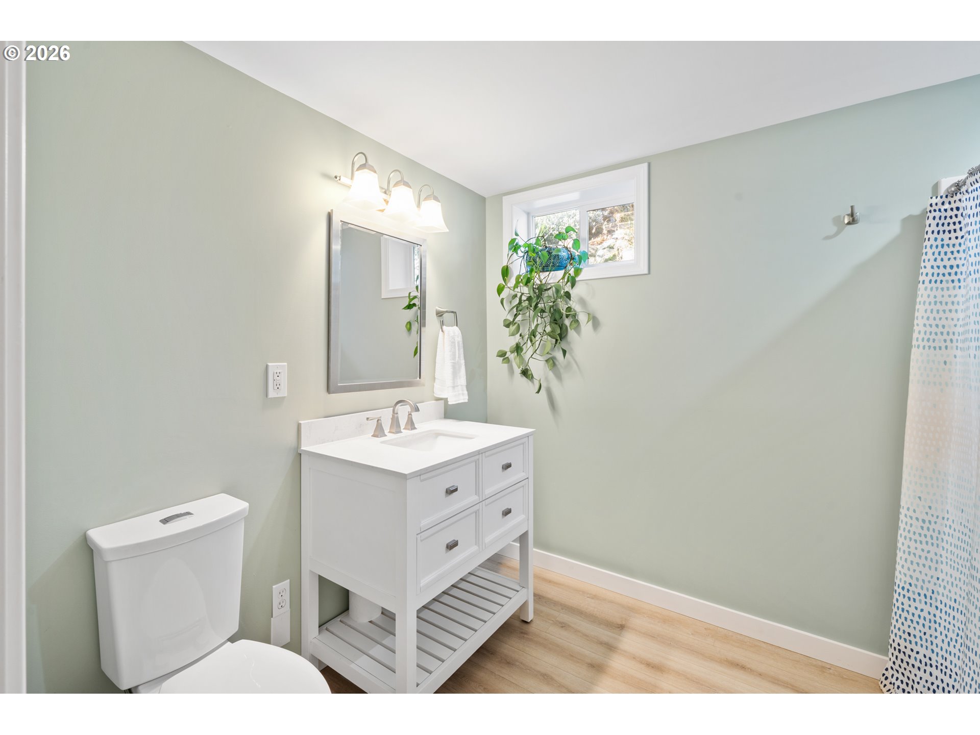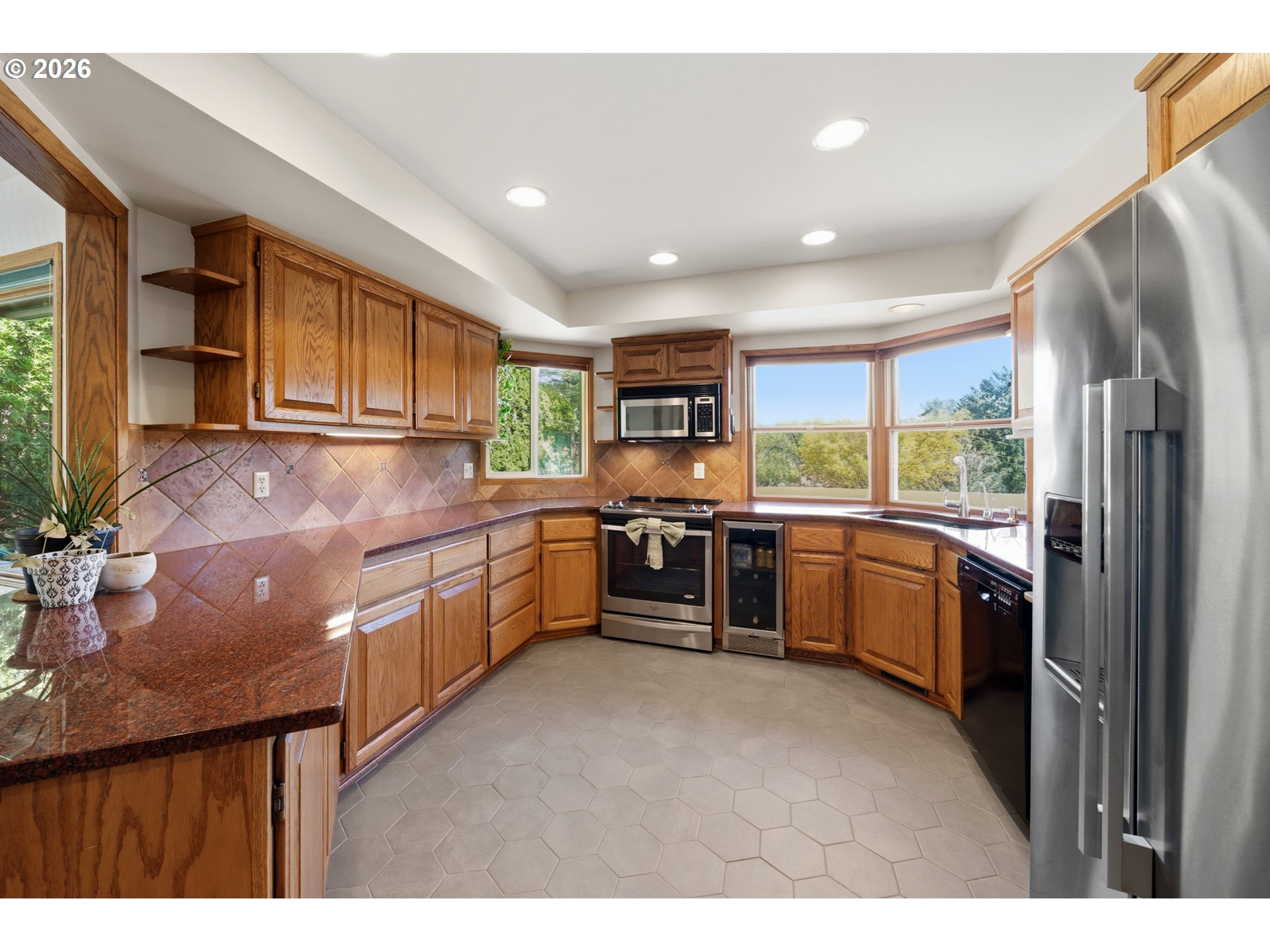 Perched on a prominent corner lot with sweeping views, this classic mid-century home is airy, inviting, and filled with natural light. The true showstopper is the fully fenced backyard, complete with a terraced pond, blueberries, strawberries, raspberries, plum trees, and ample sunny space for raised beds. Inside, the lower level provides exceptional flexibility with a full kitchen, living and dining areas, two bedrooms, a full bathroom, and a gas fireplace, perfect for guests, rental income, or multi-generational living. Upstairs the living room, anchored by a wood-burning fireplace, connects to the dining room, sunroom, kitchen, and den, creating an ideal layout for both everyday living and entertaining. The primary suite offers a peaceful retreat, complete with a gas fireplace, smart-control shades, and an updated walk-in closet. The recently renovated ensuite bathroom features new tile flooring, a large walk-in shower, and his-and-hers sinks. The sunroom opens to a wooden deck and is ideal as a den, office, or studio. Additional highlights include a large laundry room, abundant storage throughout, and a two-car garage equipped with an EV charger. Located in SW Portland’s Hayhurst neighborhood, just moments from Gabriel Park and close to popular dining and everyday conveniences, this is a home designed for comfort, flexibility, and lasting enjoyment.