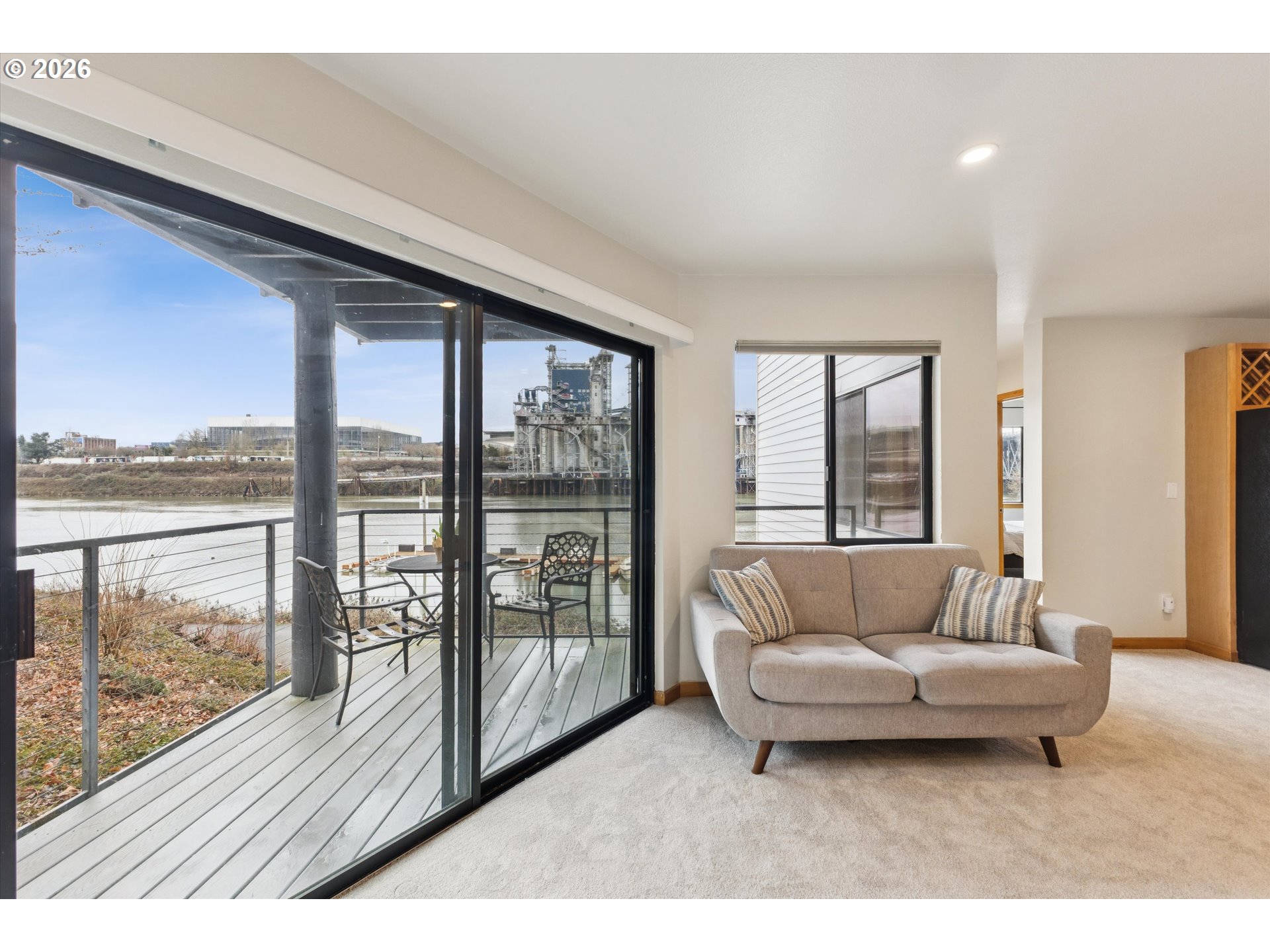 Best views on the market at this price! Tranquil water views fill every window, creating a peaceful backdrop for daily living. The open great room with kitchen island is ideal for gathering, while the spacious deck invites slow mornings with coffee and relaxed evenings with a glass of wine overlooking the river.Fresh new carpet throughout, and the newly renovated bathroom features a walk-in shower and beautiful tile work, adding a fresh, modern feel. Residents enjoy access to a riverfront walk along with community amenities including a pool, hot tub, BBQ area, and firepit. Boat and dock options are also available for those wanting to fully embrace the waterfront lifestyle. Offered fully furnished, this home is move-in ready and presents a potential short-term rental opportunity. One deeded parking space included. Ideally located with easy access to the Pearl District, downtown, and the Eastside. Enjoy a direct view of the iconic grain silos—soon to become a stunning new riverfront destination as part of the 1803 Fund redevelopment.