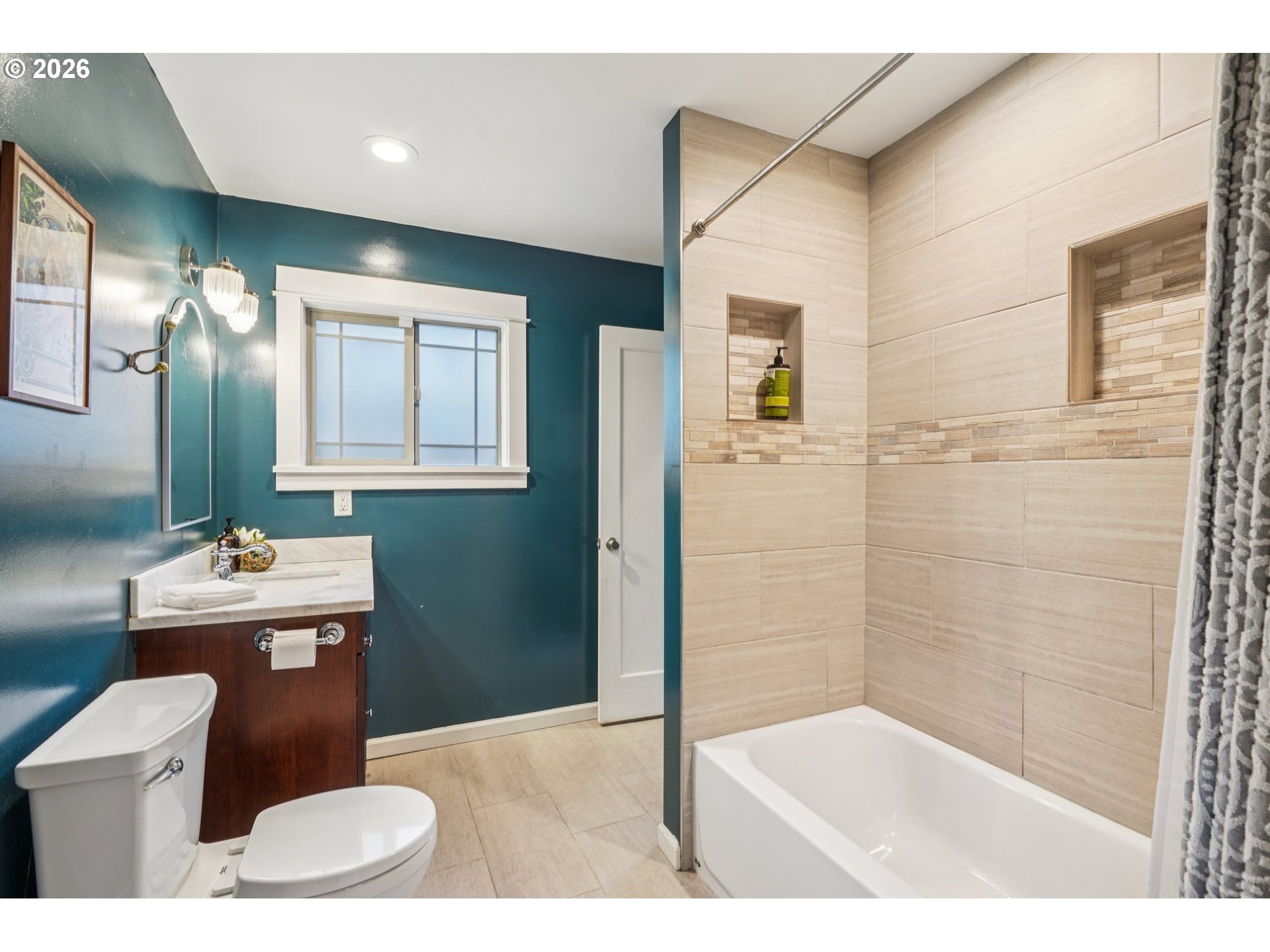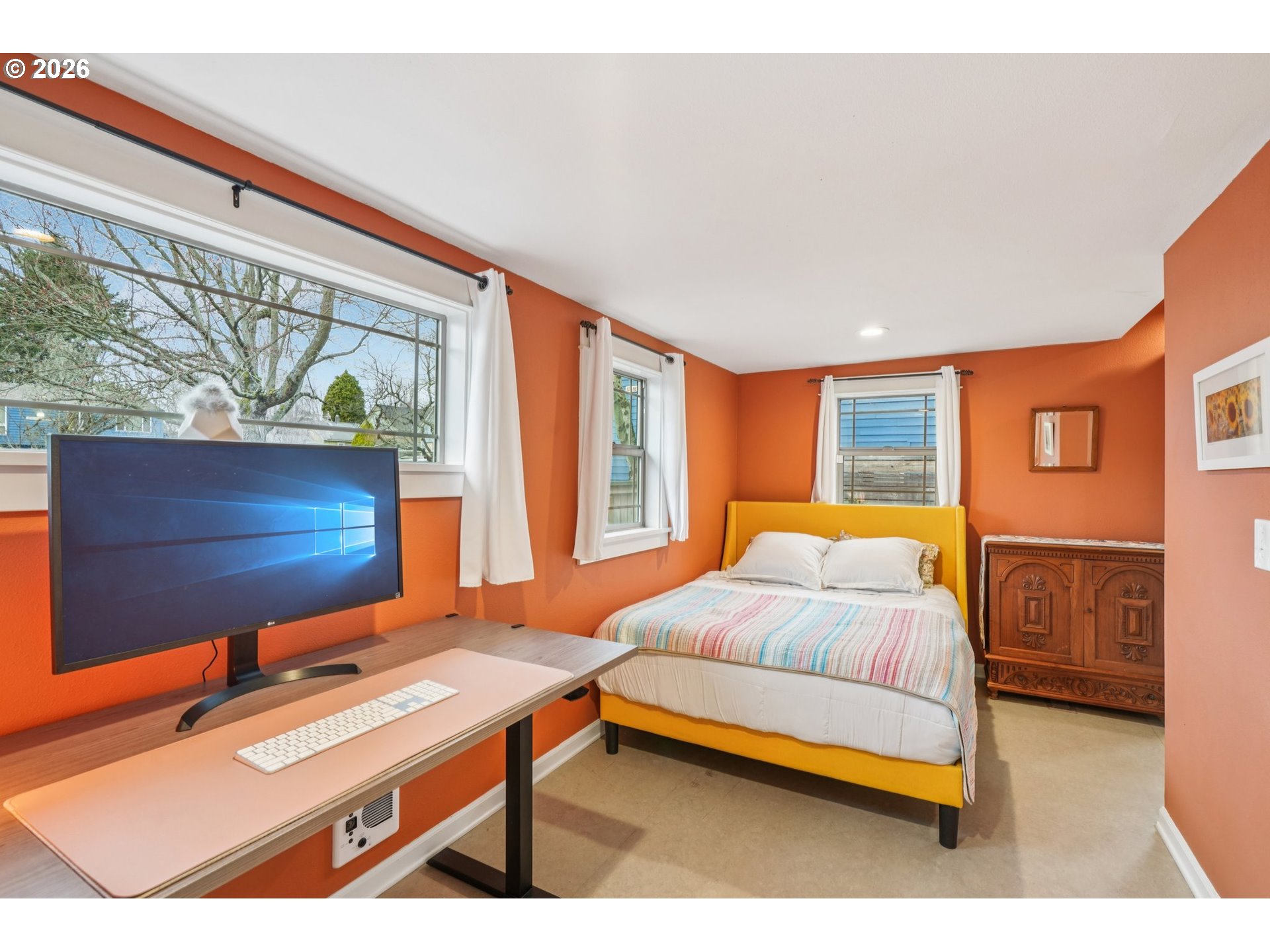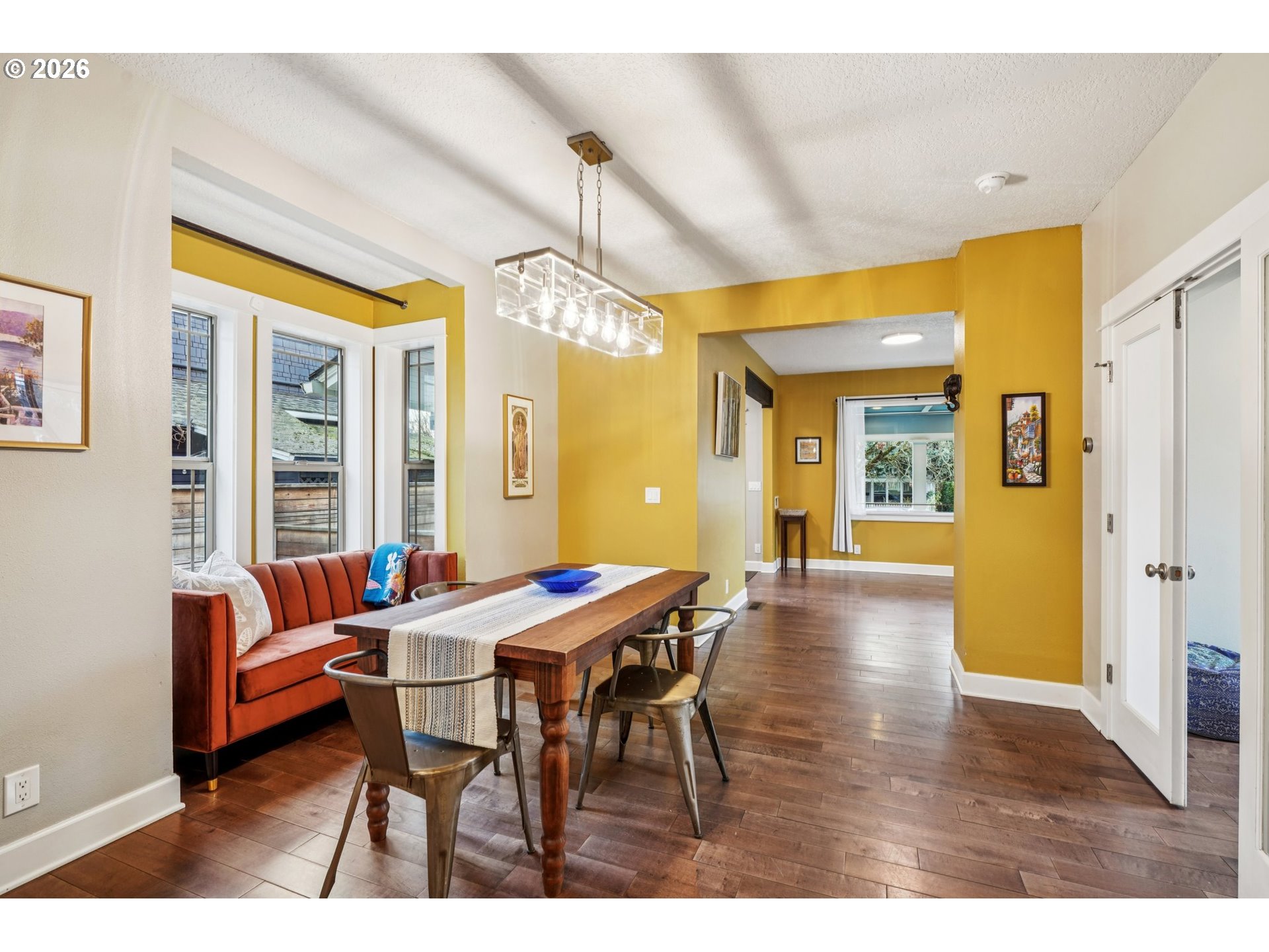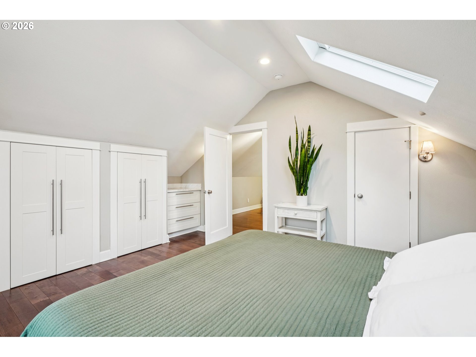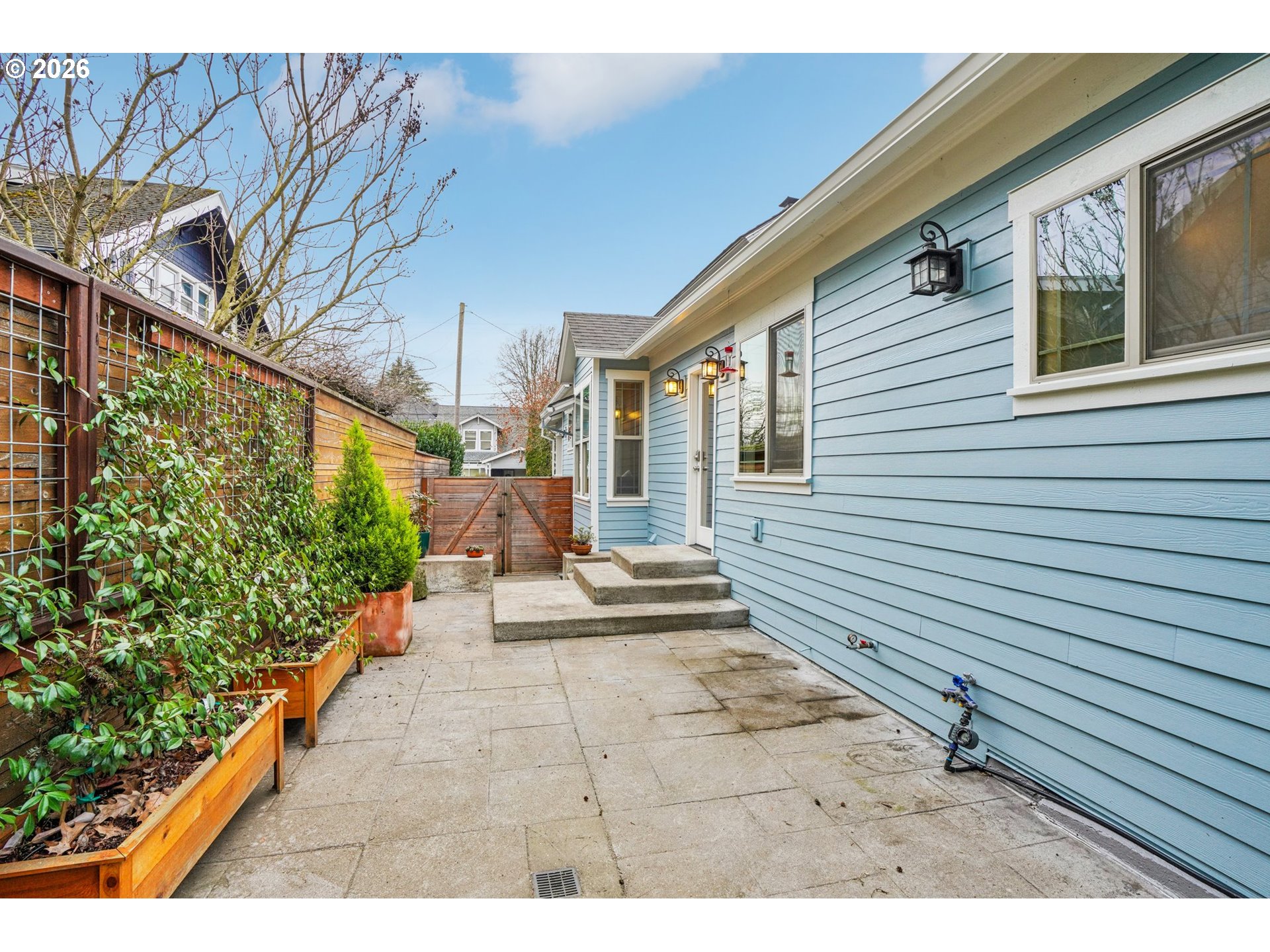 Charming Eliot Home with Modern Luxury & Skyline Views. This beautifully updated Irvington residence blends classic character with thoughtful modern upgrades in a prime Inner Eastside location. The freshly painted exterior (2025) features durable concrete composite siding, Trex decking, and double-pane windows for lasting quality and efficiency. Upstairs, the luxury primary suite serves as a private retreat with vaulted skylights showcasing downtown Portland skyline views, and a spa-inspired bathroom complete with heated floors, built-in towel dryer, and dual shower nozzles. Major infrastructure updates provide true peace of mind, including fully updated electrical, plumbing, sewer, and gas lines (2015), plus a new water heater (2024). The kitchen is appointed with quartz countertops, combining style and functionality. Enjoy outdoor living on a fully fenced lot featuring a new privacy hedge, front and back irrigation, and a welcoming covered front porch with swing. Additional highlights include a partially finished basement with exterior access, ideal for flexible living or storage. Located in a highly walkable, bikeable, and transit-friendly neighborhood near Grant High School, this home is just minutes from Legacy Emanuel Medical Center, Oregon Convention Center, and the Moda Center, along with shopping, dining, and everyday conveniences. A rare blend of historic charm, modern comfort, and exceptional location—this Irvington gem is truly move-in ready. [Home Energy Score = 8. HES Report at https://rpt.greenbuildingregistry.com/hes/OR10018698]