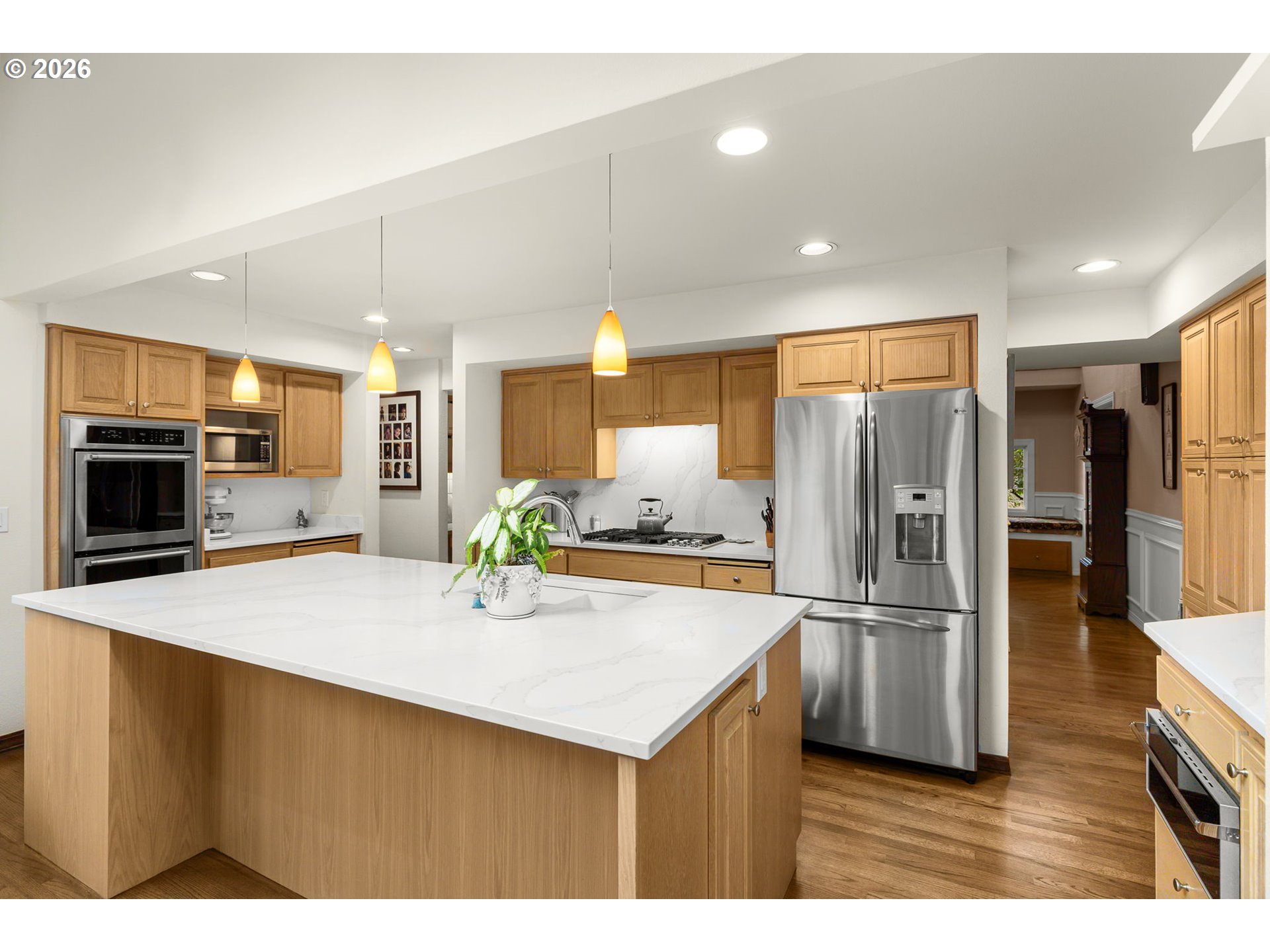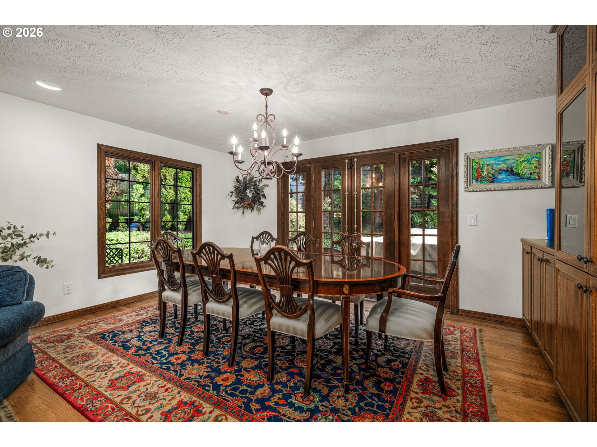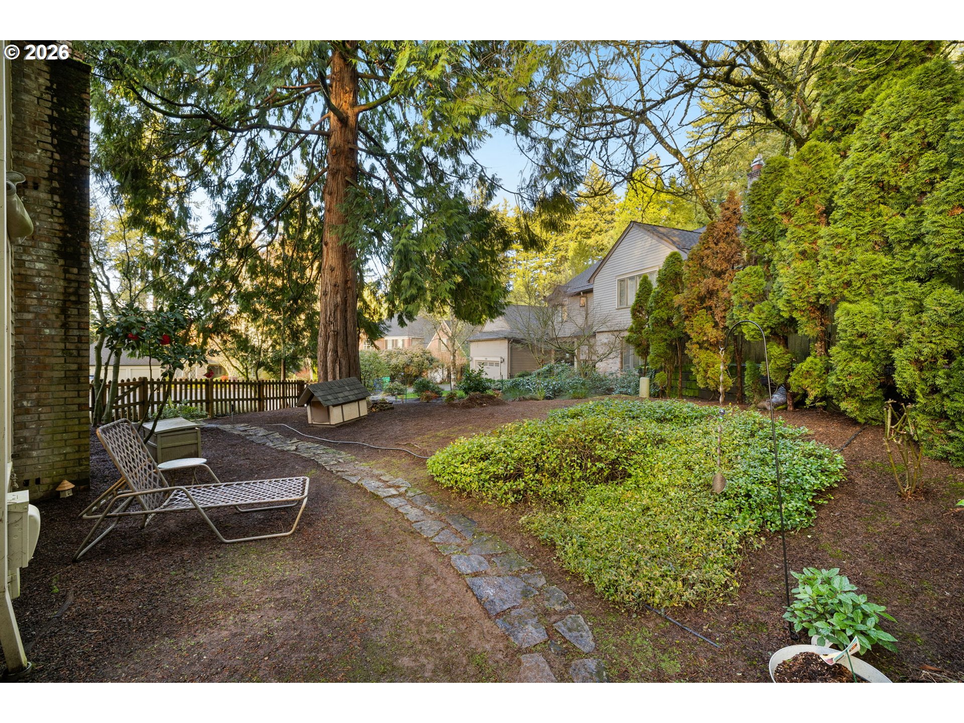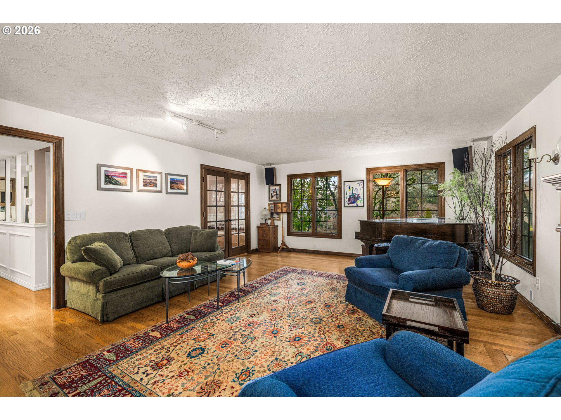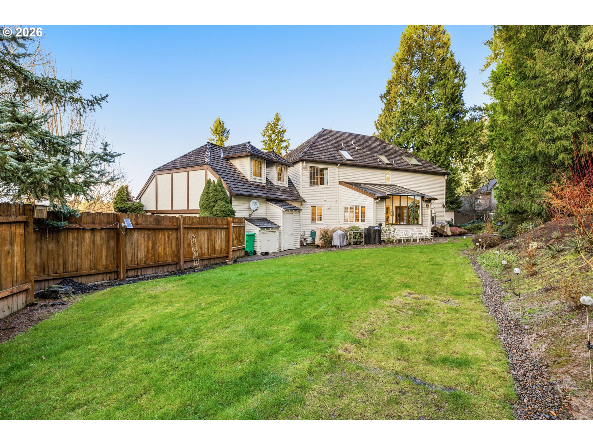 This beautiful English Tutor set on a quiet cut de sac offers privacy, space and convenience. Designed to have light fill every room. Hardwood flooring is through out the expansive living and dining room opening to a beautifully updated kitchen and light filled eating area. The family room offers a cozy tv area and built cabinets for storage. The spacious primary suite comes with dressing room, generous closet space, updated bathroom and sauna. There is a very private and quiet office on the main level. Walking trail within a block leads to Garden Home with shopping, Trader Joe's, and services.
