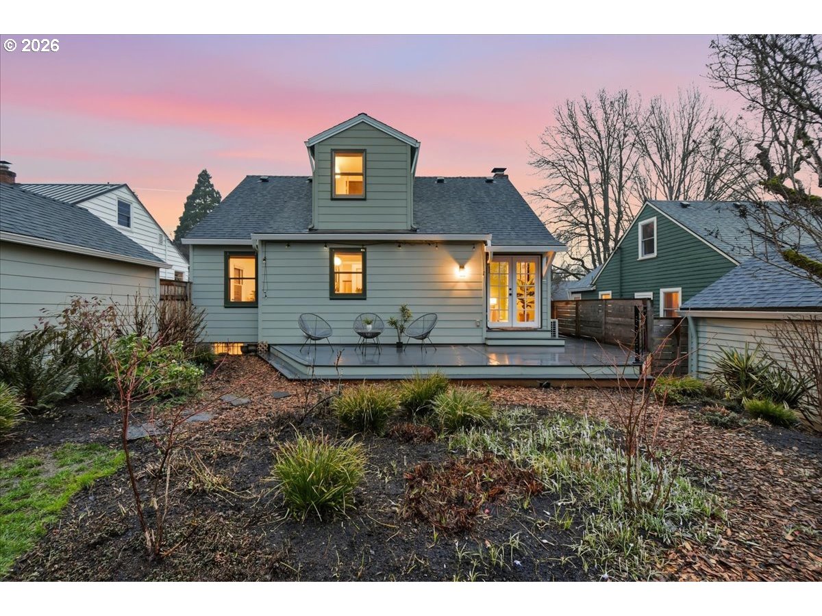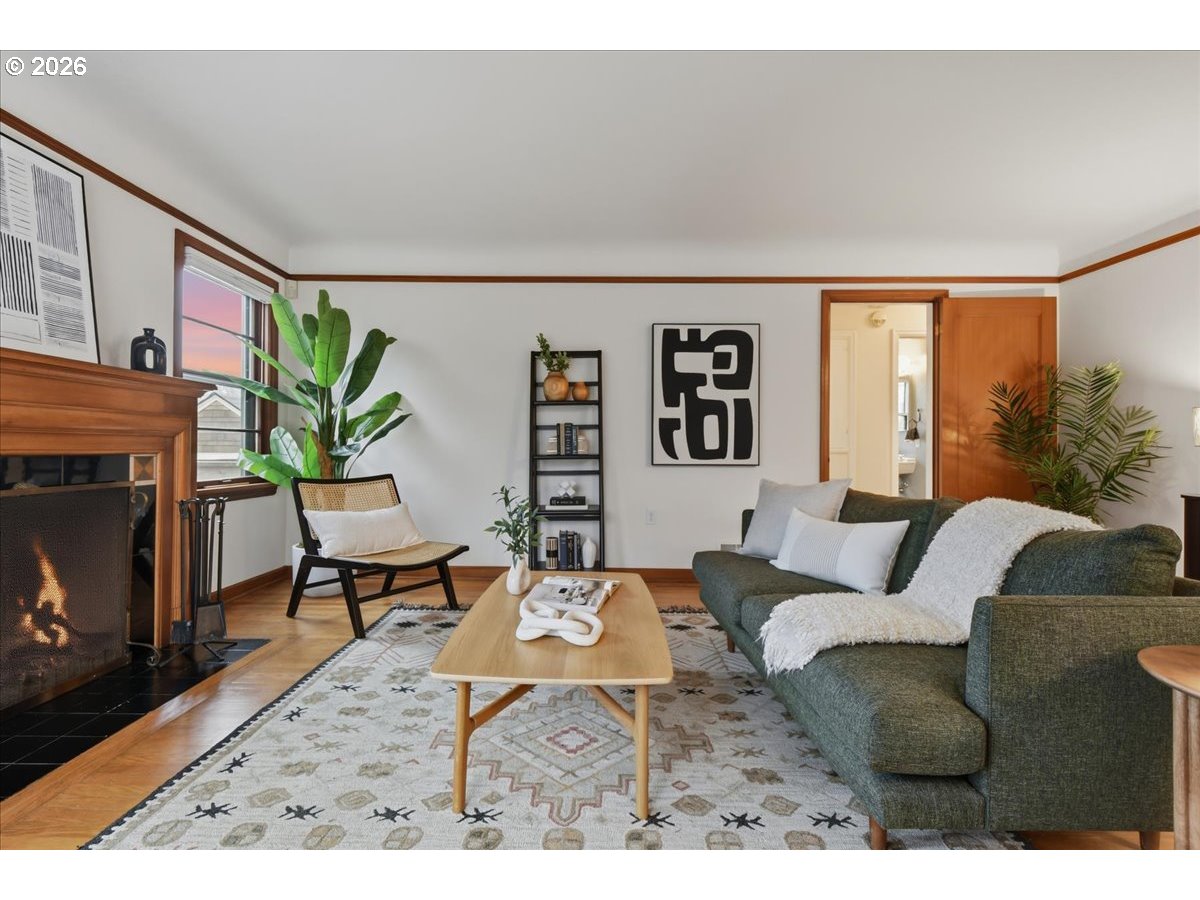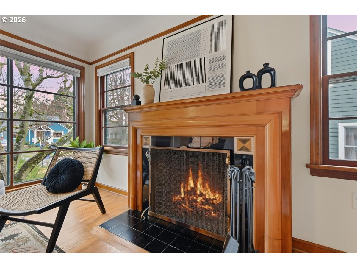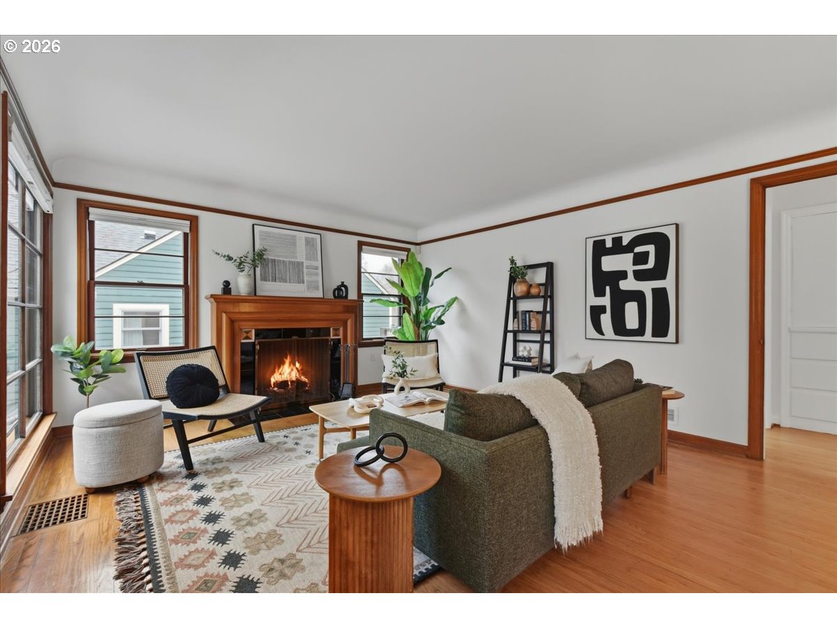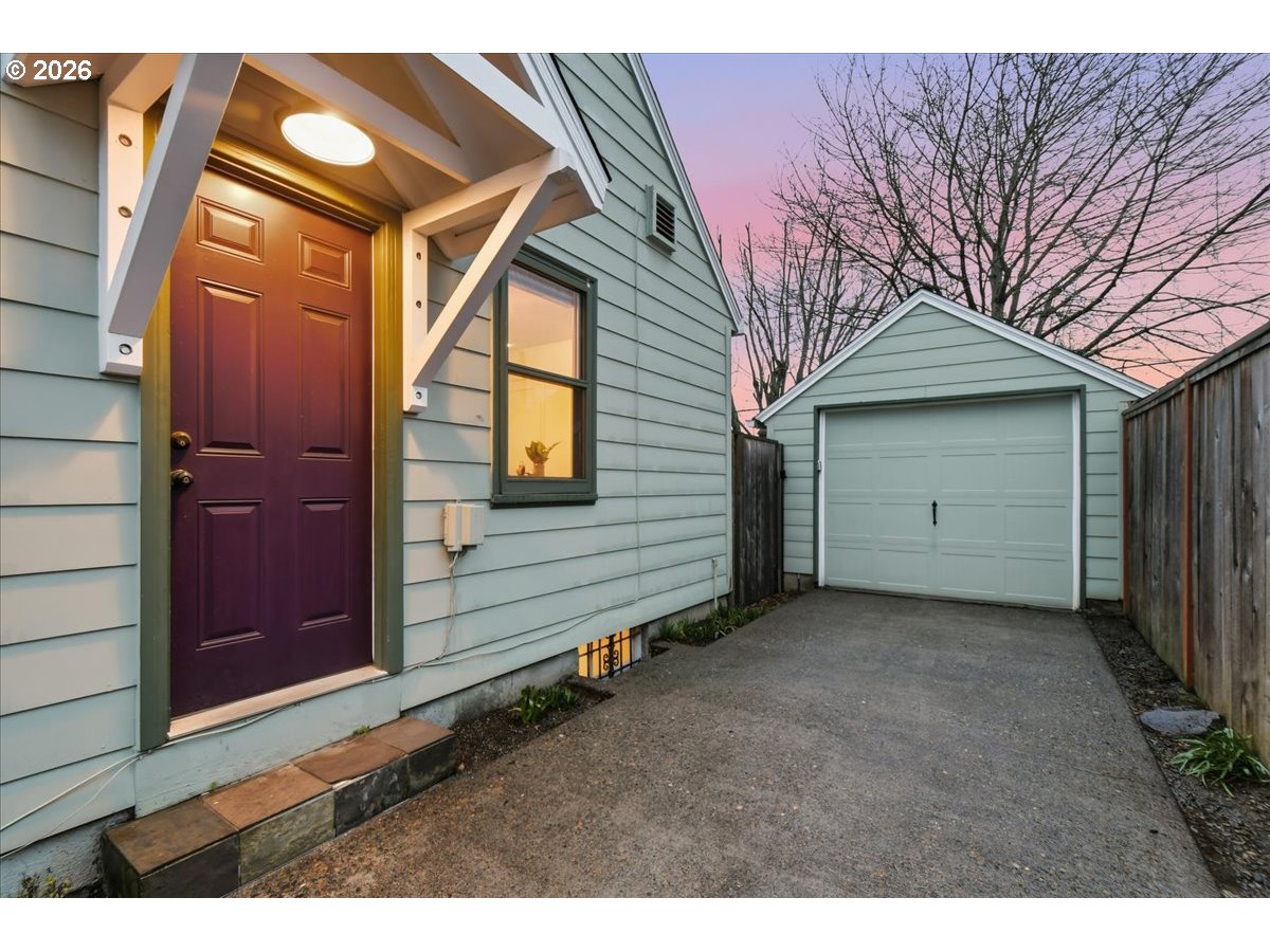 On a quiet, tree-lined street where neighbors gather for summer block parties and evening dog walks, this darling bungalow feels like something out of a storybook. Garden paths guide you to a covered porch and a cheerful purple front door—an invitation into a home filled with warmth, light, and timeless charm. Inside, sunlight pours through lovingly restored windows, dancing across original hardwood floors. The living room fireplace anchors cozy evenings, while crown and picture molding whisper of the home’s history. The dining room built-ins are ready for dinner parties and holiday traditions beneath softly glowing designer lighting.The kitchen is bright and welcoming, with stainless appliances and a sweet eating nook made for morning coffee rituals. Two bedrooms on the main offer flexibility and comfort—one opening directly to the backyard deck for easy indoor-outdoor living. Upstairs, the private primary suite is a peaceful retreat with a walk-in closet and heated bathroom floors that make chilly Portland mornings feel luxurious. The backyard is beautifully landscaped and designed for connection—weekend barbecues, garden afternoons, or unwinding under the stars. A detached garage and long driveway provide easy parking. Thoughtful updates (newer AC/electrical panel/decks/exterior paint & gutters/appliances) throughout ensure comfort and peace of mind. Just blocks from Alberta’s cafés and galleries, Fernhill and Alberta Park’s open green space, and the beloved eateries of the Dekum Triangle and Killingsworth, this home offers not just a place to live — but a lifestyle to savor. [Home Energy Score = 3. HES Report at https://rpt.greenbuildingregistry.com/hes/OR10245135]