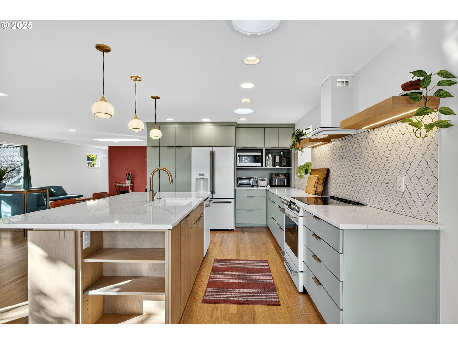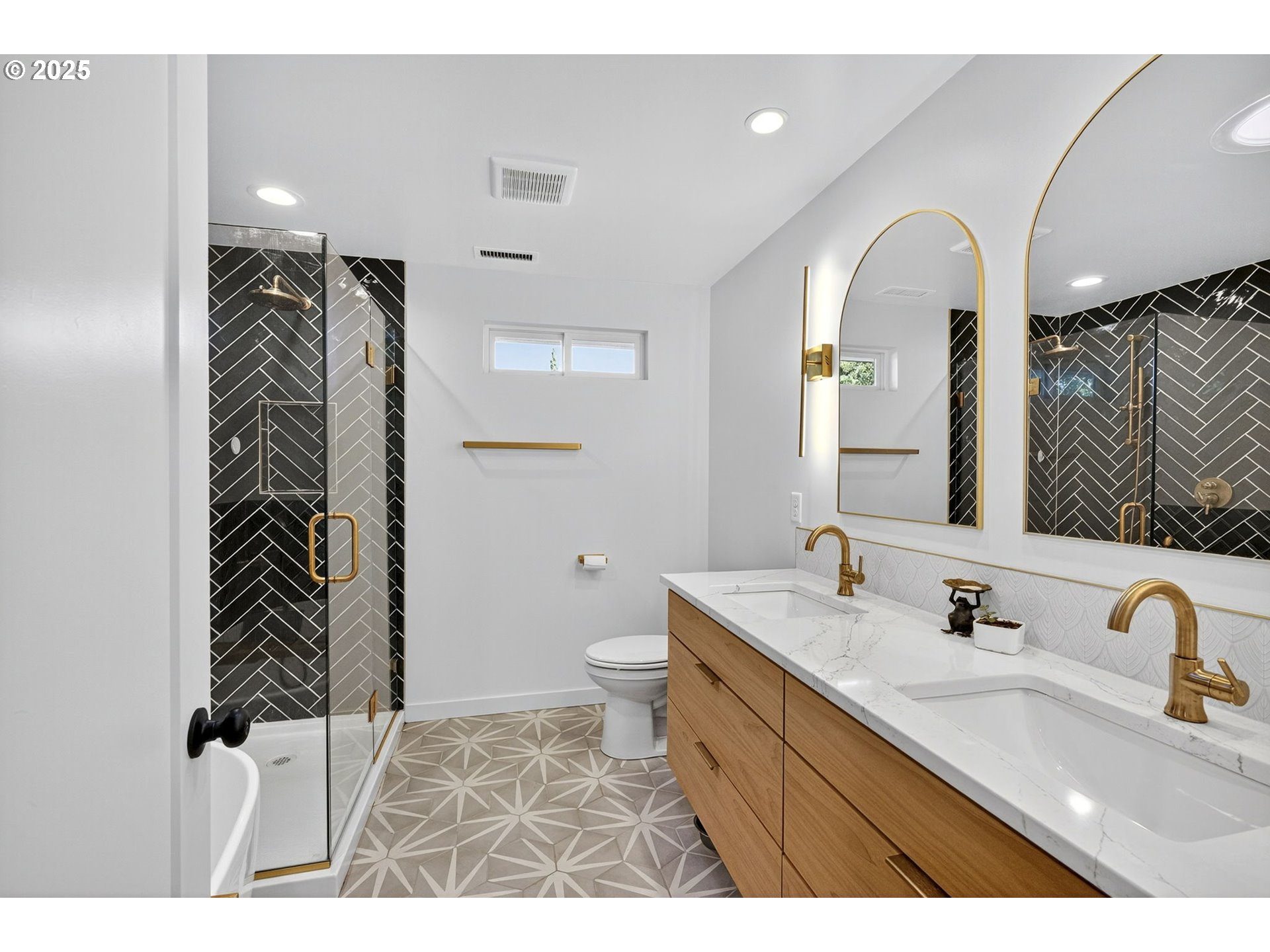 Experience elevated living in this beautiful Johns Landing duplex. The upper unit has been completely remodeled with high-end finishes and thoughtful design. White oak floors bring a modern sophistication, while floor to ceiling windows, solar tubes and skylights flood the home with natural light—even in the heart of our Pacific Northwest winters. The kitchen and bathrooms feature exquisite tile selections, as well as the wall behind the wood stove. The large kitchen island, beautiful cabinetry with generous storage and designer appliances complete this chefs kitchen. The primary suite offers a serene retreat, complete with a luxurious soaking tub, walk-in shower and a spacious closet. Two additional bedrooms provide generous space and flexibility.The lower unit includes 2 bedrooms, 1.5 baths, and a one-car garage with direct access to the kitchen. Both units share a large, fully fenced yard and an inviting outdoor common area ideal for entertaining or relaxing. There is an extra parking pad ideal for rv or creative possibilities. Located in the heart of Johns Landing, this property offers easy access to downtown, OHSU, freeways, parks, the river, and more. Don’t miss the opportunity to see this modern gem for yourself!