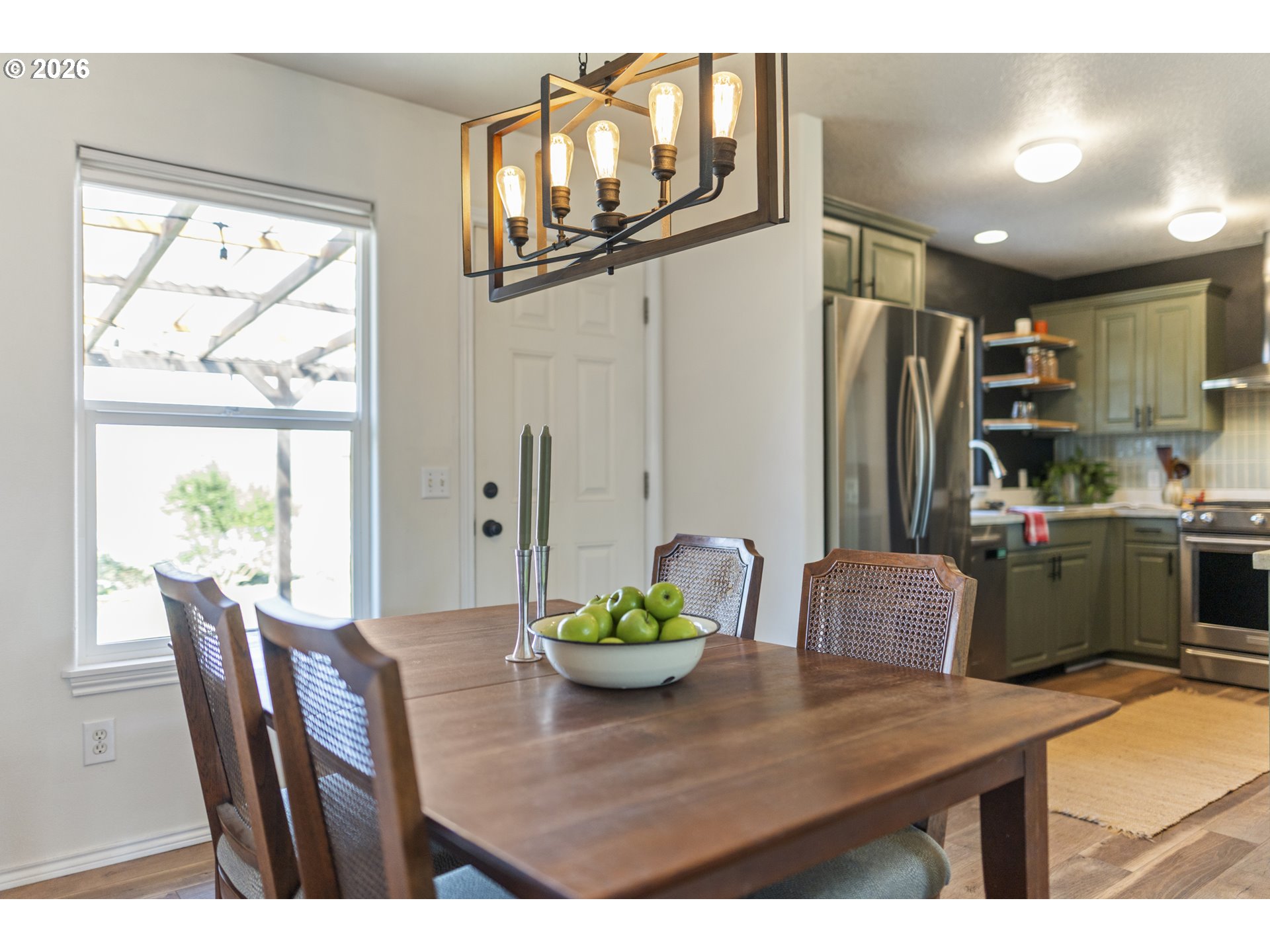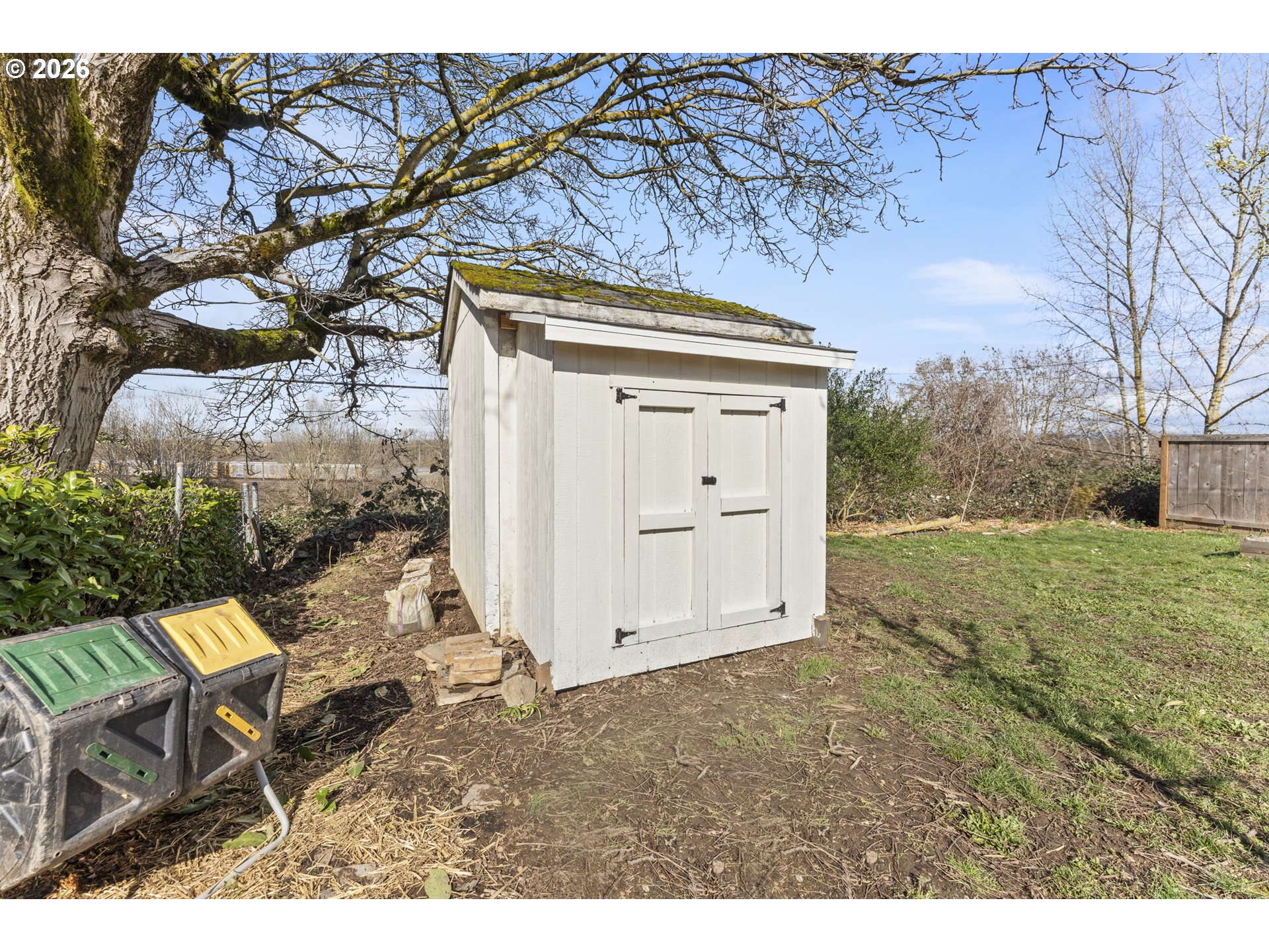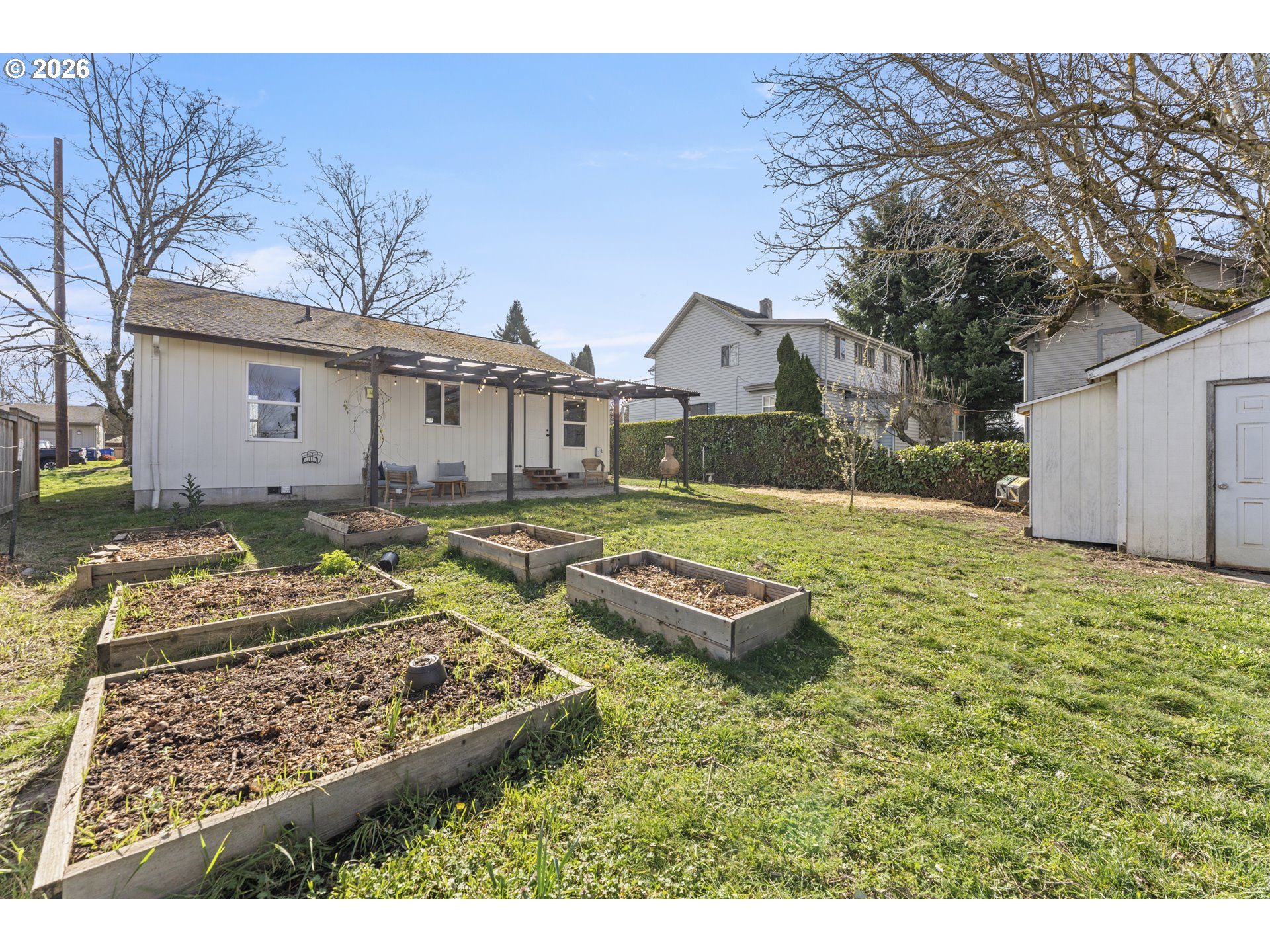 Charming and move-in ready in St. Johns! This adorable one-level home features 2 bedrooms and 1 bathroom with fresh updates throughout, including new flooring and interior paint. The inviting open kitchen flows easily into the living space, dining space and leads to a covered patio—perfect for relaxing or entertaining year-round. Step outside to a thoughtfully planted yard filled with established fruit trees, raspberries, blueberries, lingonberries, and a variety of native plants that create a beautiful and productive garden space. A large storage shed offers plenty of room for tools, bikes, and outdoor gear. Inside, the spacious primary bedroom includes a walk-in closet, and an efficient mini-split system provides comfortable heating and cooling. Located on a quiet street, this home offers a wonderful opportunity for first-time buyers, downsizers, or anyone seeking easy one-level living. [Home Energy Score = 9. HES Report at https://rpt.greenbuildingregistry.com/hes/OR10020567]