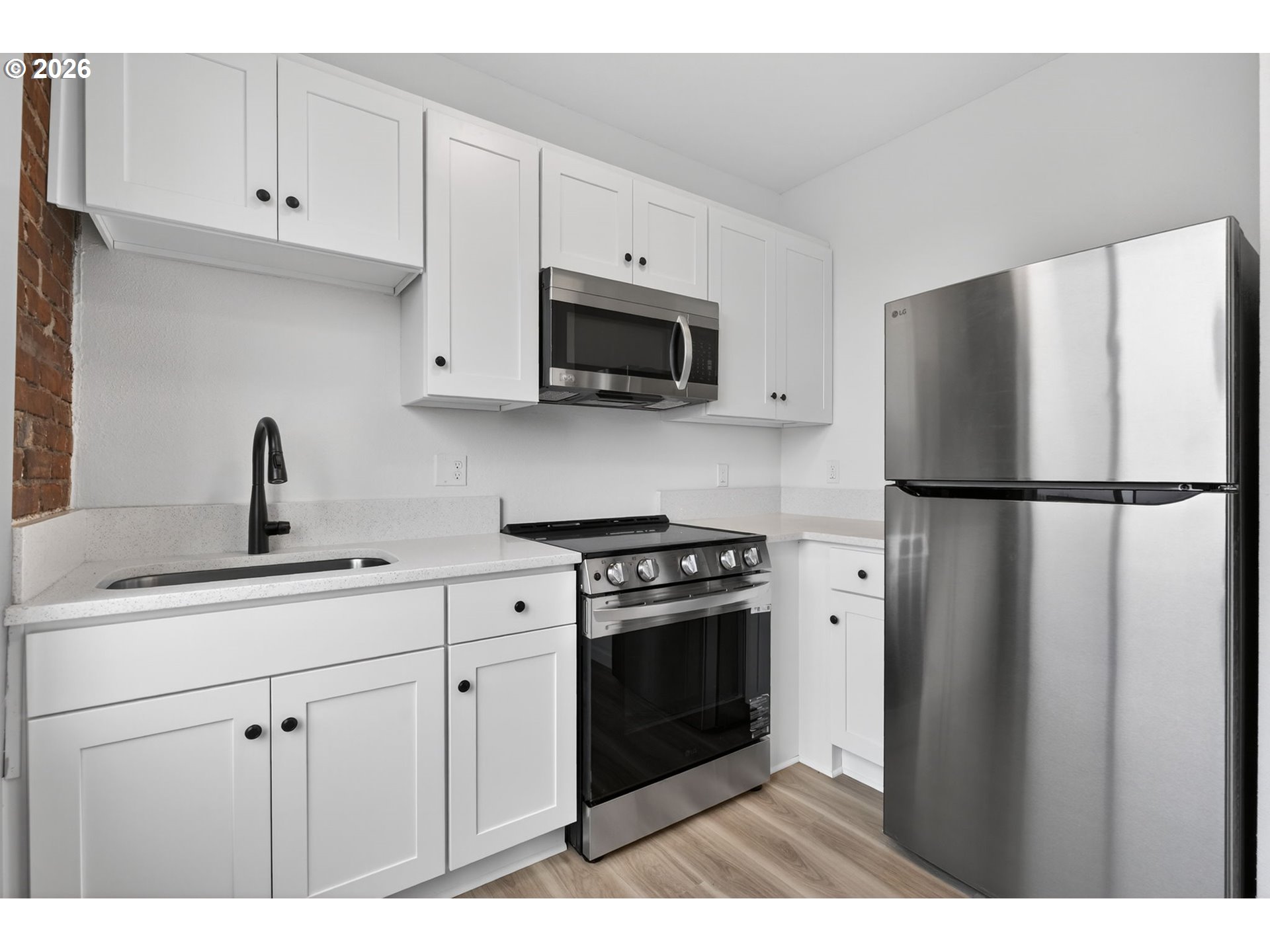 This beautifully renovated studio condo perfectly blends historic character with modern updates, ideally located just across from Portland Community College. Exposed brick walls and luxury vinyl plank floors create a warm, inviting atmosphere, while the open layout and large windows flood the space with natural light.The updated kitchen features brand-new stainless steel appliances, including a full-size stove and refrigerator, and in-unit washer/dryer adds ultimate convenience. Super low HOA dues cover water, sewer, garbage, and common areas, making maintenance easy and affordable.Perfect as a city retreat or smart investment, this studio offers style, practicality, and an unbeatable location close to campus, transit, and neighborhood amenities. Special financing options and buyer grants are available through our preferred lender. Don’t miss this move-in-ready gem!