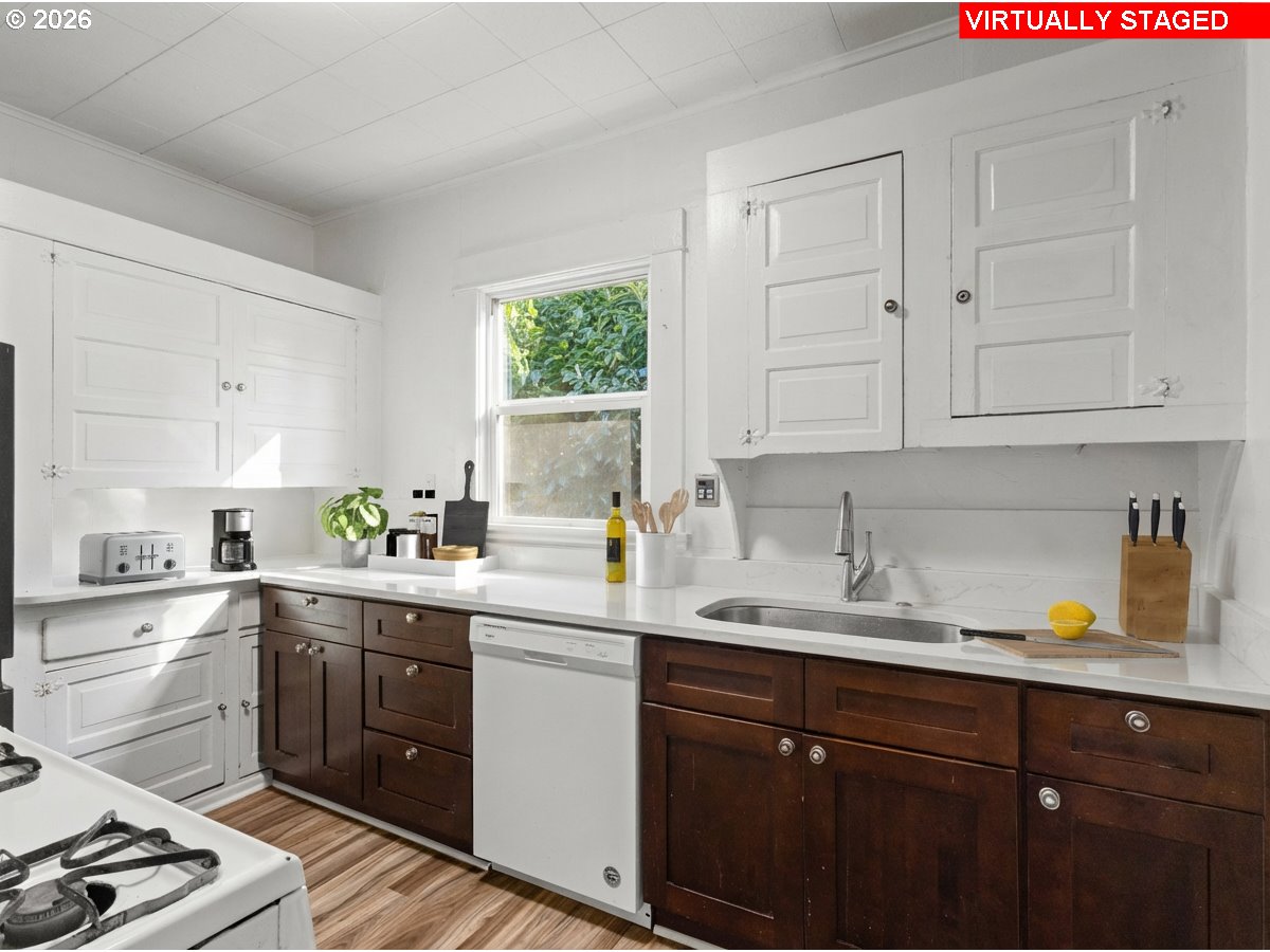 Tucked along a quiet residential street in SE Portland, this sweet bungalow packs a whole lot of charm into a perfectly sized footprint. Set on a full 50x100 lot, the sunny backyard offers incredible gardening potential, space to roam, and room for your four-legged companions to live their best life. A fenced front yard and covered porch create that classic Eastside Portland welcome, the kind that practically begs for a morning coffee ritual. Off-street parking is available with the deep driveway. Inside, original wood floors and built-in features bring warmth and character to the living room, while large double-pane vinyl windows let in beautiful natural light. The kitchen blends charm and function with quartz countertops, laminate flooring, freestanding appliances, and a built-in dishwasher and microwave. The bathroom keeps the vintage vibe alive with a clawfoot tub that feels straight out of a Portland storybook. With 2 bedrooms, 1 bath, and 576 square feet of efficient living space, this home lives smart and cozy. Modern upgrades include a heat pump with mini-split system, tankless water heater, updated PVC drain lines, and an impressive 9/10 Home Energy Score. Low 2025 property taxes of $2,868.57 make this an approachable opportunity to own a little slice of SE Portland charm; full of personality, light, and future potential. [Home Energy Score = 9. HES Report at https://rpt.greenbuildingregistry.com/hes/OR10244417]