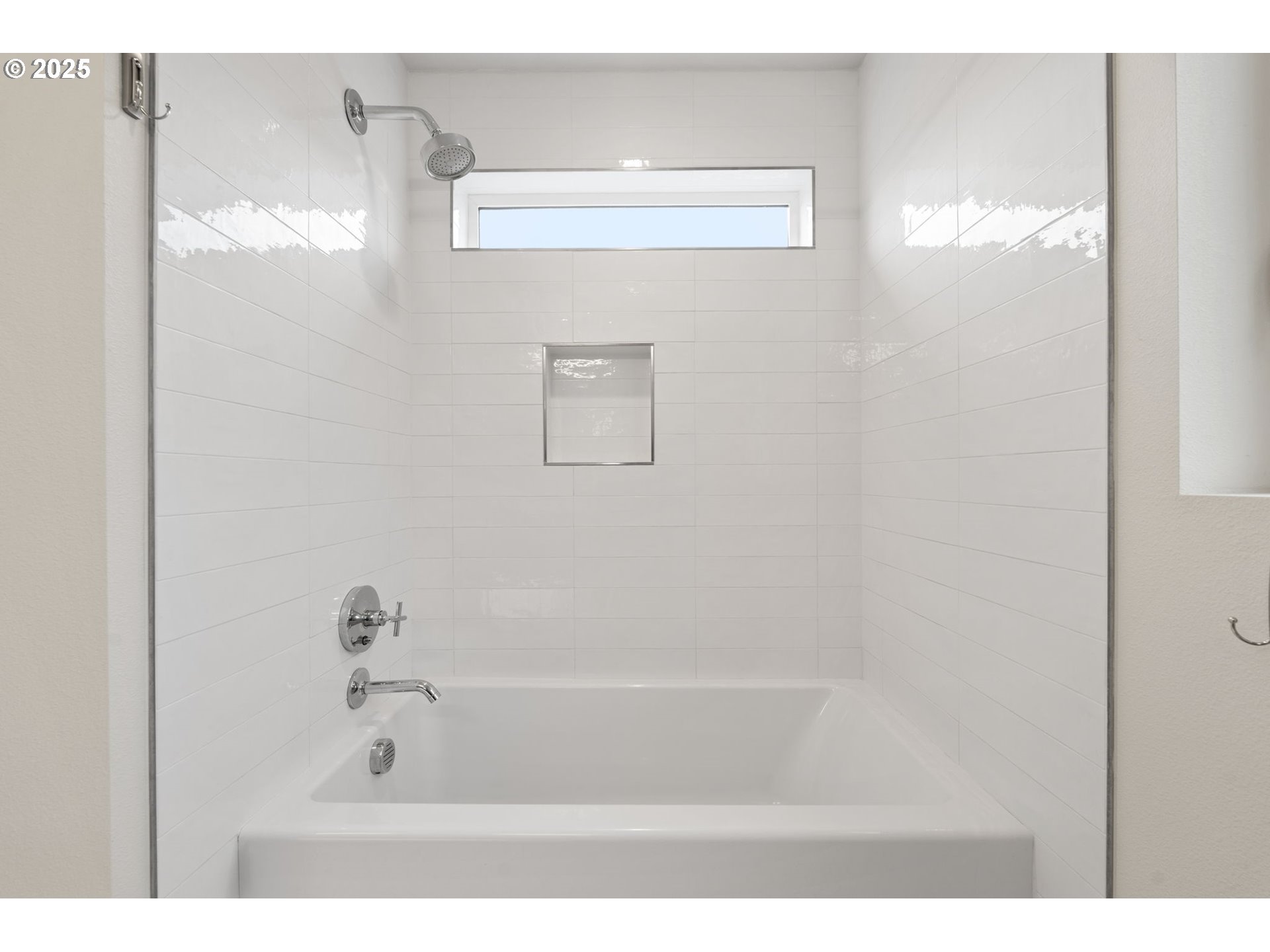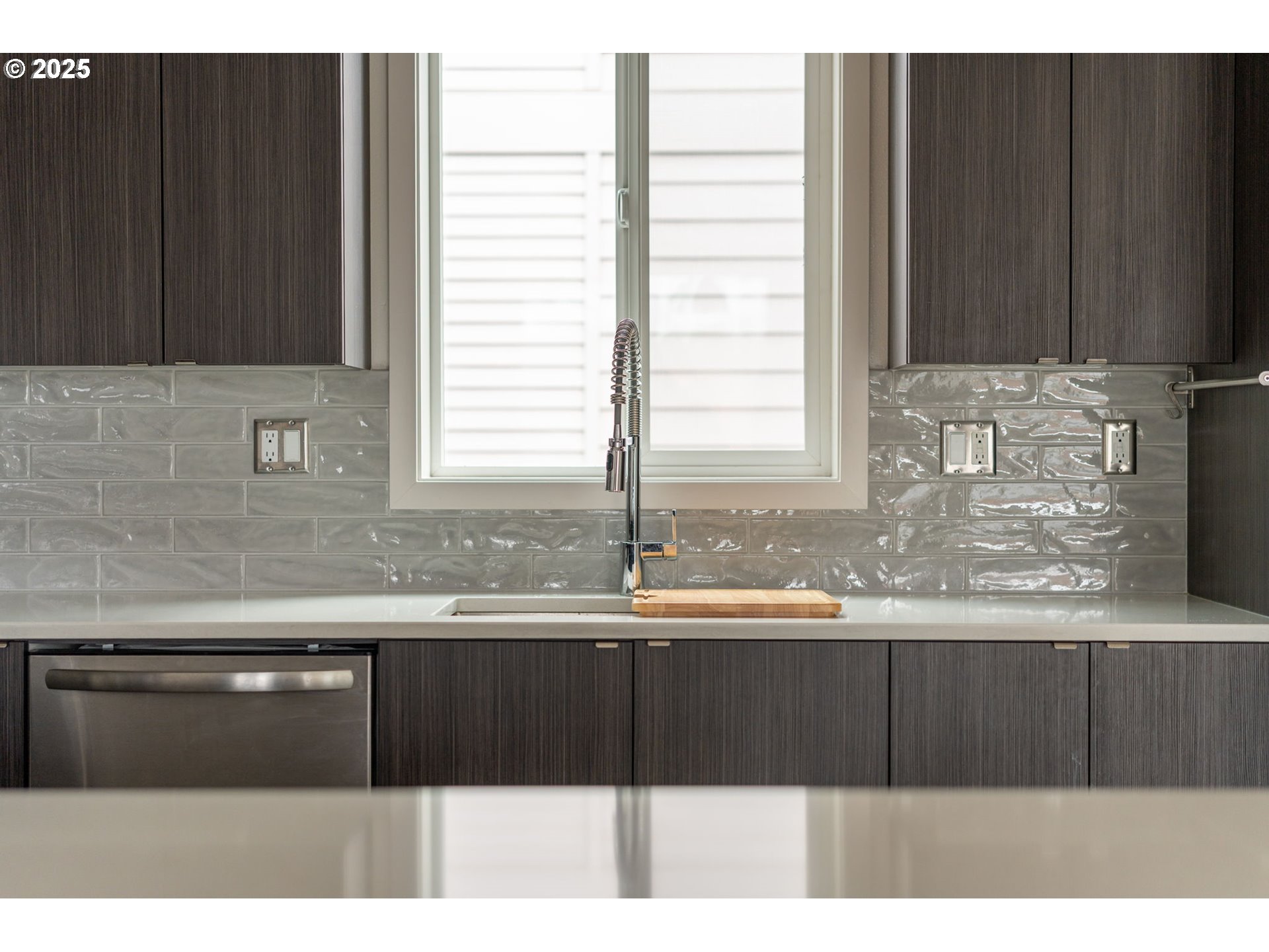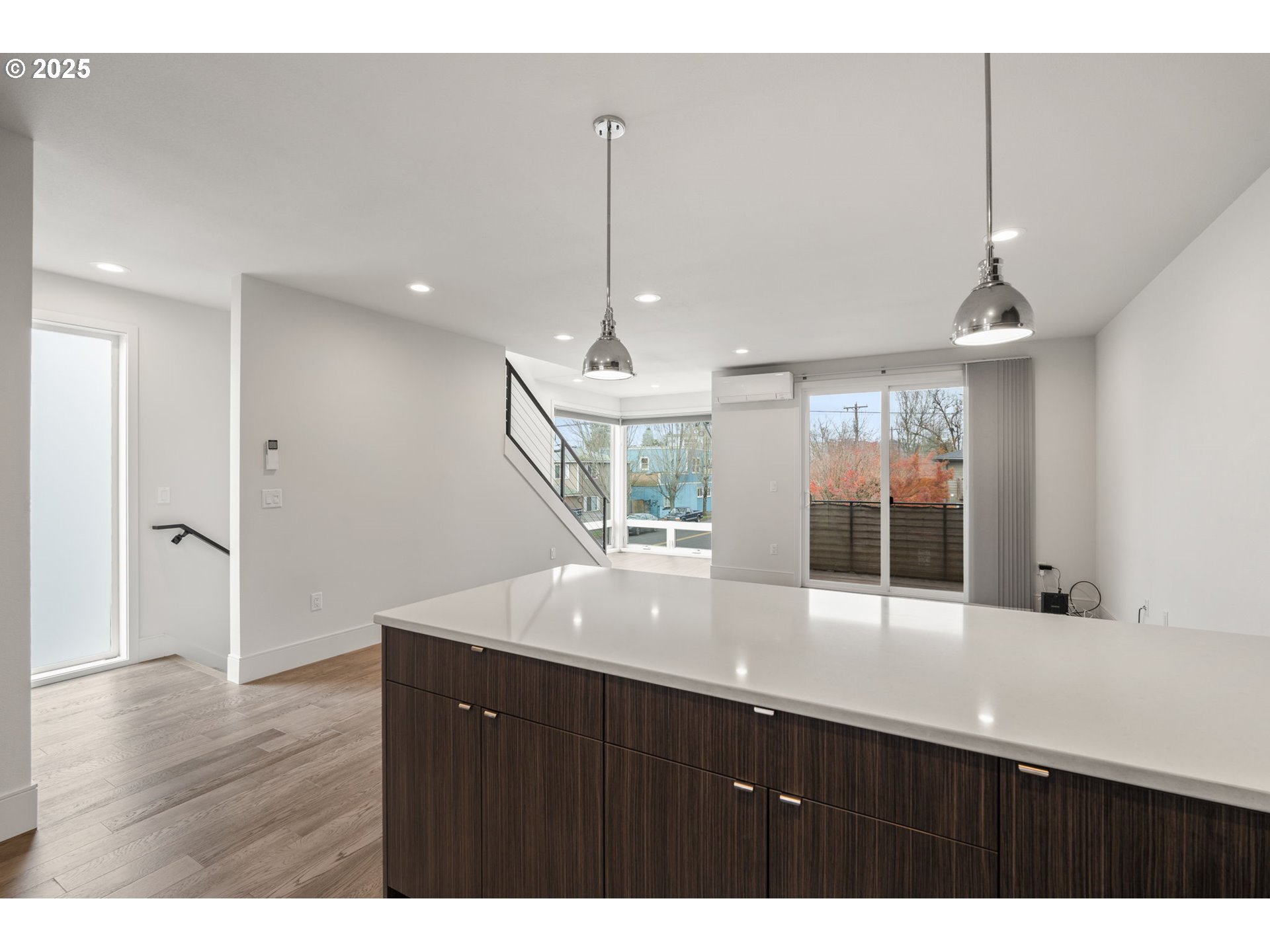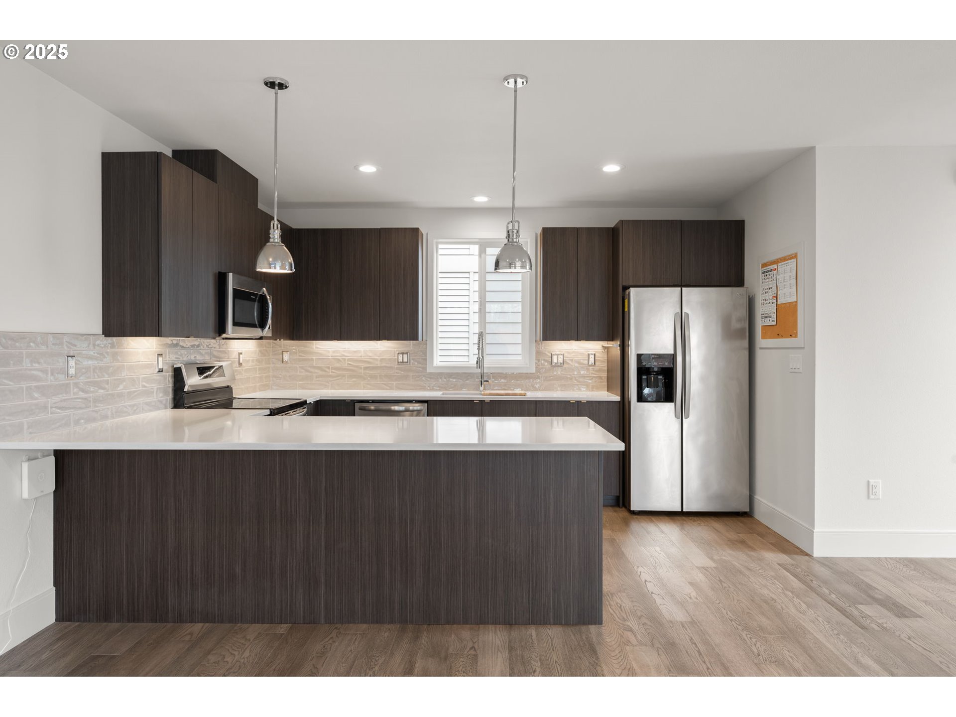 This contemporary corner-lot rowhome offers low maintenance living, modern design, and impressive energy efficiency. Engineered hardwood floors, quartz countertops, tile finishes, Energy Star appliances, and a Mitsubishi ductless system create a comfortable, refined setting. The open main level features a stylish kitchen with stainless steel appliances including an induction range, quartz counters, a tile backsplash, and a breakfast bar. A sliding door extends the living space to a covered deck ideal for morning coffee. Upstairs are two spacious bedrooms, a polished hallway bath with a double sink vanity, a walk-in closet in the primary, and convenient laundry. The lower level bonus room works well as a third bedroom, office, or media area and opens to the private fenced backyard with professional landscaping and drip irrigation. Located 2 blocks from the newly expanded Mt. Scott Community Center and Mt. Scott Park, plus dining and shopping along Foster Road and Woodstock Boulevard, this home offers turnkey comfort in a highly connected location. [Home Energy Score = 10. HES Report at https://rpt.greenbuildingregistry.com/hes/OR10215939]
