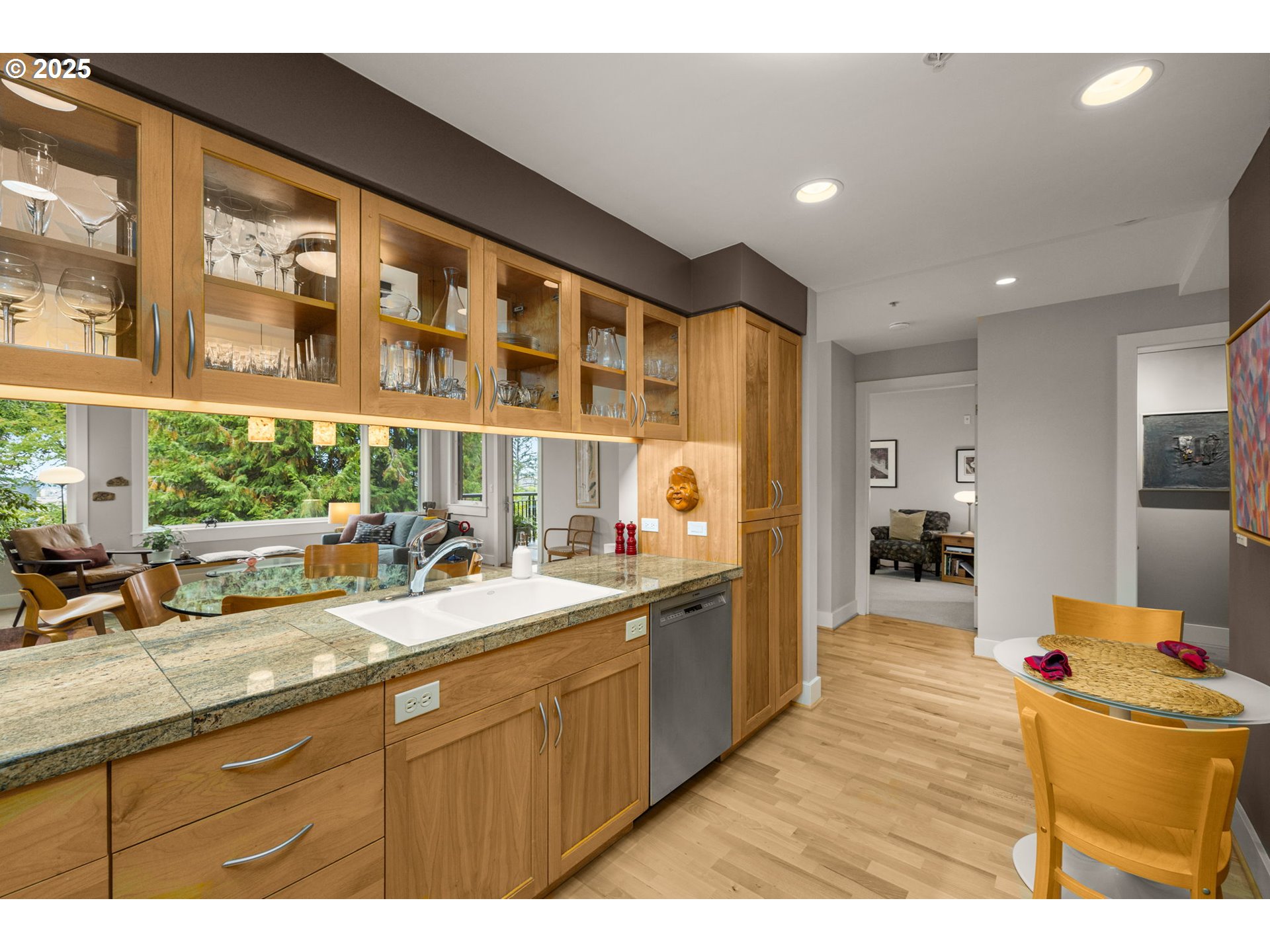 The nostalgia of Northwest meets contemporary comfort at this warm and sophisticated condo on Westover Square. A true PNW feel across 1144 square feet, this one bedroom, two bathroom condo showcases impeccable maple floors, fine craftsmanship, cherry cabinetry, re-invented spaces like an office nook with custom built ins, well-designed cook’s kitchen w/ stainless steel appliances, semi-open to the dining + living room. Capture views of the Fremont Bridge from the calming living room with gas fireplace and access to the covered lanai - a spacious place to enjoy the outdoors. Fit with h2O, gas + electricity, adding to the functionality of the outdoor space. The primary suite features built in organizers and custom cherry drawers. Tiled bathroom with walk in shower. The laundry room comes outfitted with Speed Queen W/D matching set. Tankless Water Heater, Forced Air Gas Furnace, Central AC, all add to the modern comforts. This unit is very energy efficient and takes minimal energy to run. This boutique community consists of 13 units, with lush grounds and acreage to wander. This condo comes with a storage unit, 1 secure underground garage parking space and opportunity to rent additional parking and storage if needed. Pay as you go EV charger - first come first serve and not far from the assigned Parking Space for this Unit. Kings Square North Condominium was completed in 2001, and you will find this building is modern and efficient, without losing that level of warmth and comfort that makes one feel at home. Live with peace of mind in one of Portland’s most vibrant and historic neighborhoods. Monthly HOA Fee $1,154. Covers: Exterior, Water, Garbage, Xfinity Cable + Internet Package, Landscaping, Gated. Don’t miss a tour of this unique 1 bedroom at Kings Square North.