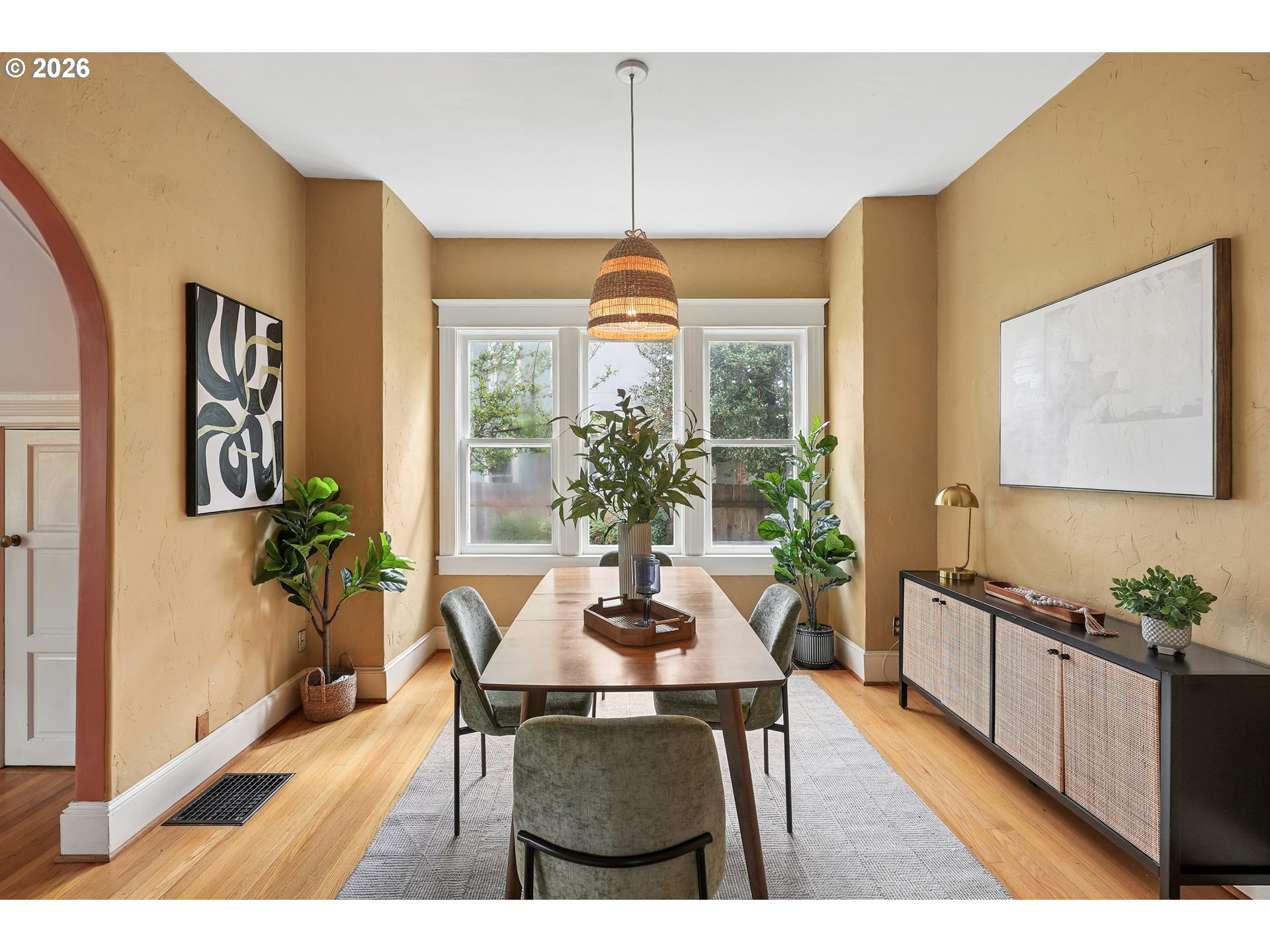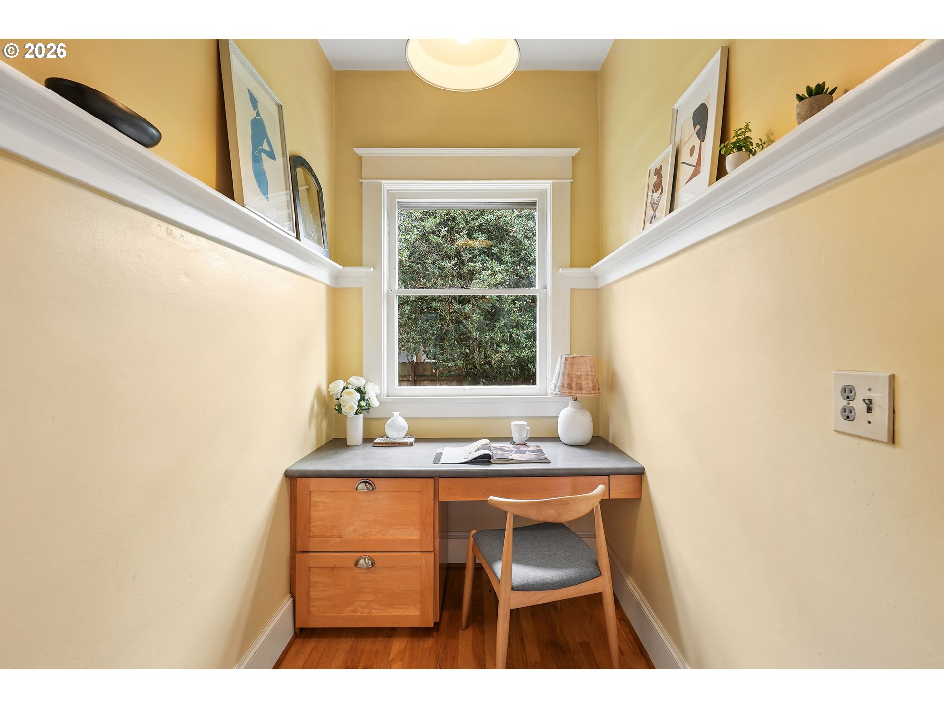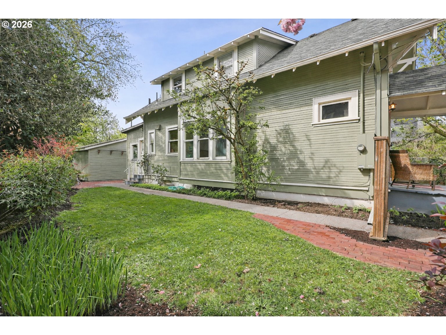 Incredibly charming farmhouse just moments away from hot and happening downtown Montavilla. Enter through the quaint covered front porch and be greeted with an abundance of 1912 details. From the hardwood floors, built-ins, nooks and coved archways, this home has all the character to boot. Dining room is accompanied by soaring ceilings and main level bedroom, den or office. Enjoy the large kitchen with wood cabinets, modern light fixtures and attached nook ready for your ideas. Host dinner parties or sip your morning coffee from the back sun porch with a surround view of the backyard and darling brick patio. Upstairs, you'll find the primary bedroom with walk-in closet and vaulted ceilings along with 2 additional bedrooms and full bath. Rare alley-fed oversized 2-car detached garage is ready for all your toys and hobbies plus you'll be able to capitalize on the unlimited potential of this already blossoming fenced backyard space. Conveniently located and just moments from a plethora of some of Portland's favorite restaurants, cafes and shops not to mention the beautiful 176-acre Mt. Tabor park.