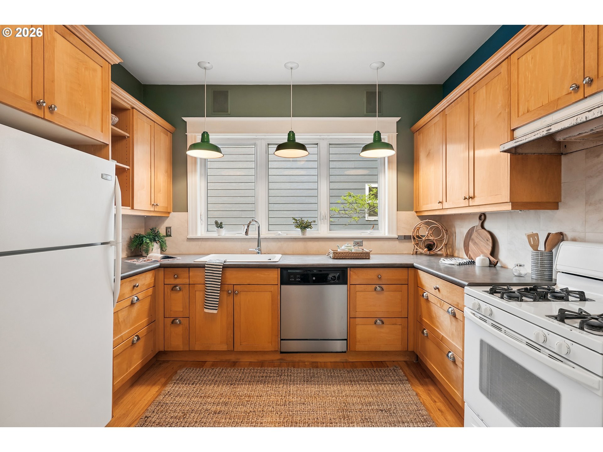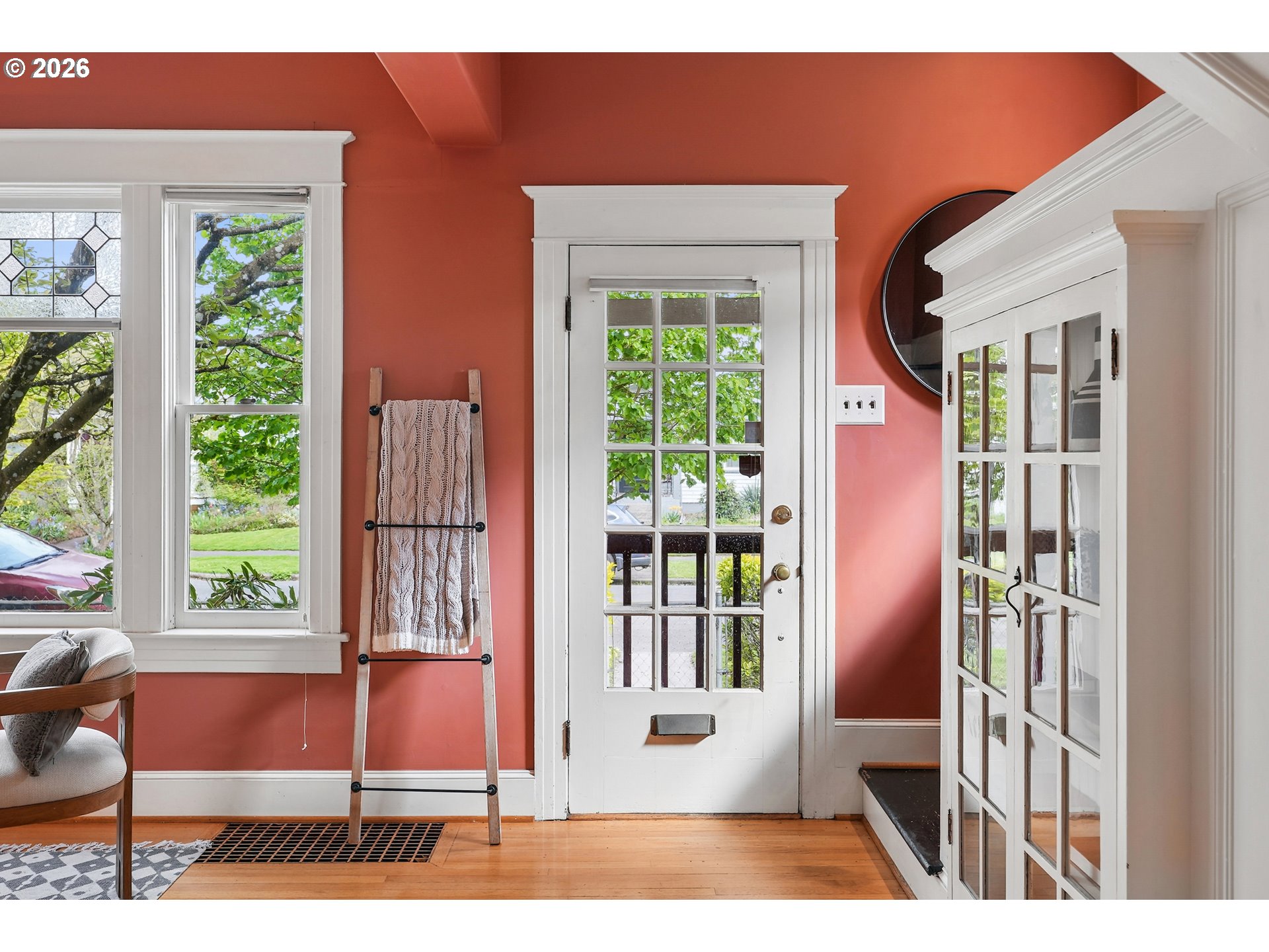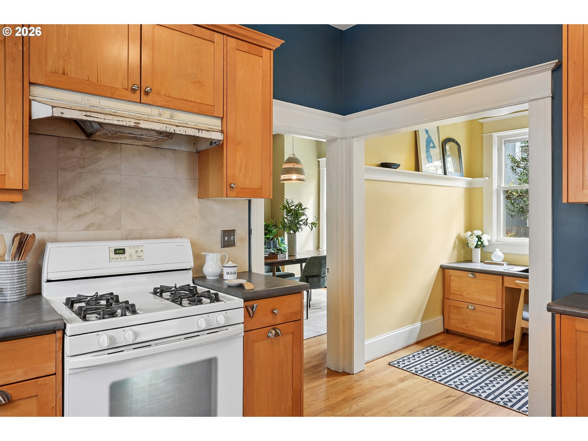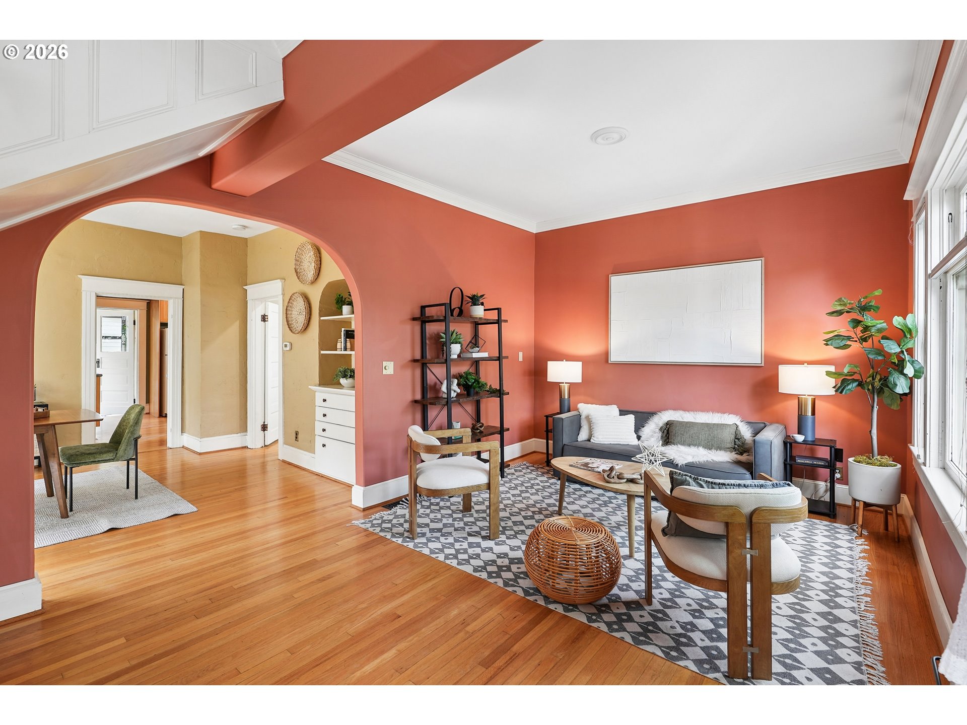 Incredibly charming farmhouse just moments away from hot and happening downtown Montavilla. Enter through the quaint covered front porch and be greeted with an abundance of 1912 details. From the hardwood floors, built-ins, nooks and coved archways, this home has all the character to boot. Dining room is accompanied by soaring ceilings and main level bedroom, den or office. Enjoy the large kitchen with wood cabinets, modern light fixtures and attached nook ready for your ideas. Host dinner parties or sip your morning coffee from the back sun porch with a surround view of the backyard and darling brick patio. Upstairs, you'll find the primary bedroom with walk-in closet and vaulted ceilings along with 2 additional bedrooms and full bath. Rare alley-fed oversized 2-car detached garage is ready for all your toys and hobbies plus you'll be able to capitalize on the unlimited potential of this already blossoming fenced backyard space. Conveniently located and just moments from a plethora of some of Portland's favorite restaurants, cafes and shops not to mention the beautiful 176-acre Mt. Tabor park.