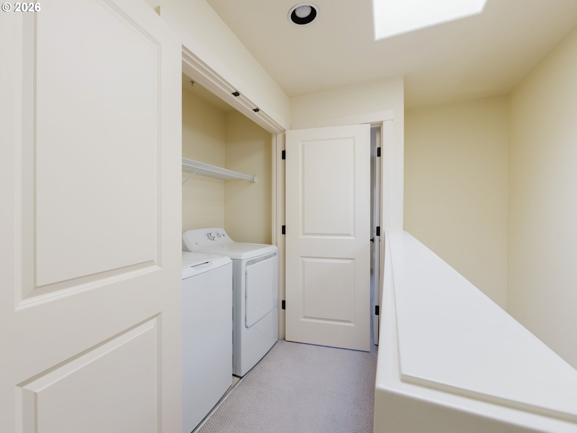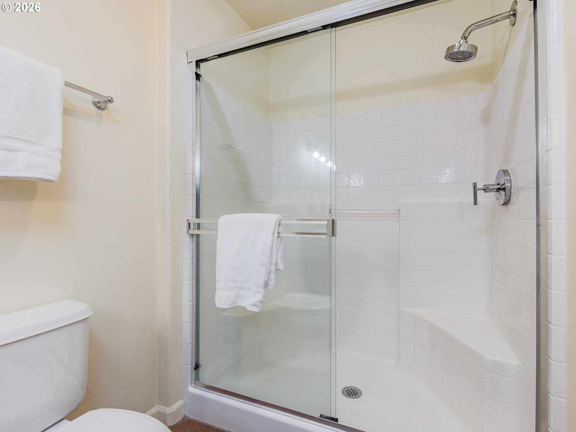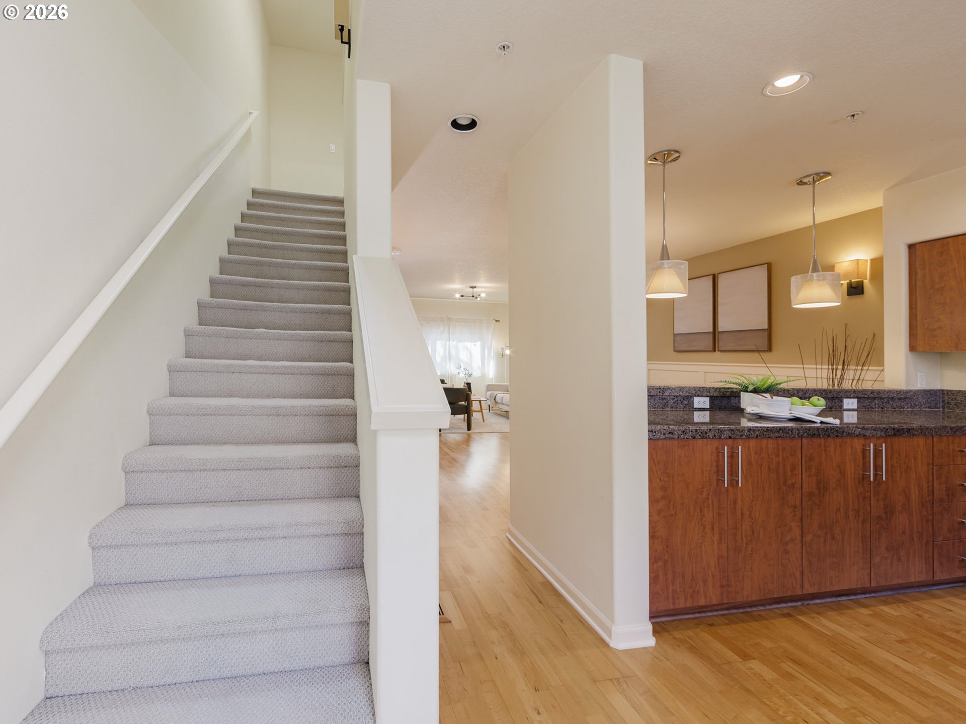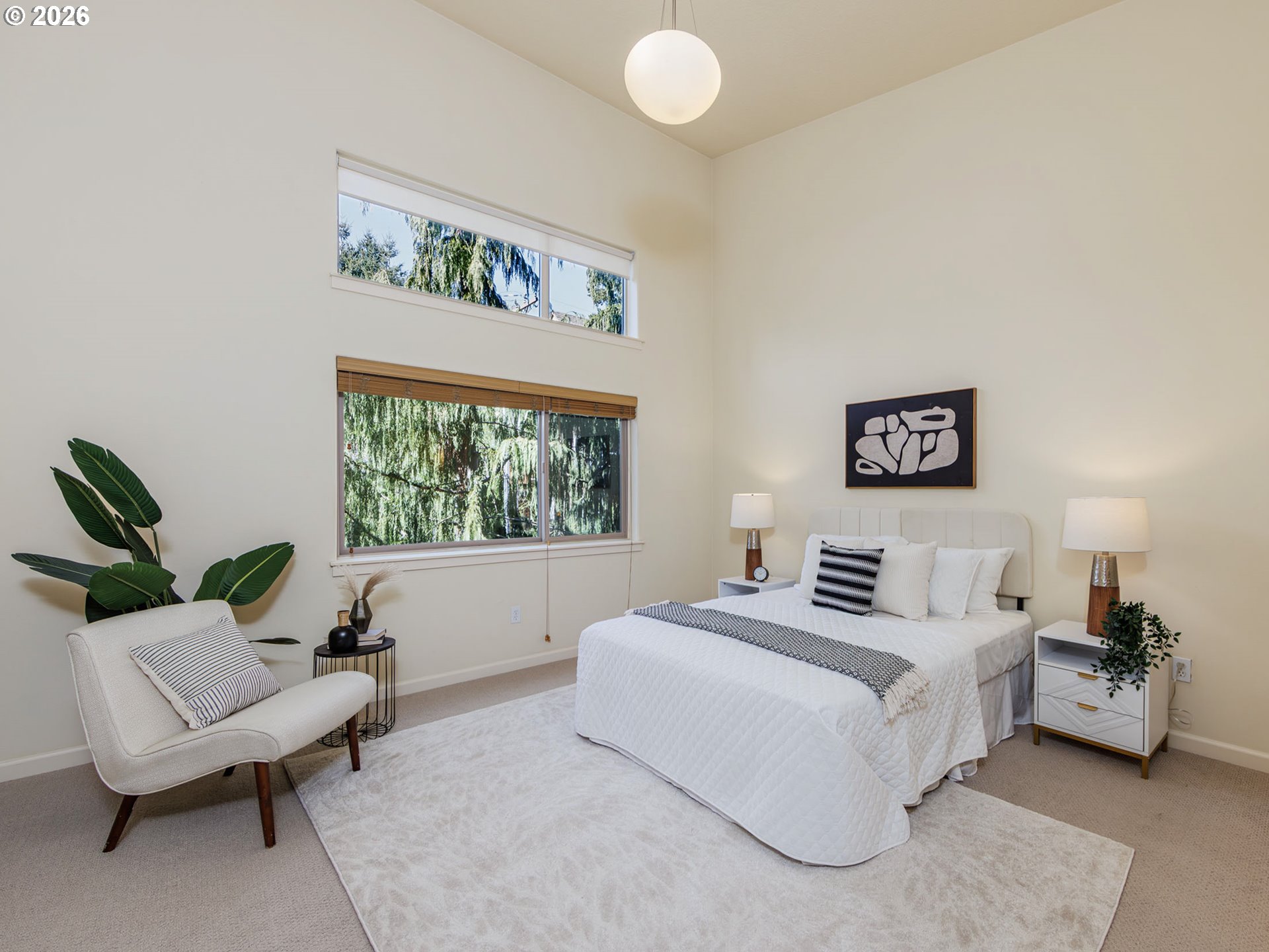 Modern style meets an unbeatable location in the heart of Multnomah Village. This 2 bed, 2.5 bath townhome-style condo offers a smart, light-filled layout with high ceilings throughout, designed for effortless living. The main level is perfect for entertaining, featuring wood floors, an open living and dining area, and a spacious and fully equipped kitchen with granite tile countertops, stainless steel appliances-a gas 5-burner range with convection and air fryer capabilities, exterior-venting microwave/hood, built-in dishwasher, and free-standing refrigerator. Two decks extend your living space outdoors—ideal for morning coffee or evening unwinding—while a convenient half bath adds everyday functionality. Upstairs, both bedrooms are private suites, including a stunning primary retreat with vaulted ceilings soaring from 12’ to 14’, dual sinks, and a walk-in shower. The second suite features a tub/shower combo and its own walk-in closet. Both bedrooms offer generous space and storage, and laundry is conveniently located right where you need it. A rare bonus: a tandem 2-car garage with abundant storage—perfect for gear, hobbies, or staying organized. All just blocks from Multnomah Village favorites—restaurants, shops, Gabriel Park, and more. Stylish, low-maintenance living in one of Portland’s most beloved neighborhoods.