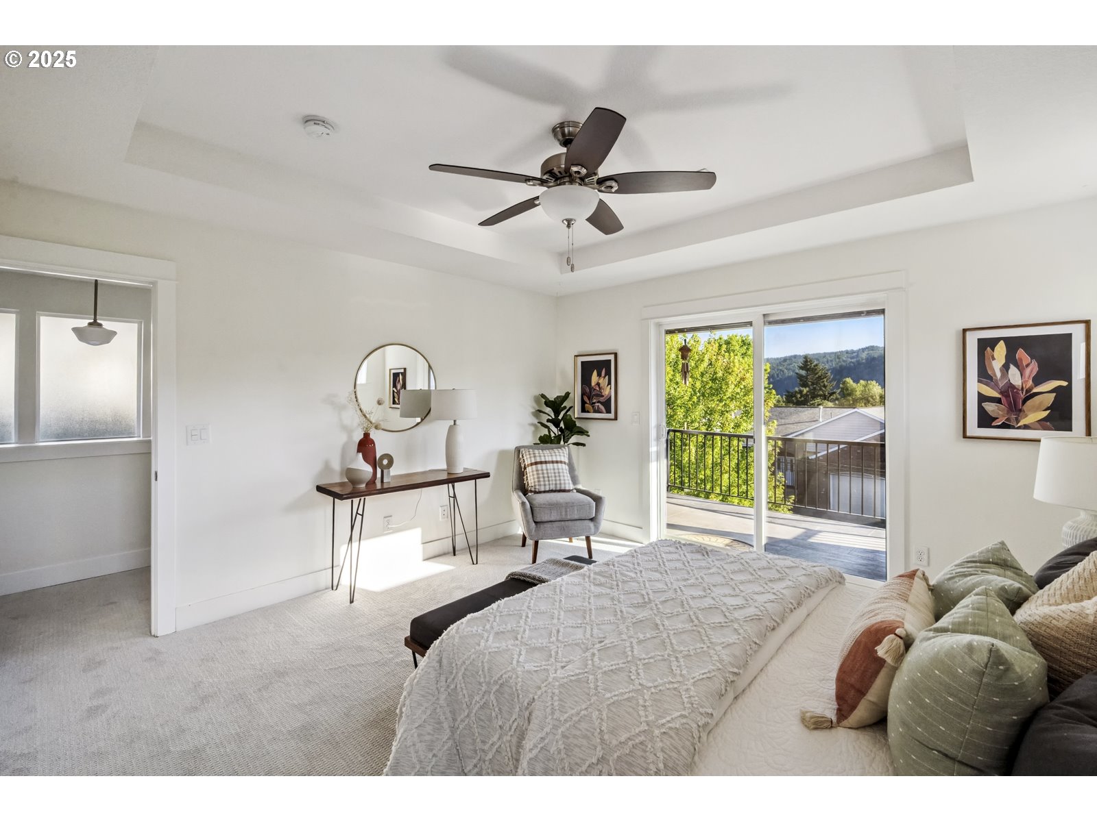 Stylish and totally turnkey, this 4-bed, 2.5-bath home offers over 2,000 sq ft of light-filled living with amazing views of the St. Johns Bridge. With three distinct (and covered) decks and balconies, this house is built to entertain and enjoy the beautiful surroundings any time of year. Inside you'll find an open floor plan, engineered wood floors, new carpet, a gas fireplace, and a sleek kitchen with quartz countertops, stainless steel appliances, and a large island perfect for gathering and entertaining. The spacious primary suite includes a walk-in closet and ensuite bath with soaking tub that features views of the St Johns bridge. The primary suite also has a covered balcony with breathtaking bridge and mountain views. One bedroom on the main level gives you flexibility for a home office, gym, or media room. Outside, enjoy a private fenced yard and off-street parking with tuck-under garage. Just blocks from the river, parks, and St. Johns shops and restaurants! [Home Energy Score = 5. HES Report at https://rpt.greenbuildingregistry.com/hes/OR10240345]