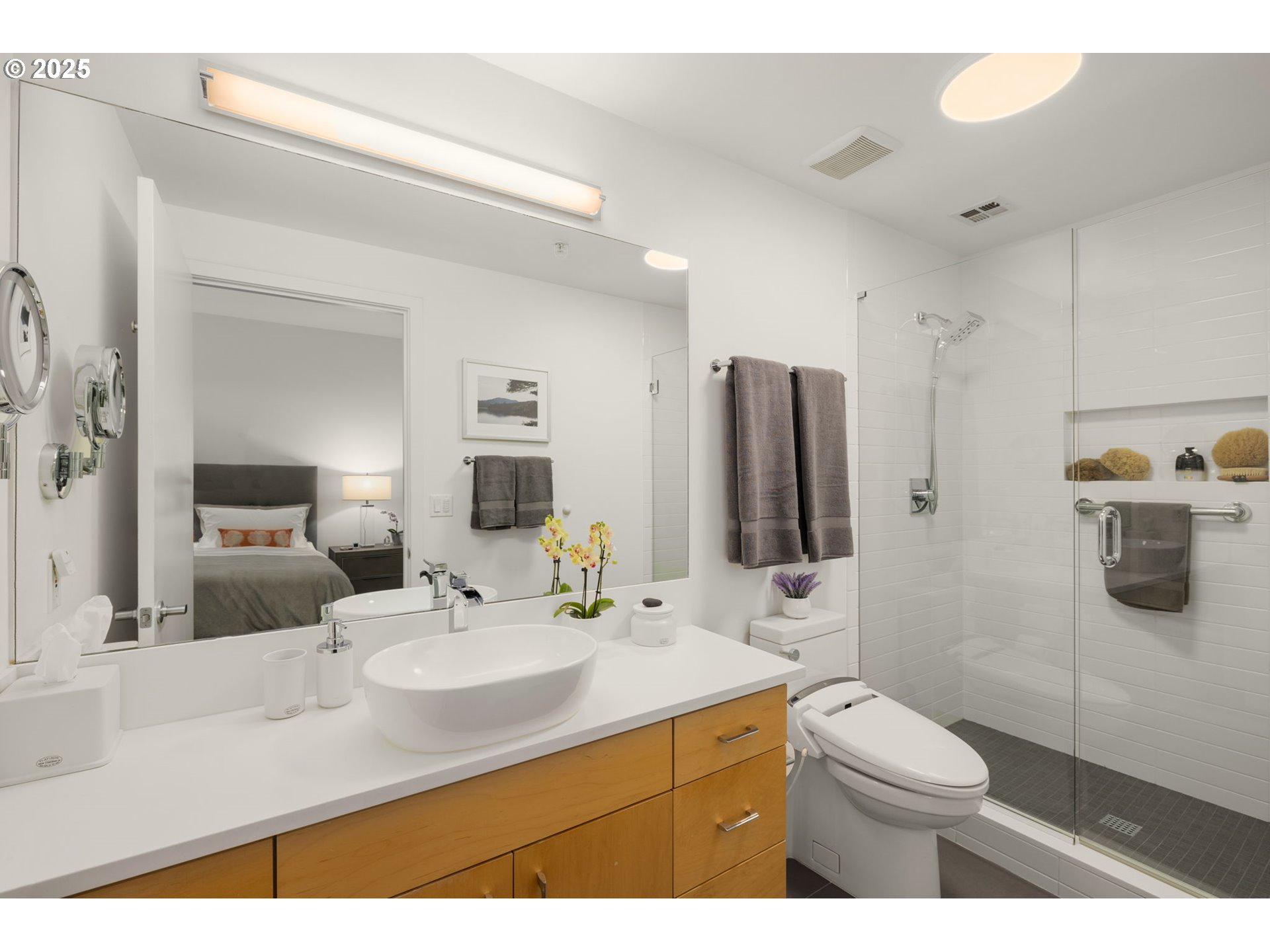 A light filled, one of a kind gem located in the heart of the Pearl District—easily one of the most desirable and curated units in the area. Thoughtfully renovated with nearly $200,000 in premium upgrades. This stunning SW corner home offers luxury living at its finest. A few features include: a chef’s kitchen, a 10-foot island, top-of-the-line Wolf, Miele, and Fisher & Paykel appliances, and slab granite counter tops. Marvel wine cooler, a gas fireplace and wide plank blond wood floors. Both bedrooms and bathrooms have been beautifully updated, complemented by stylish Pablo lighting. Expansive windows flood the home with natural light, while a private covered patio provides a serene outdoor retreat. The open concept floor plan maximizes the sense of space and flow, carefully designed with principles of Feng Shui to create a truly beautiful and tranquil living experience. Don’t miss this beautifully bespoke Riverstone condo, a rare blend of modern elegance, masterful design, and urban convenience - a spa-like sanctuary in the heart of the city. Sale includes 1 deeded parking space and 1 deeded storage unit.
