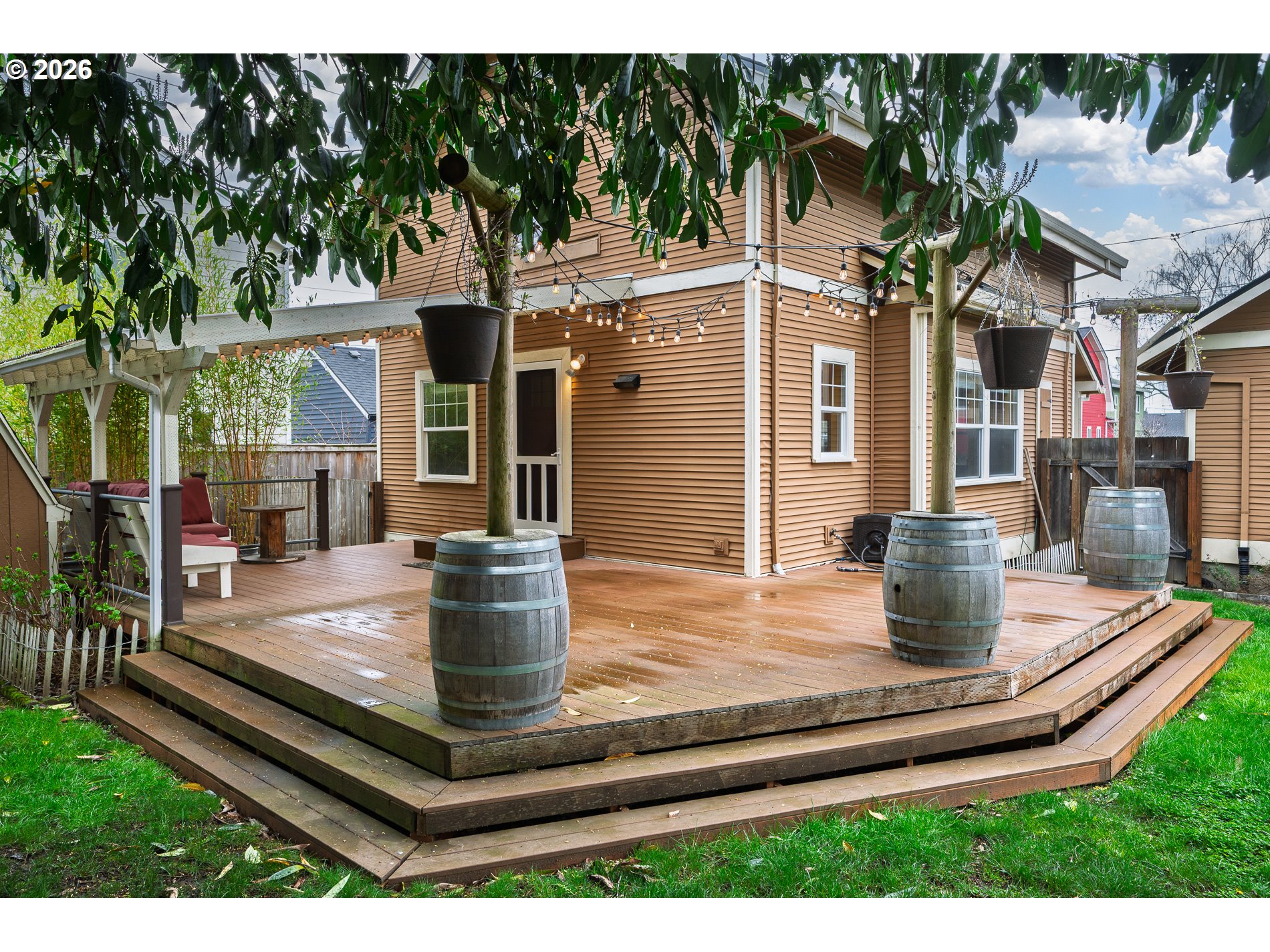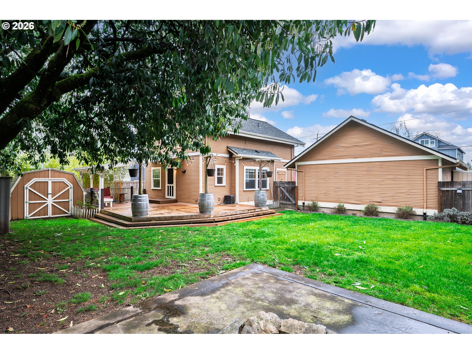 RARE! Backyard OASIS in the city PLUS huge detached shop/garage with a separate driveway AND a 3-bedroom, 1996-built home with newer roof, newer mini-split and freshly refinished hardwood floors. The kitchen boasts granite counters and stainless appliances and features a door to the big covered deck with programable lighting. Step off the deck into your private, custom paver patio space with stunning use of lighting and plants that creates the perfect spot for a hot tub. Stroll across the lawn to the concrete patio & enjoy your firepit. No matter the weather, you’re set with heating and cooling from the mini-split as well as a newer (certified) wood stove. There is a bedroom on the main floor and two large bedrooms upstairs with a full bathroom and laundry room. There is a custom dog door to a dog run that you have to see to believe. Minutes to New Seasons, Fred Meyer, dining, parks & community garden. BONUS: There are several options for development (now or future). What a find! [Home Energy Score = 6. HES Report at https://rpt.greenbuildingregistry.com/hes/OR10245977]