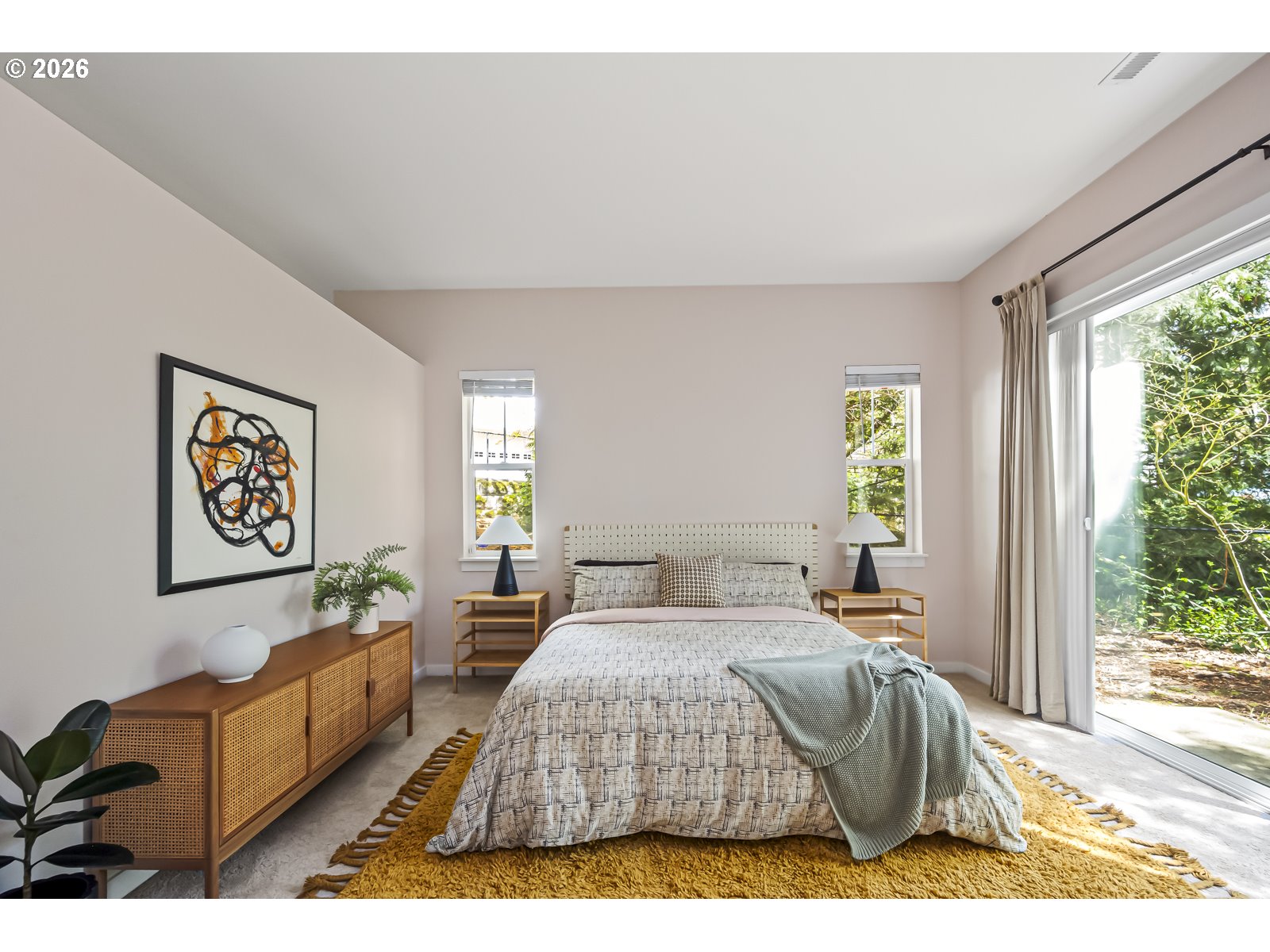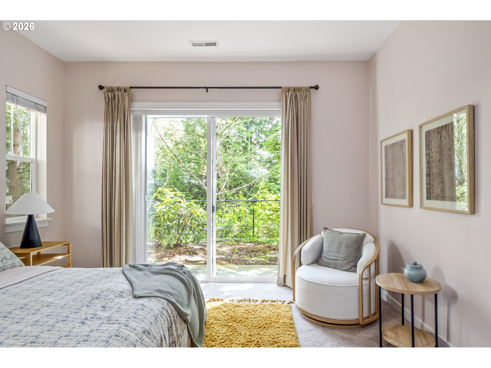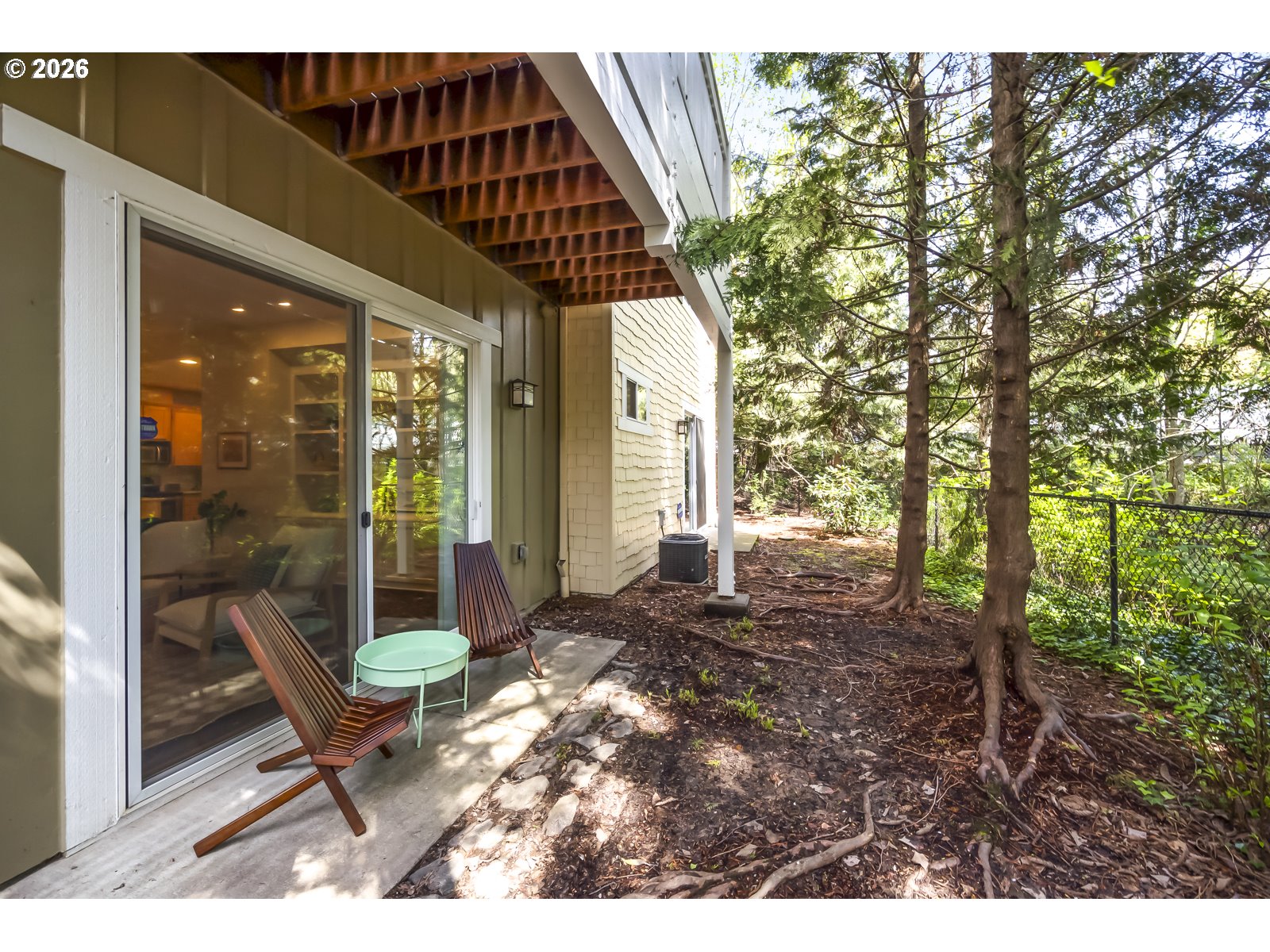 End-unit condos like this one don't come up often. Set on the lower level with soaring ceilings and surrounded by mature trees, it offers privacy, natural light, and a sense of quiet. With two sets of sliding glass doors — one in the living room, one in the primary suite — each leading to its own private patio, the living space extends naturally into the trees and gives you real outdoor entertaining space to go with it. Inside, the open floor plan flows easily between living and dining. The living room features a full wall of built-in bookshelves and cabinets you won't find in the other units in the building, and showcases the thought-out design. New floor treatments throughout give it a fresh, move-in-ready feel. The primary suite is generously sized with a walk-in closet and en suite bath, and an attached one-car garage rounds out the practical side. No bringing groceries in from the rain! The community is well-run and well-kept, with guest parking, an outdoor common area, and a gazebo — the kind of amenities that make having people over easy. Multnomah Village is a short distance away, public transit is convenient, and there's no rental cap — so it works just as well as an investment as it does a primary home. Don't sleep on this tranquil escape in the trees within a stone's throw of everything Multnomah Village has to offer! Open house 3/26/26 from 11am to 1pm.