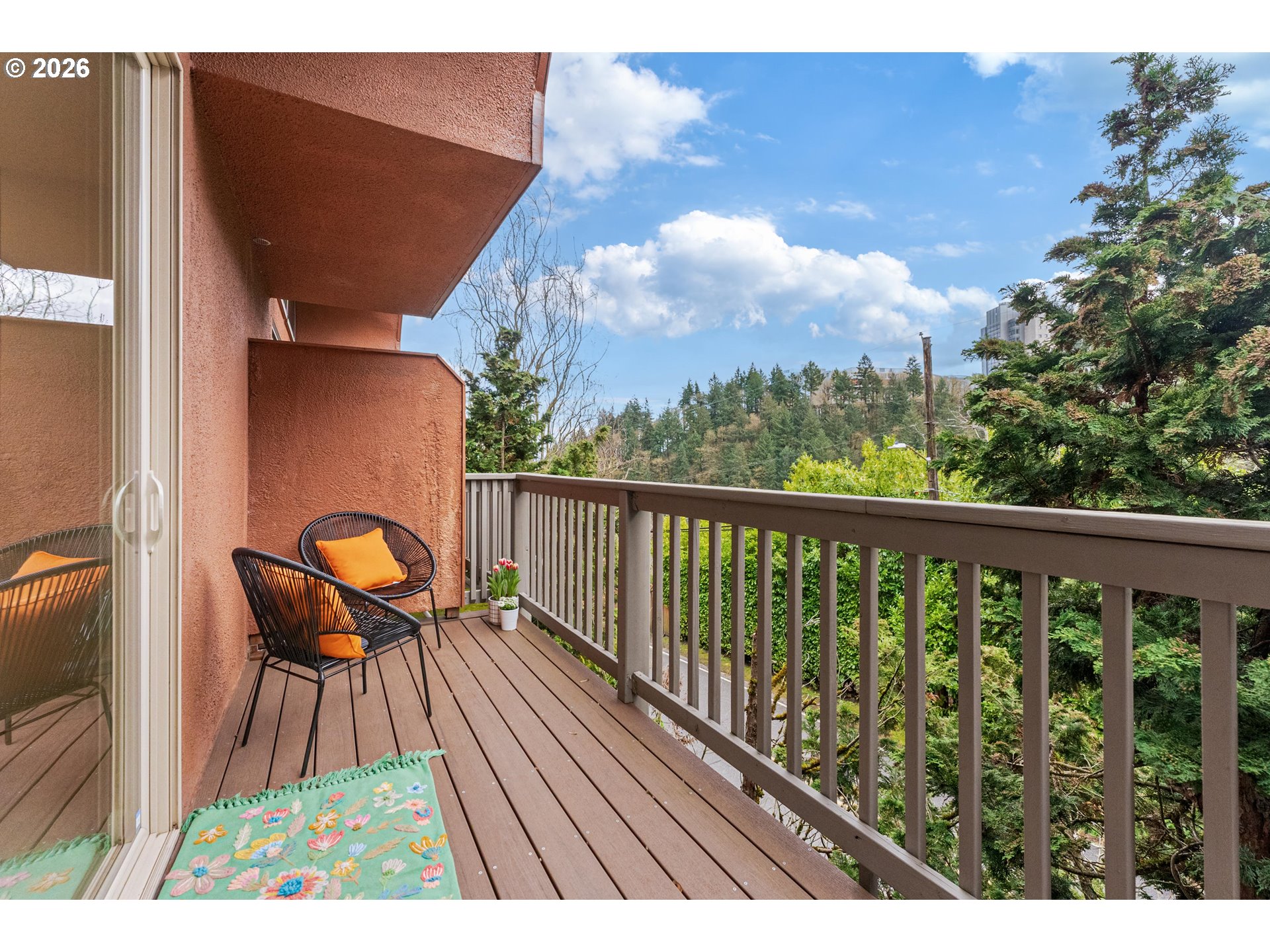 Nestled just up the hill from downtown and perched along the tree lines, this corner unit features a floor to ceiling sliding glass door, leading to a private deck, that provides an abundance of natural light while framing a picturesque view of Portland’s natural beauty. When stepping inside, you will also discover an amazing, curved cathedral ceiling that sets the unit apart from your everyday standard condo while making the living area feel open and spacious. On a rainy day, you’ll be able to curl up by the wood fireplace or take a soak in the extra-large custom bathtub to decompress after a long week while enjoying the remodeled bathroom. As extra perks, the unit has a separate office and/or laundry room, beautiful hardwood floors throughout, a built-in surround sound system, and a brand new Trane central heat & air conditioning system with a transferable 10-year warranty. The kitchen is equipped with contemporary finishes including stainless steel appliances, quartz countertops, and a reverse osmosis water filtration system providing the purest water straight from the tap. Avoid parking woes and enjoy the convenience of a reserved covered parking space, ample guest parking, and low monthly HOA dues. Conveniently located on the outskirts of downtown but near PSU, OHSU, and NUNM, which provides for a quick commute to school or work yet away from the hustle and bustle of downtown living. Move in today!