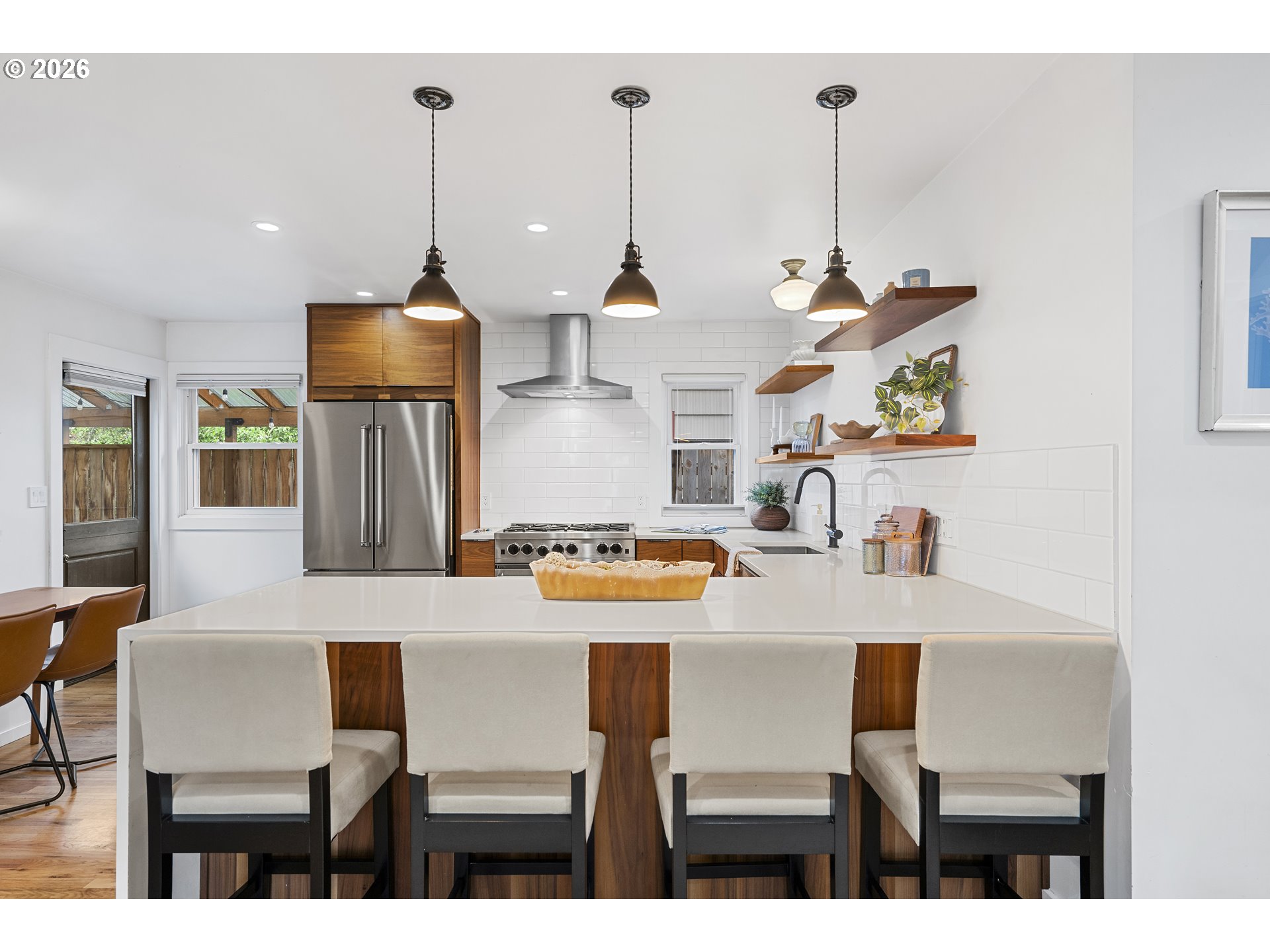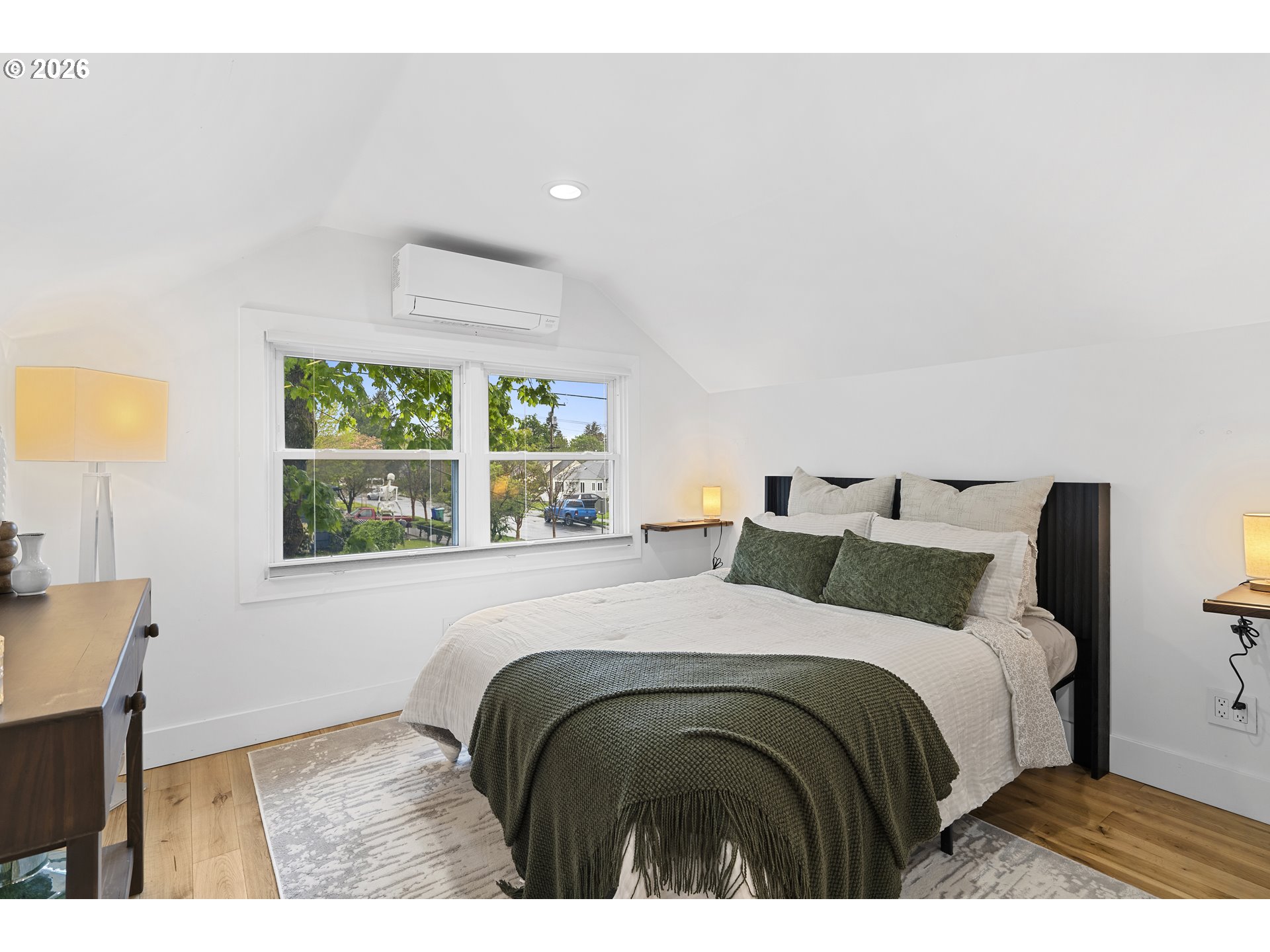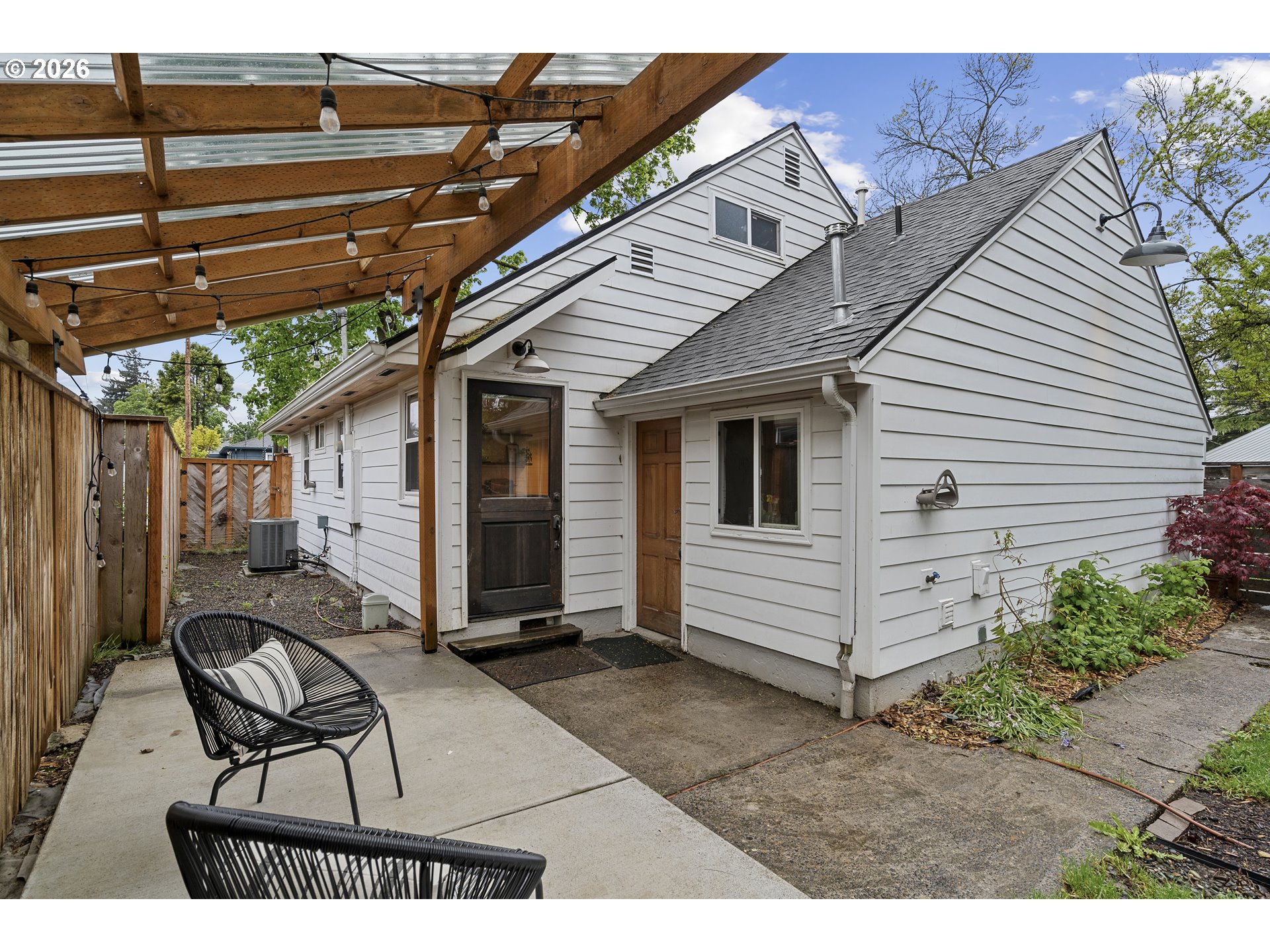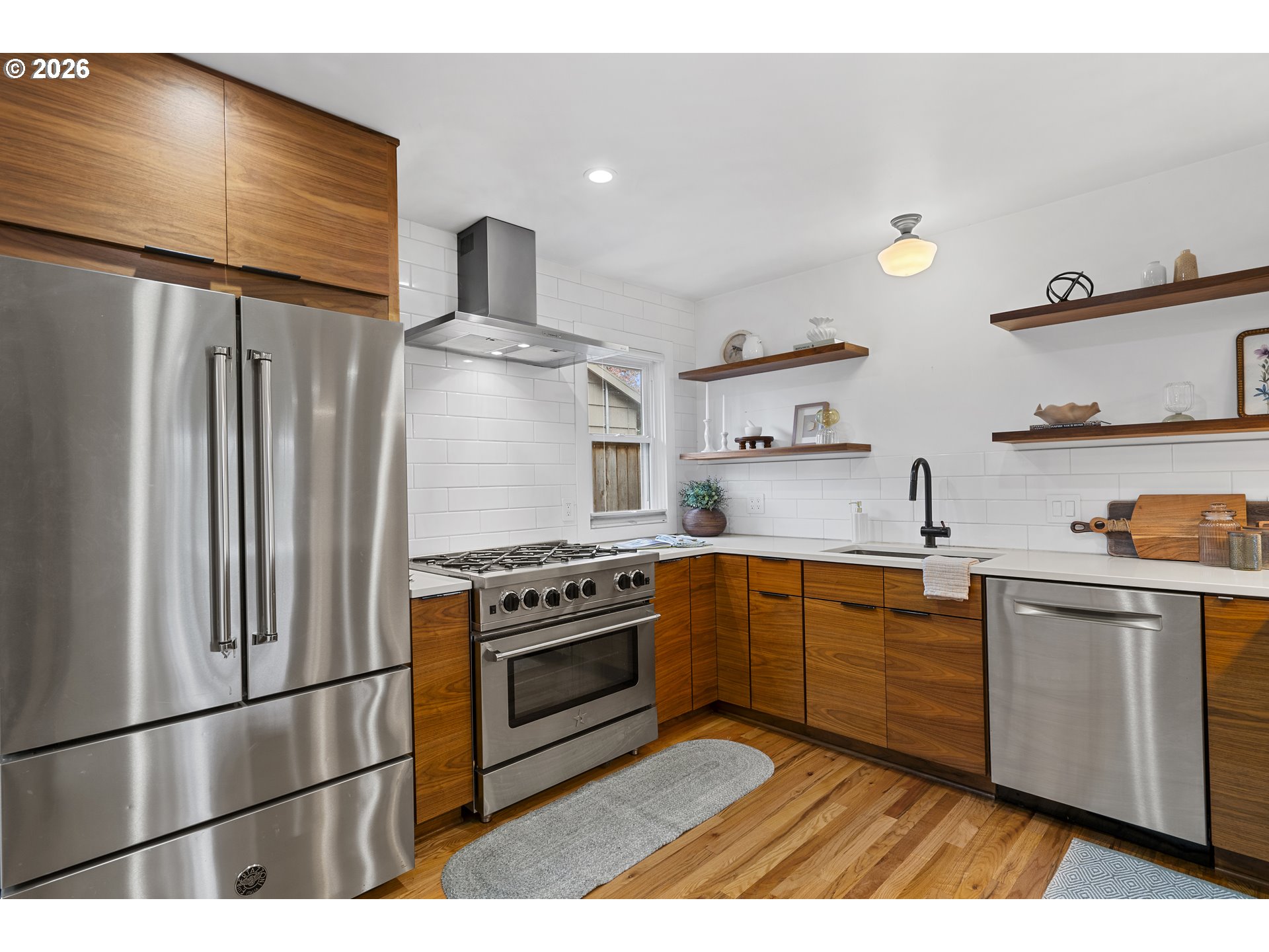 Completely dialed mid-century home in the heart of Montavilla, blending character with thoughtful updates and comfortable living. Just move in! Light-filled spaces and a functional, open layout create an easy flow between the living, dining, and kitchen — ideal for both everyday life and entertaining. The kitchen is tricked out with high end appliances, Rejuvenation hardware, and sleek open shelving. Casual dining on the countertops or cute dining nook. Hardwood floors run throughout the main floor, which also features two bedrooms and an updated bathroom. Top bottom blinds throughout the home make it easy to balance natural light and privacy. Upstairs, the spacious primary suite offers a true retreat, complete with a new mini-split system for efficient heating and cooling and a well-appointed ensuite bath. Step outside to an oversized, private corner yard with neat landscaping, a covered patio for year-round enjoyment, custom fencing, and a detached shed. Located just blocks from neighborhood favorites, dining, and transit, with close proximity to Berrydale Park for easy access to green space and recreation. Check it out! [Home Energy Score = 3. HES Report at https://rpt.greenbuildingregistry.com/hes/OR10209771]