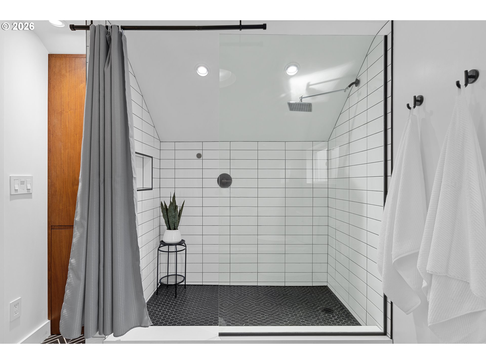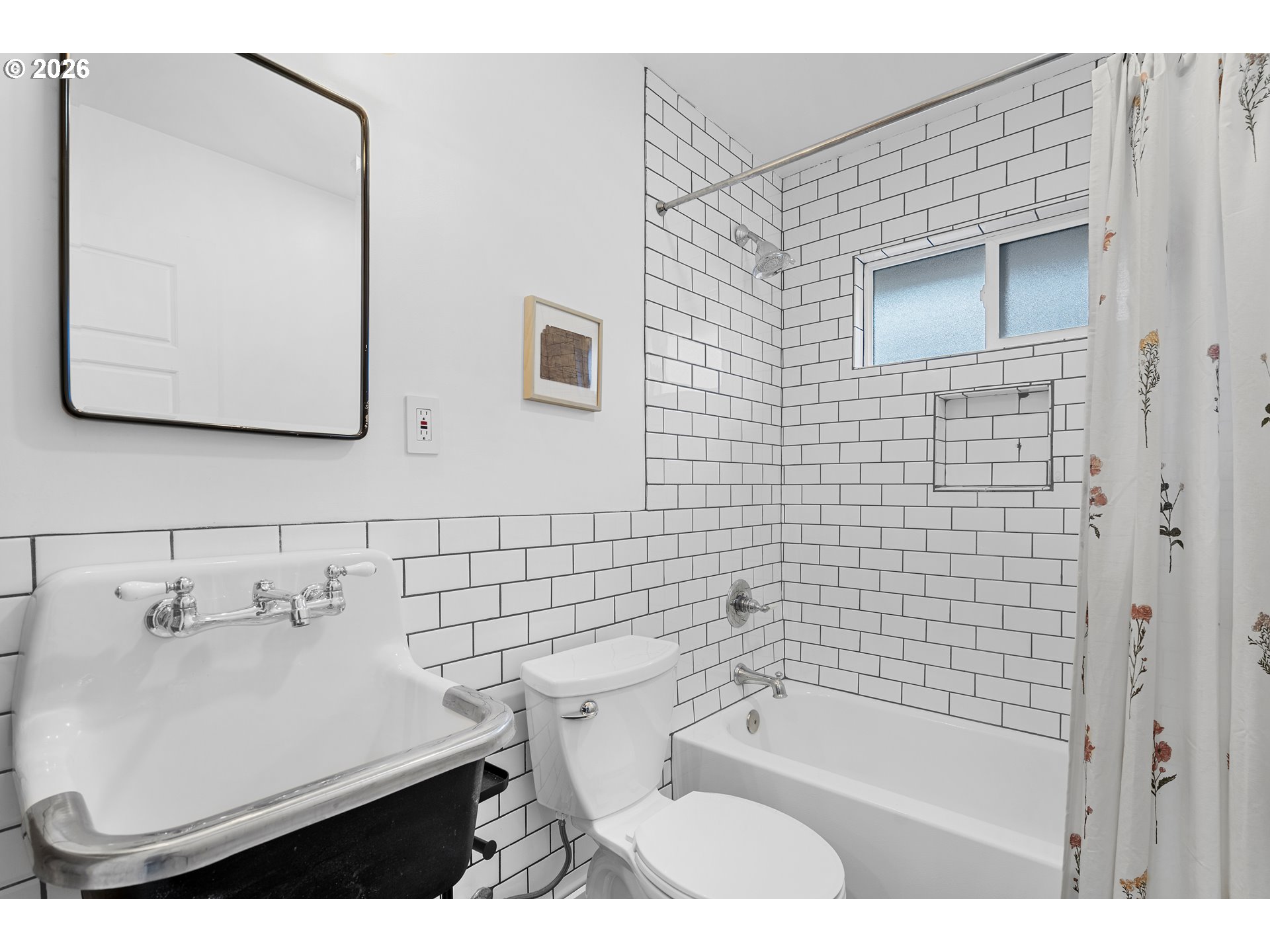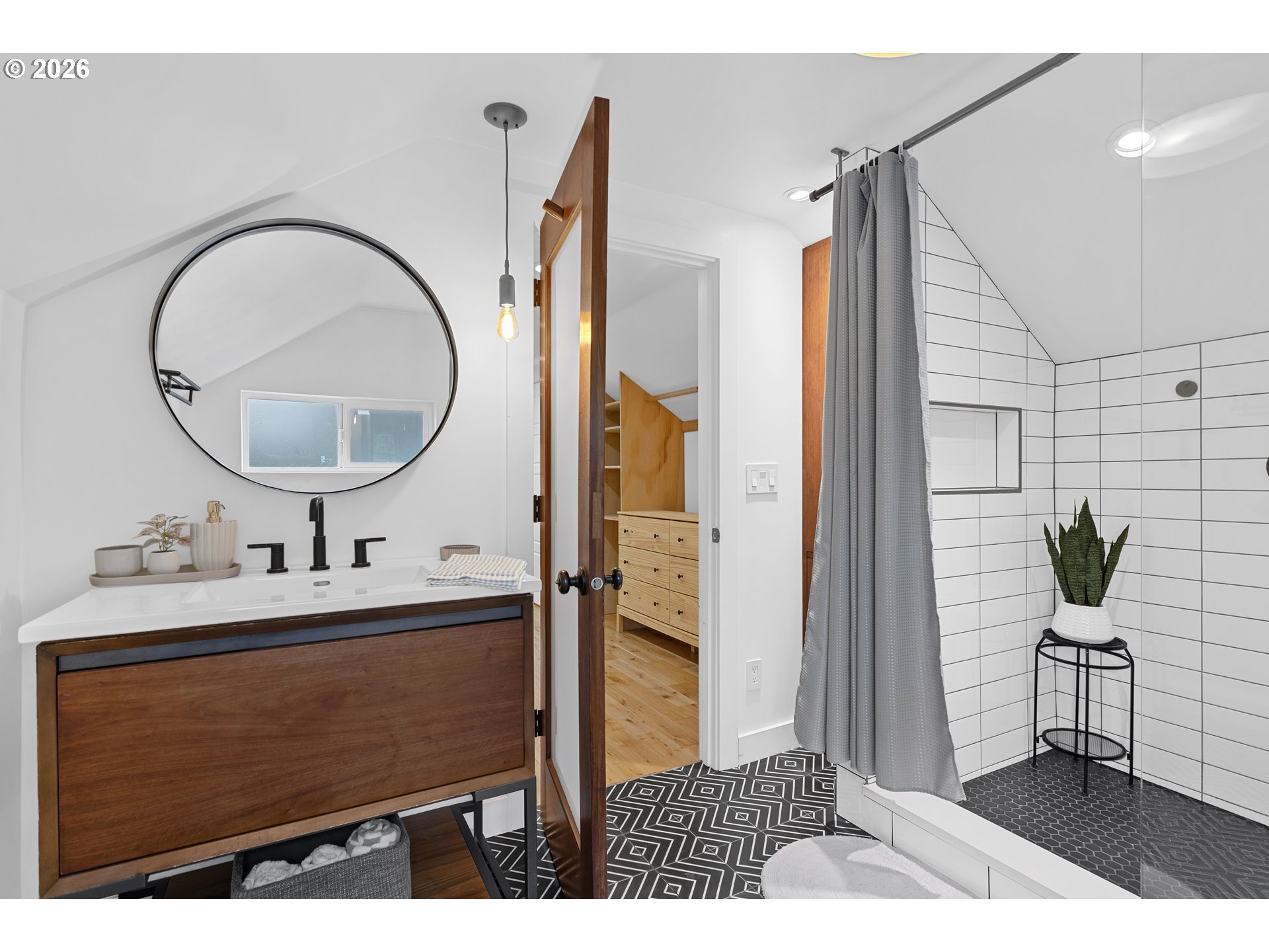 Completely dialed mid-century home in the heart of Montavilla, blending character with thoughtful updates and comfortable living. Just move in! Light-filled spaces and a functional, open layout create an easy flow between the living, dining, and kitchen — ideal for both everyday life and entertaining. The kitchen is tricked out with high end appliances, Rejuvenation hardware, and sleek open shelving. Casual dining on the countertops or cute dining nook. Hardwood floors run throughout the main floor, which also features two bedrooms and an updated bathroom. Top bottom blinds throughout the home make it easy to balance natural light and privacy. Upstairs, the spacious primary suite offers a true retreat, complete with a new mini-split system for efficient heating and cooling and a well-appointed ensuite bath. Step outside to an oversized, private corner yard with neat landscaping, a covered patio for year-round enjoyment, custom fencing, and a detached shed. Located just blocks from neighborhood favorites, dining, and transit, with close proximity to Berrydale Park for easy access to green space and recreation. Check it out! [Home Energy Score = 3. HES Report at https://rpt.greenbuildingregistry.com/hes/OR10209771]