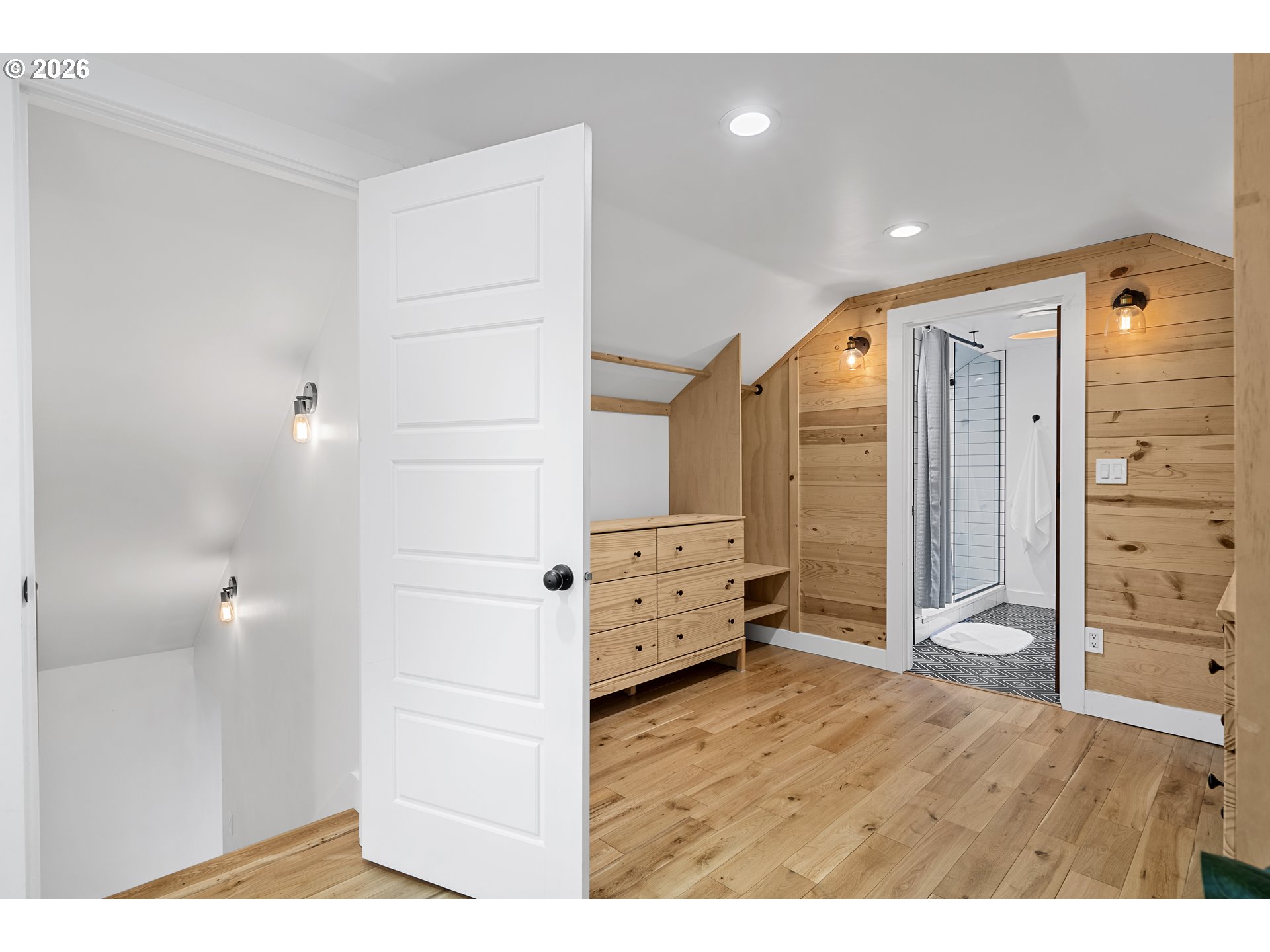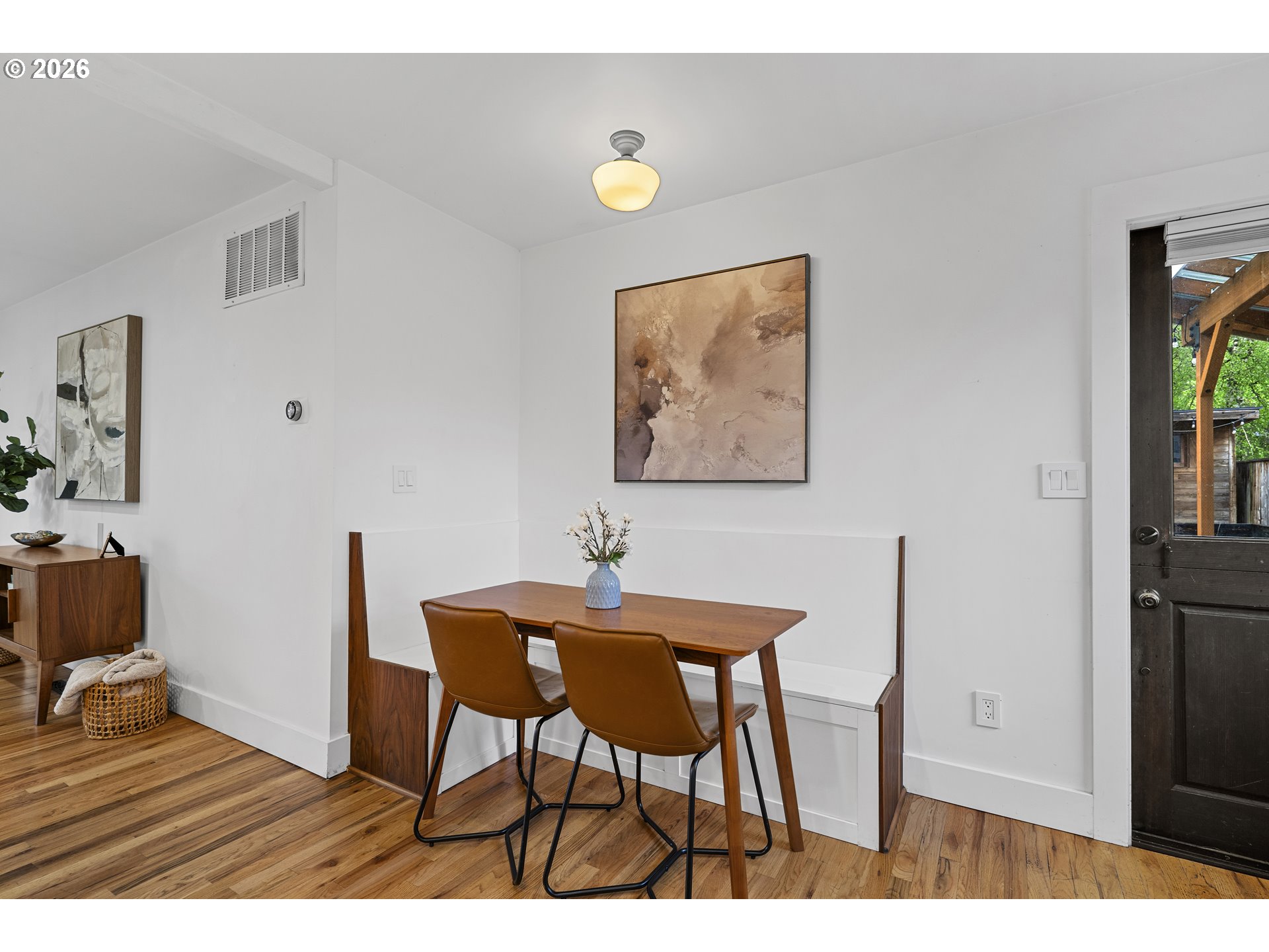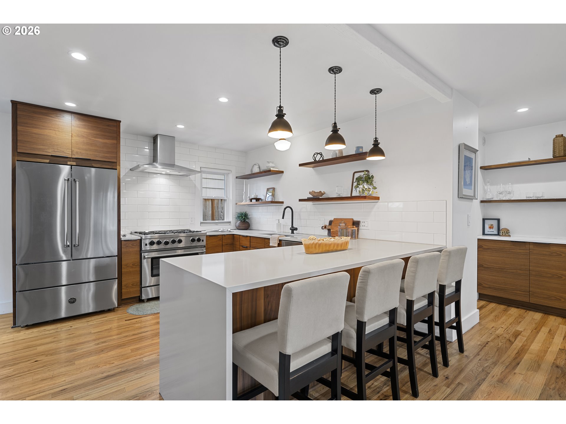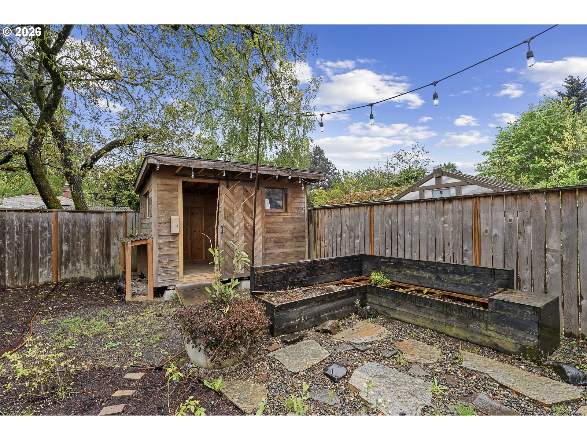 Completely dialed mid-century home in the heart of Montavilla, blending character with thoughtful updates and comfortable living. Just move in! Light-filled spaces and a functional, open layout create an easy flow between the living, dining, and kitchen — ideal for both everyday life and entertaining. The kitchen is tricked out with high end appliances, Rejuvenation hardware, and sleek open shelving. Casual dining on the countertops or cute dining nook. Hardwood floors run throughout the main floor, which also features two bedrooms and an updated bathroom. Top bottom blinds throughout the home make it easy to balance natural light and privacy. Upstairs, the spacious primary suite offers a true retreat, complete with a new mini-split system for efficient heating and cooling and a well-appointed ensuite bath. Step outside to an oversized, private corner yard with neat landscaping, a covered patio for year-round enjoyment, custom fencing, and a detached shed. Located just blocks from neighborhood favorites, dining, and transit, with close proximity to Berrydale Park for easy access to green space and recreation. Check it out! [Home Energy Score = 3. HES Report at https://rpt.greenbuildingregistry.com/hes/OR10209771]
