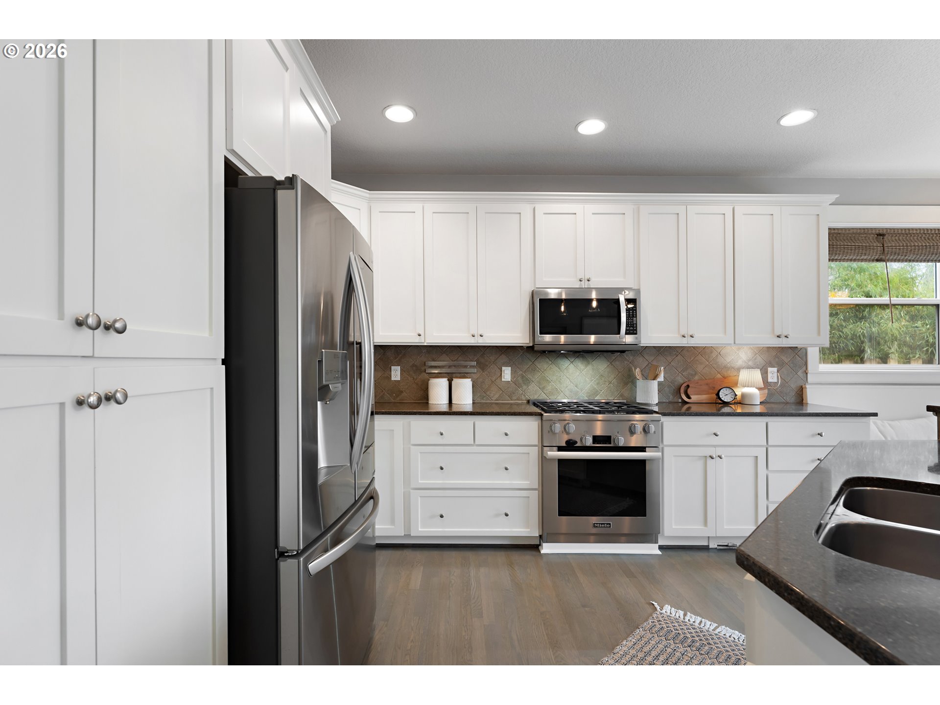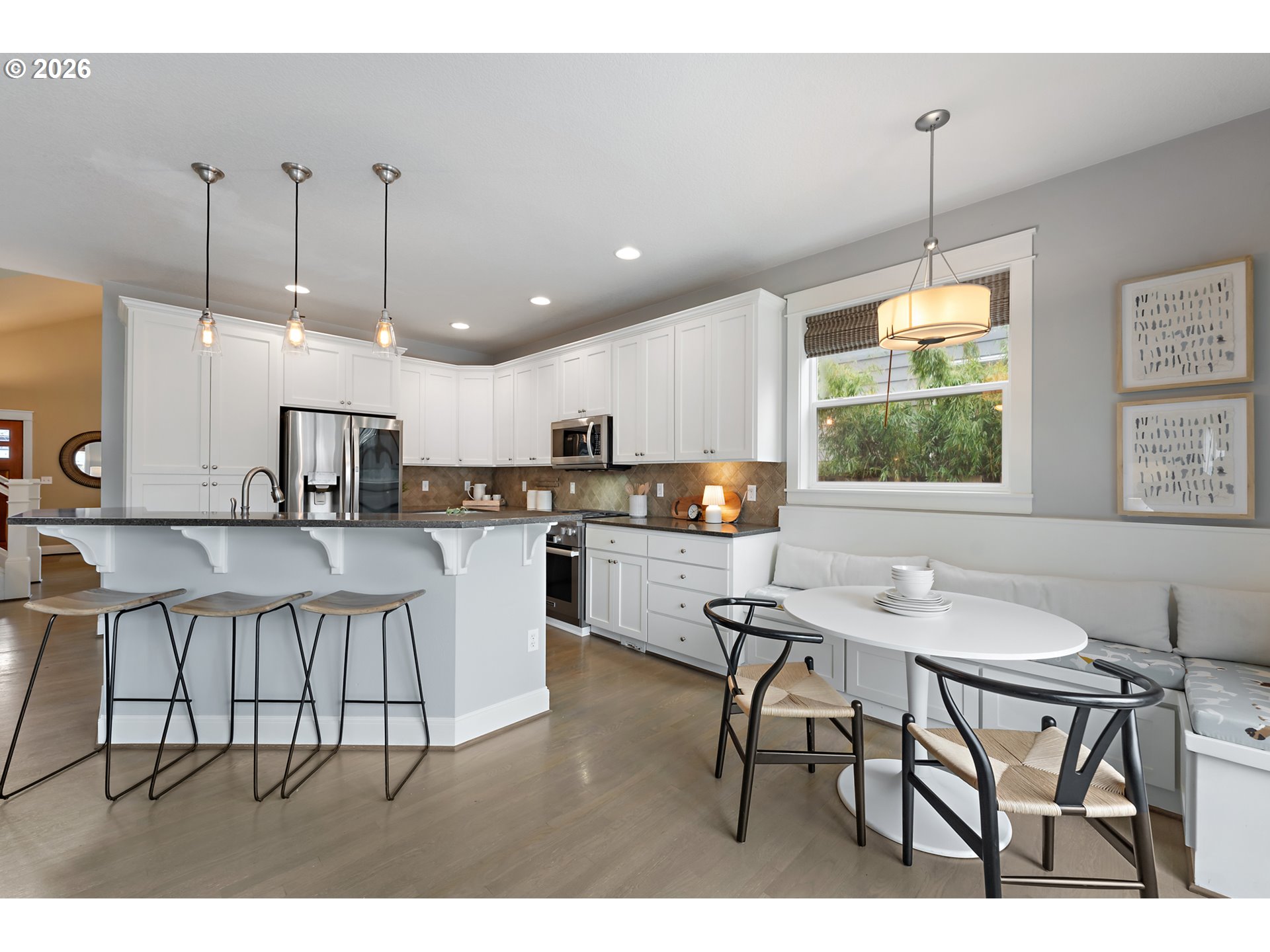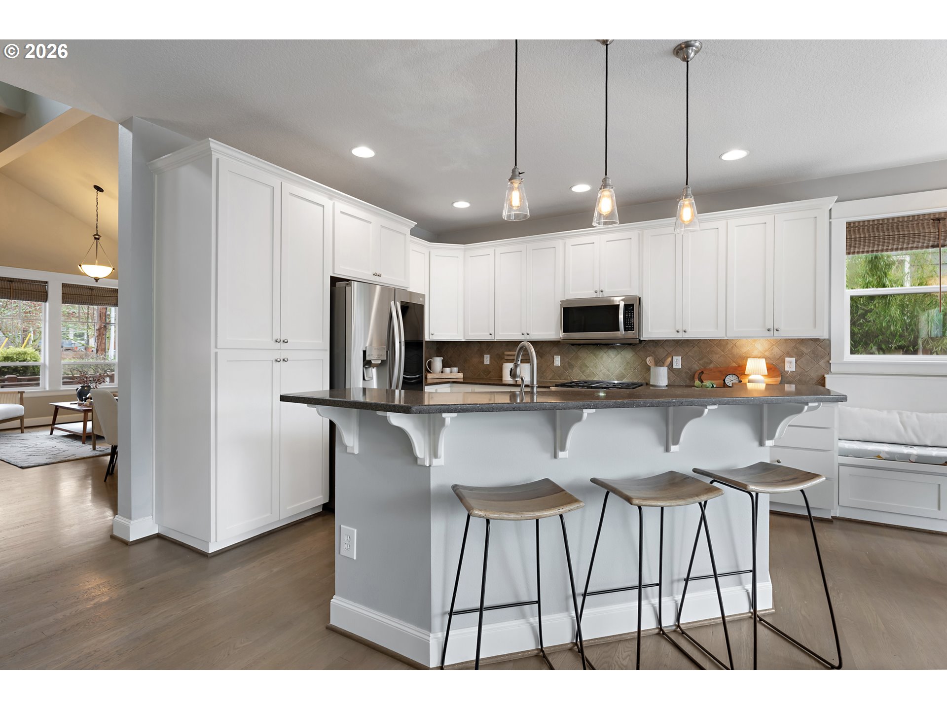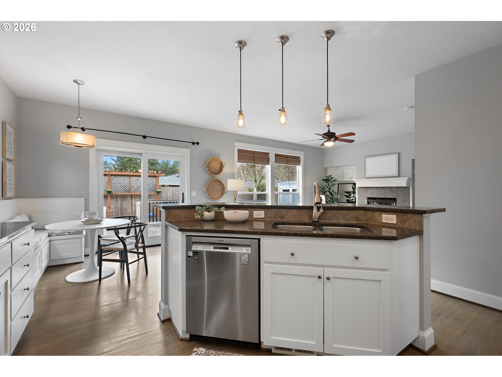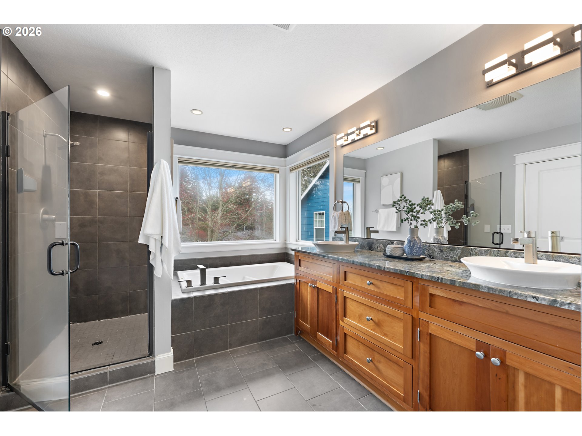 Location & style! Arrive home with pride of homeownership due to the lovely curb appeal, two-car garage (with EV charger), & front porch swing. Inside, this spacious floor plan has a zone for all your needs. Entry with large, open living/dining, open stairwell, & vaulted ceilings. Bright kitchen with all new appliances, quartz countertops, eat-at island, & breakfast banquette. Family room with gas fireplace & built-ins. Wood floors throughout primary living space on main level. Full bath & bedroom on main. Upper level has 3 bedrooms & bonus room. Primary bath with soak tub, double sinks, shower, & large WI closet. The approaching spring & summer will be a delight with the amazing backyard remodel. New Trex deck with built-in bench & lighting. Paver patio, privacy pergola, & updated landscaping. New fence divides the yard for enclosed doggo playtime. Custom built Tuff shed included. Irrigation system added to front and backyard. Garage has new window, storage, & heat system installed - a perfect space to tackle your projects & hobbies. Central Vac system, A/C, & custom blinds throughout. Walk down the block to playground, field, & track. Minutes to Multnomah Village. Welcome home! Open Sat & Sun, 1-3 pm. [Home Energy Score = 4. HES Report at https://rpt.greenbuildingregistry.com/hes/OR10245316]