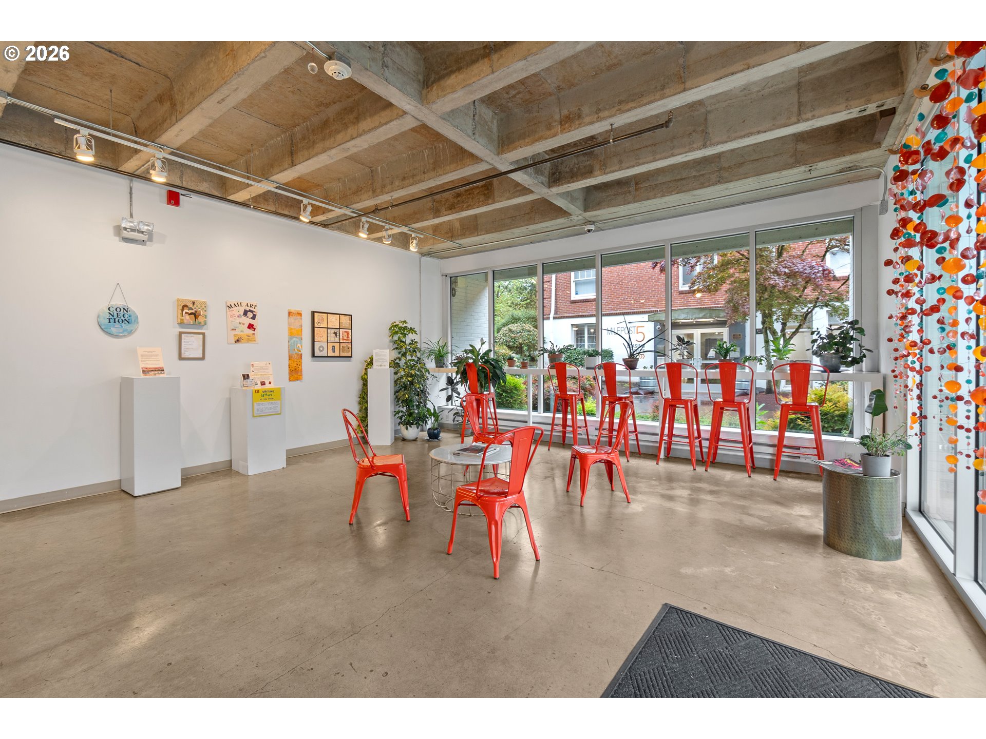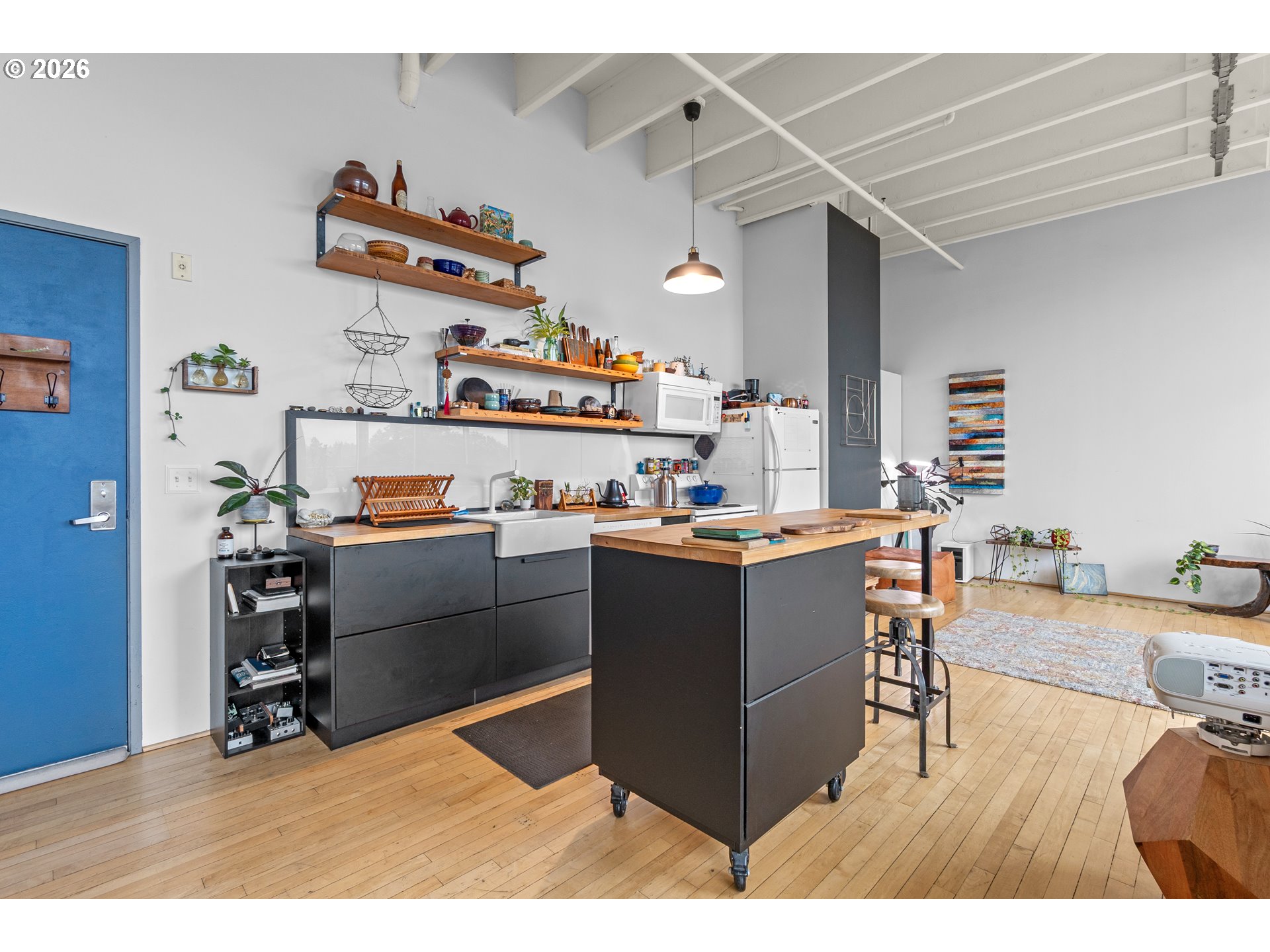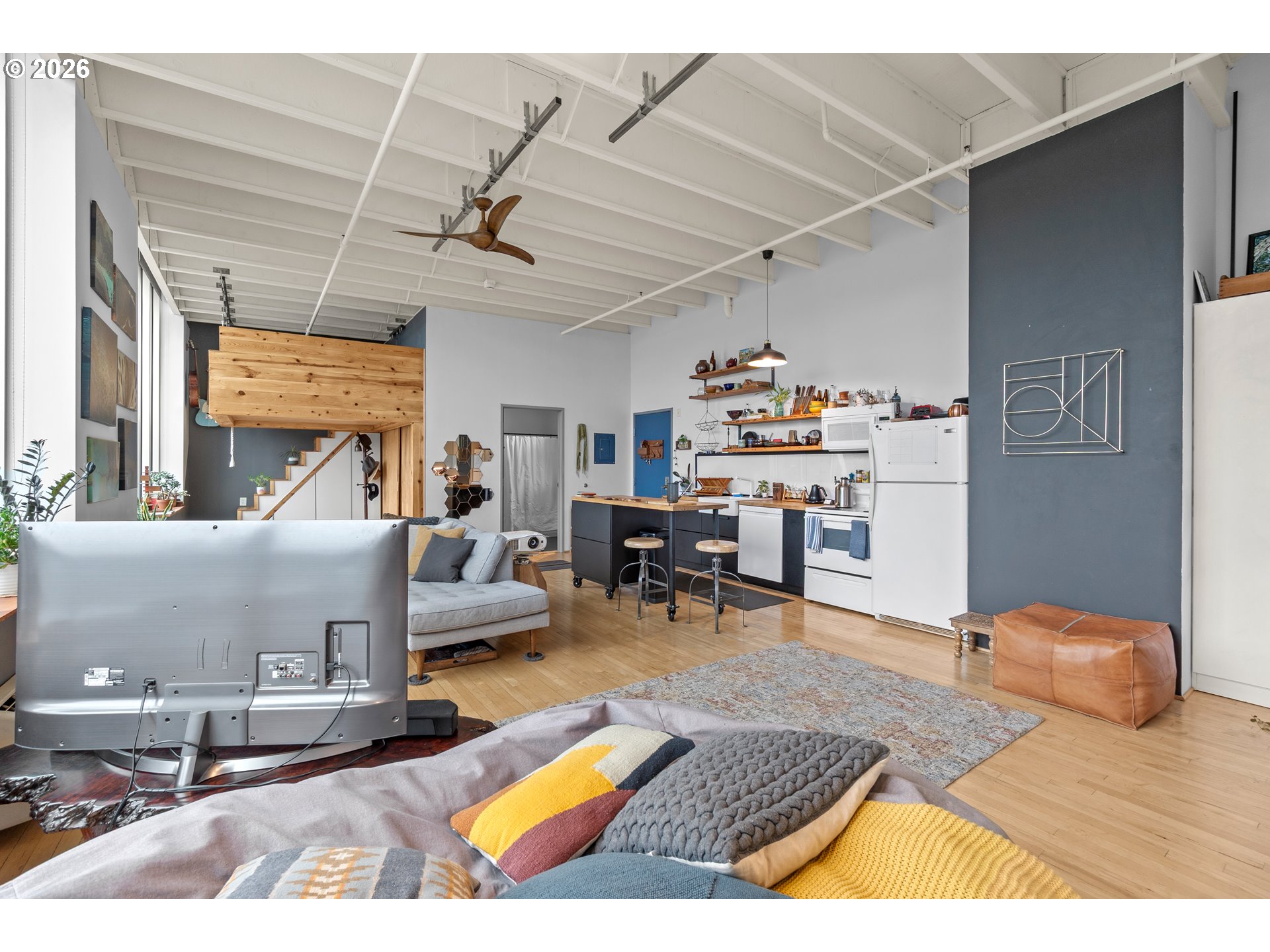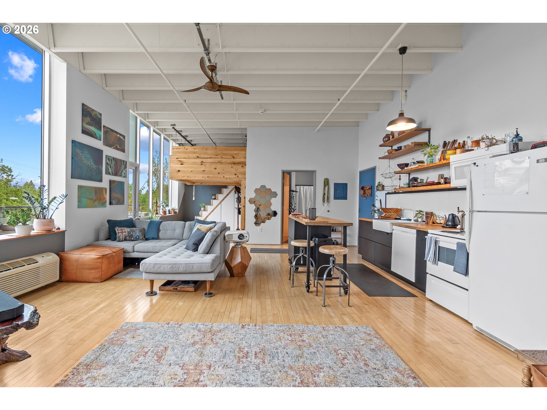 Penthouse-style loft living at Milepost 5—bright, modern, and full of character. This top-floor open-concept loft showcases floor-to-ceiling windows that fill the space with natural light, 12-ft ceilings with exposed concrete beams, and reclaimed wood floors that add warmth and texture. A private sleeping loft creates separation and flexibility, while the full bathroom includes a bathtub for rare condo comfort. The kitchen features custom cabinetry, butcher-block counters, and a sunny layout perfect for cooking or entertaining. Enjoy fresh air on your private balcony with alpenglow views, plus the convenience of in-unit laundry and deeded storage. The building offers unique community amenities including galleries, gardens, shared decks, and creative common spaces. Located in the vibrant Montavilla neighborhood—known for its restaurants, shopping, cafés, and popular farmers market—this loft blends artistic energy with everyday convenience. See virtual tour links for more information!