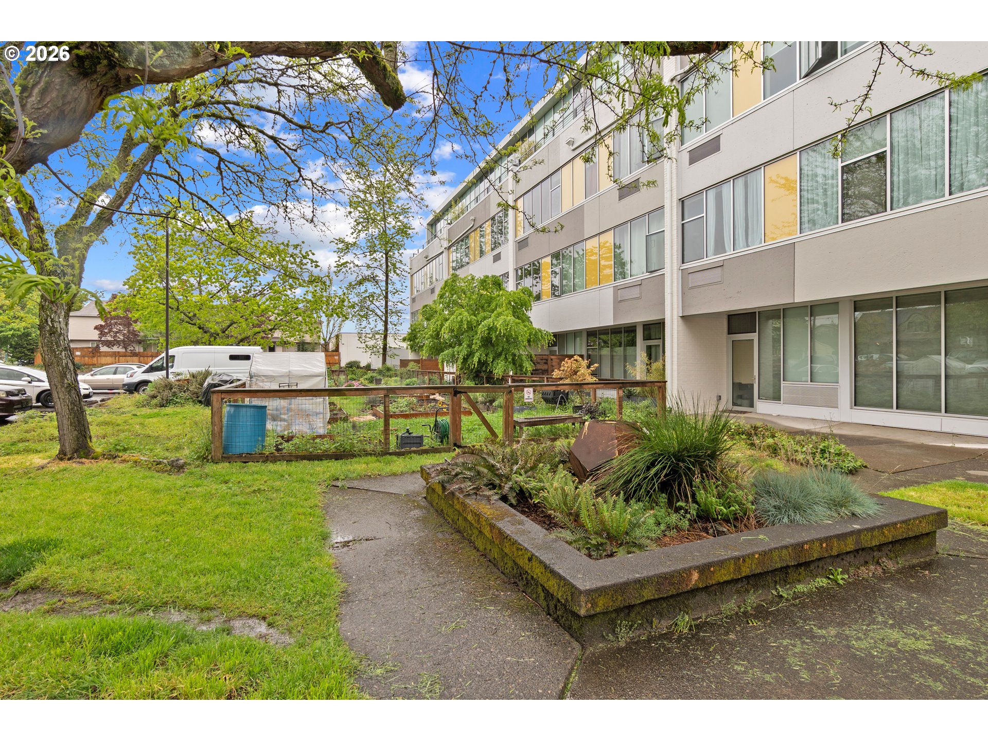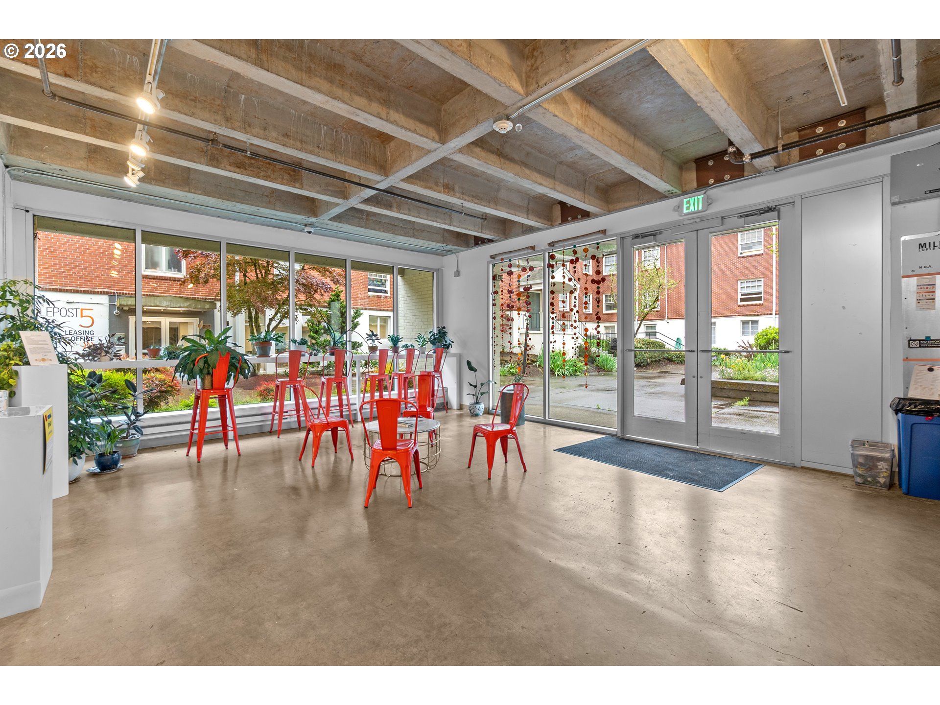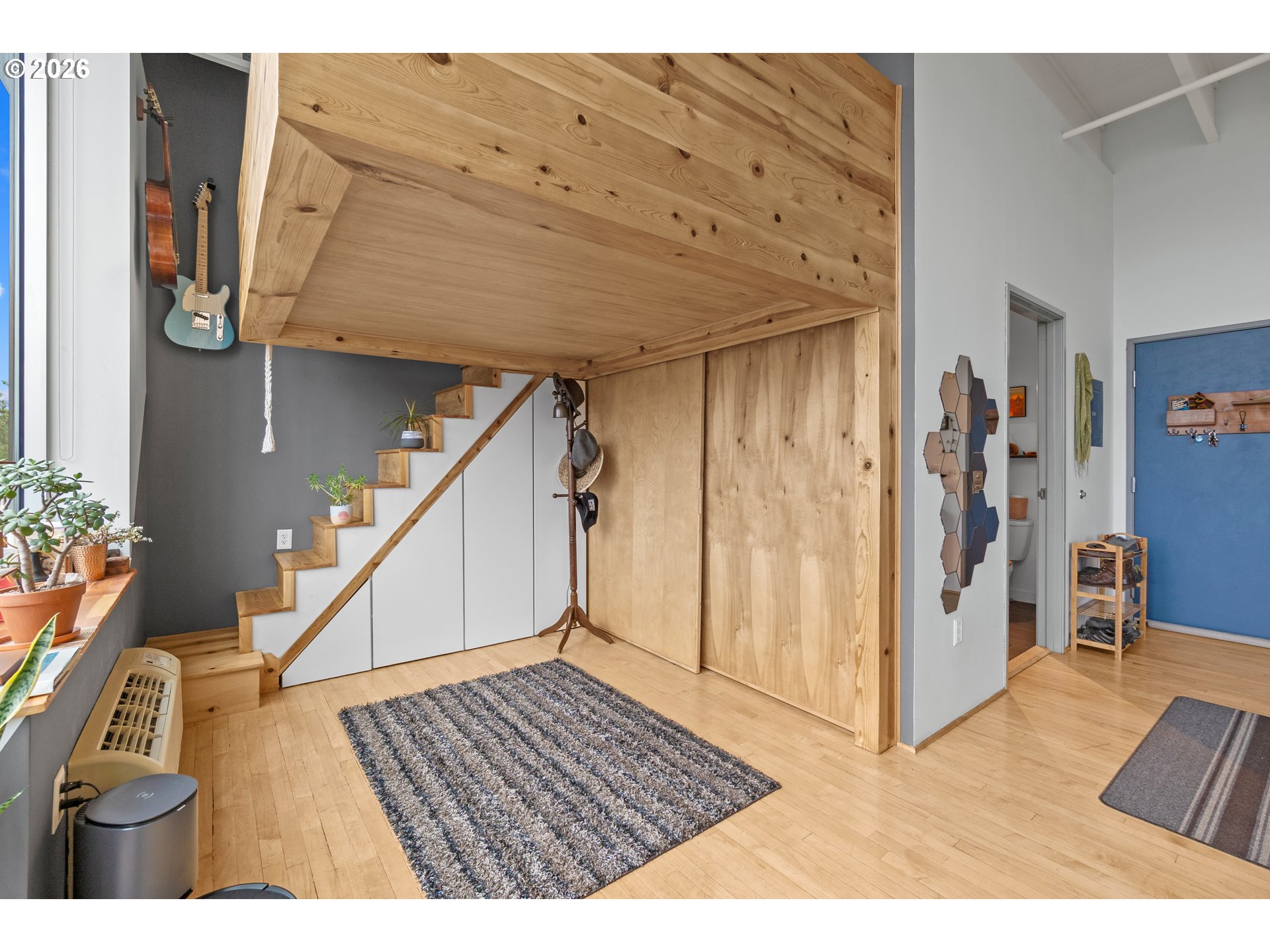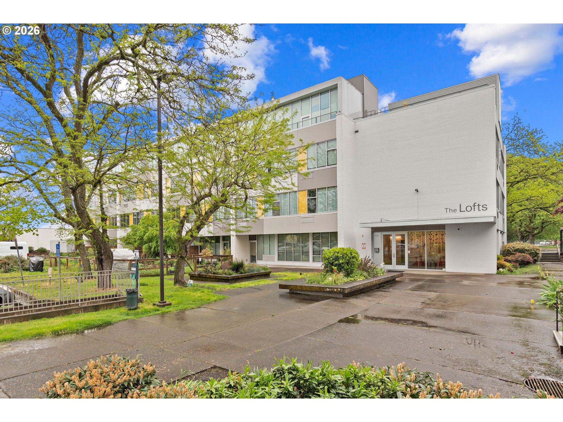 Penthouse-style loft living at Milepost 5—bright, modern, and full of character. This top-floor open-concept loft showcases floor-to-ceiling windows that fill the space with natural light, 12-ft ceilings with exposed concrete beams, and reclaimed wood floors that add warmth and texture. A private sleeping loft creates separation and flexibility, while the full bathroom includes a bathtub for rare condo comfort. The kitchen features custom cabinetry, butcher-block counters, and a sunny layout perfect for cooking or entertaining. Enjoy fresh air on your private balcony with alpenglow views, plus the convenience of in-unit laundry and deeded storage. The building offers unique community amenities including galleries, gardens, shared decks, and creative common spaces. Located in the vibrant Montavilla neighborhood—known for its restaurants, shopping, cafés, and popular farmers market—this loft blends artistic energy with everyday convenience. See virtual tour links for more information!