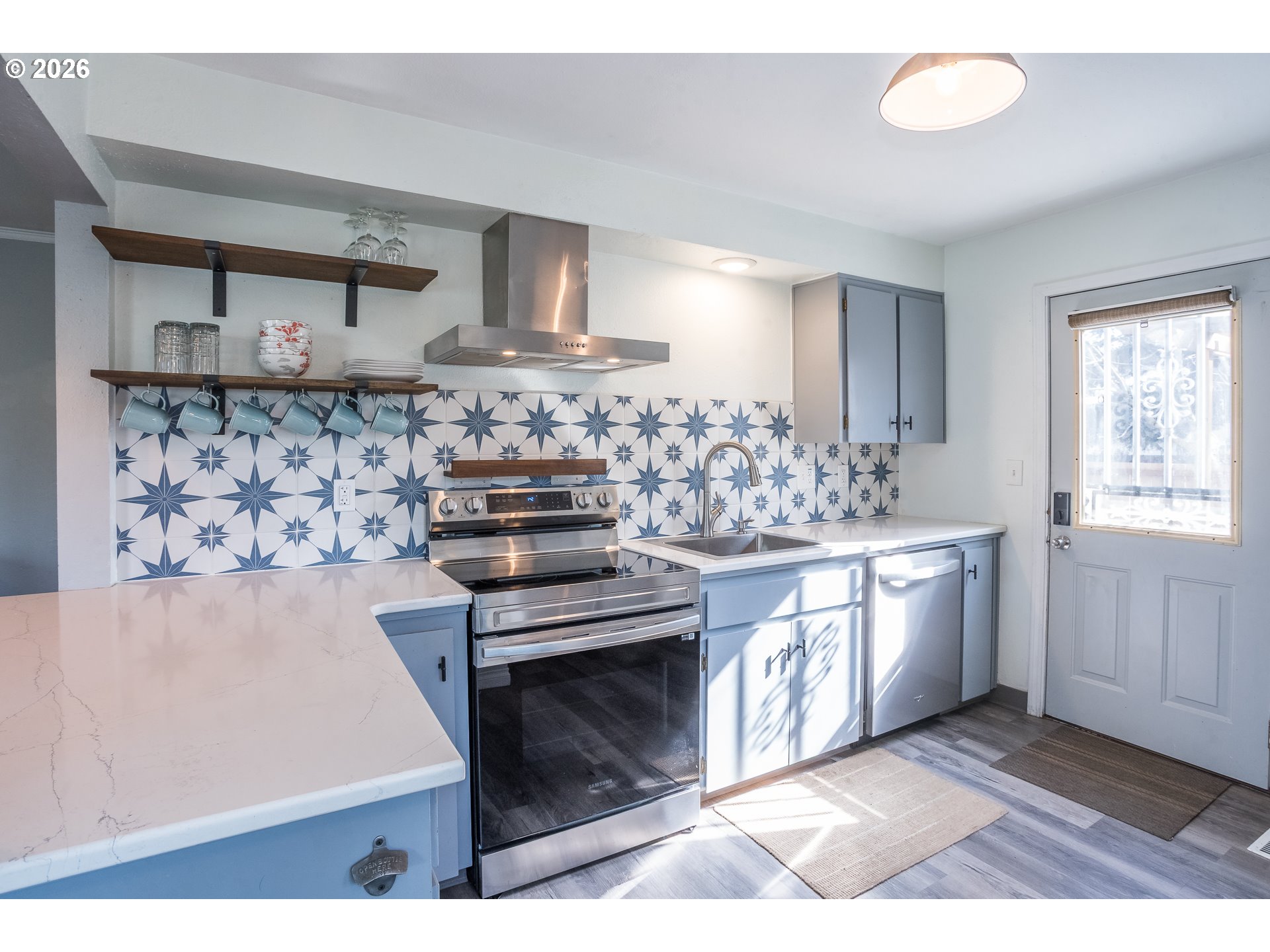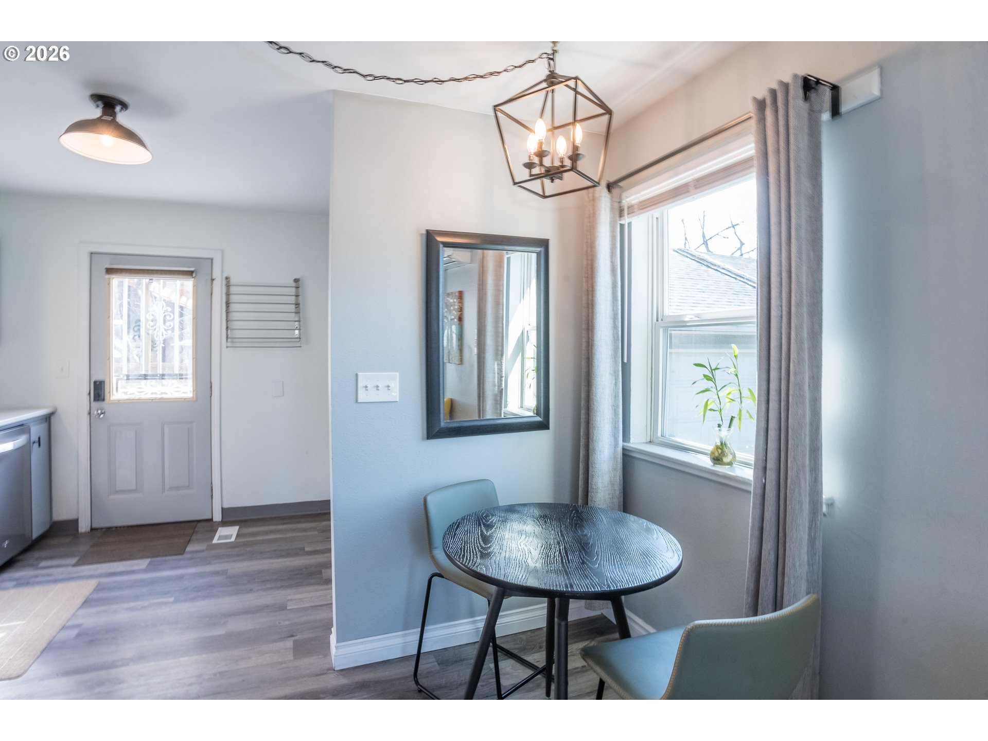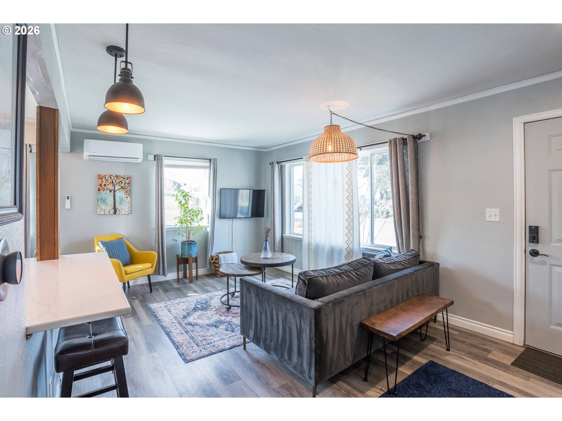 Small but mighty, this thoughtfully upgraded bungalow offers comfort, efficiency, and peace of mind. Earning a perfect 10/10 Home Energy Score, the home reflects careful updates including extensive electrical upgrades with a new panel and subpanels for the house and garage. Solar panels added in December of 2022, insulation blown into all exterior walls, a tankless hot water heater, minisplit system, and newer appliances including a dishwasher, range with hood, and washer/dryer support easy, sustainable living. Additional updates include a remodeled kitchen with quartz countertops, an earthquake retrofit, active radon mitigation system, and a newly built covered back patio with a built-in bench. Set back from the street, the home enjoys a private front yard and an efficient layout. The kitchen offers space for dining and countertop seating, opening to a warm and welcoming living room. Two bedrooms are tucked toward the back for privacy, with a centrally located full bathroom. Enjoy year-round outdoor living on the covered patio, plus RV parking with a 30-amp hookup. A detached two-car garage provides space for parking, storage, or projects. Conveniently located near parks, transit, and neighborhood amenities—come see how easily you could make yourself at home here. [Home Energy Score = 10. HES Report at https://rpt.greenbuildingregistry.com/hes/OR10087035]