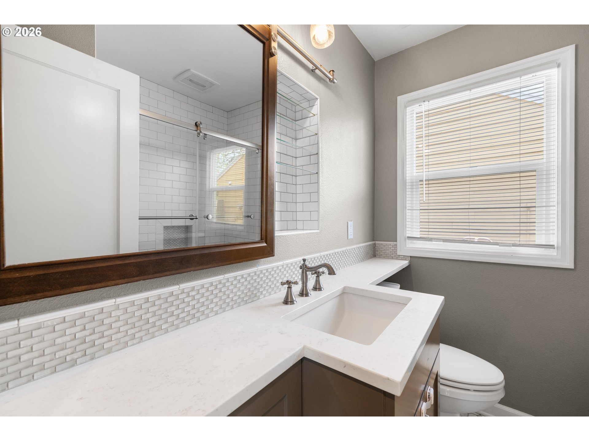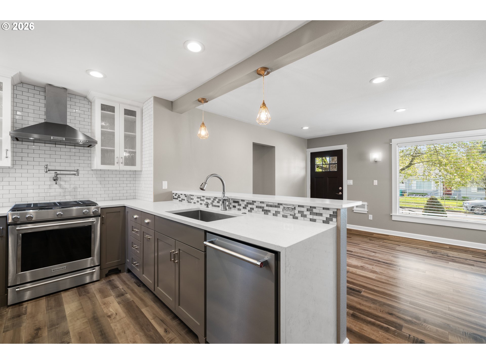 This beautifully and thoughtfully updated home is truly move-in ready. Updates include a new roof, new furnace and mini-split system, new windows, fresh paint interior/exterior. Updated flooring throughout. The kitchen has quartz countertops, tile backsplash, abundance of storage with soft-close cabinetry, and even a convenient pot filler. The home features two bedrooms, with the second offering an impressive loft area that adds flexible living or storage space. The bathroom has also been tastefully updated with a new shower, tile work, sink, and smart storage solutions. The garage has been used as a versatile bonus space with a laundry area, along with additional clever storage accessed by ladder. It can easily be converted back into a traditional garage; there is a garage door opener in place. Outside, you’ll find a fully fenced yard with raised garden beds, a play area, and a detached office/studio complete with electricity and heating—perfect for remote work or creative use. Conveniently located by updated Berrydale Park and Community Gardens. Enjoy the easy access to shopping, freeway and schools - this home offers both comfort and practicality in a great location. This really is a MUST see to appreciate. OPEN HOUSE SATURDAY 5/2/2026 from 11-1 [Home Energy Score = 10. HES Report at https://rpt.greenbuildingregistry.com/hes/OR10247687]